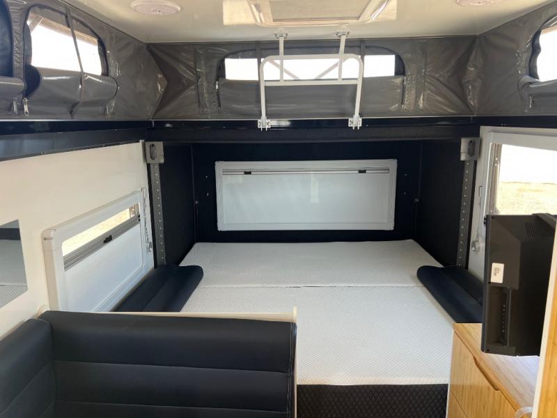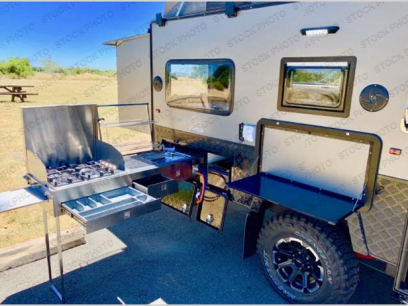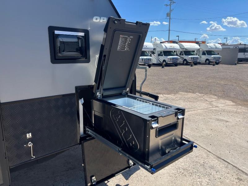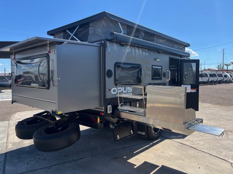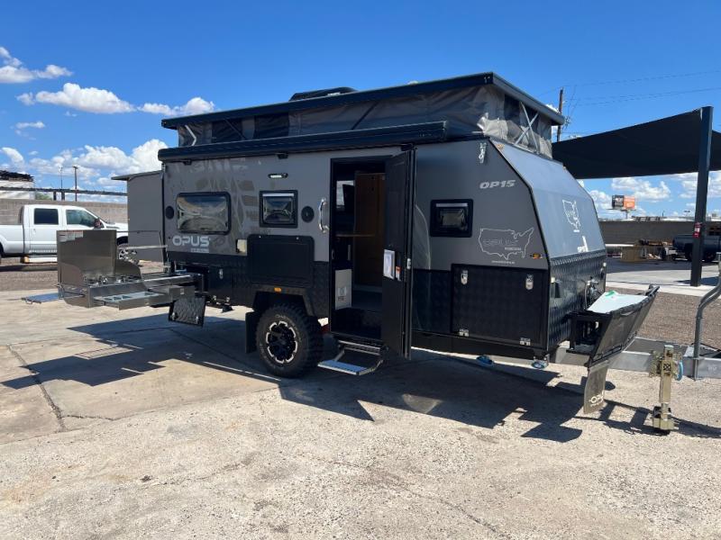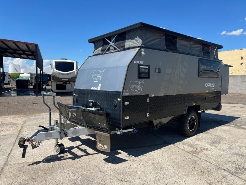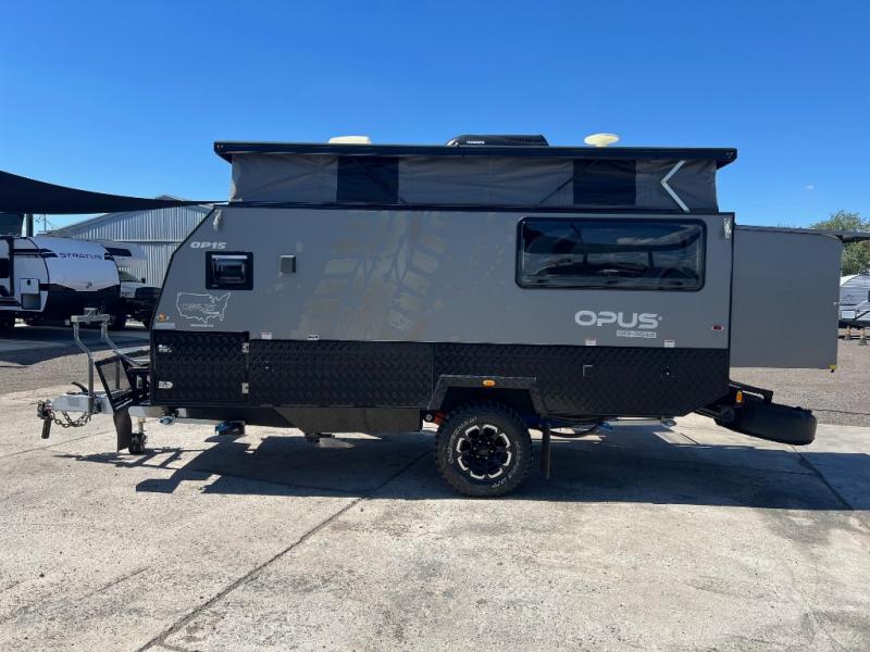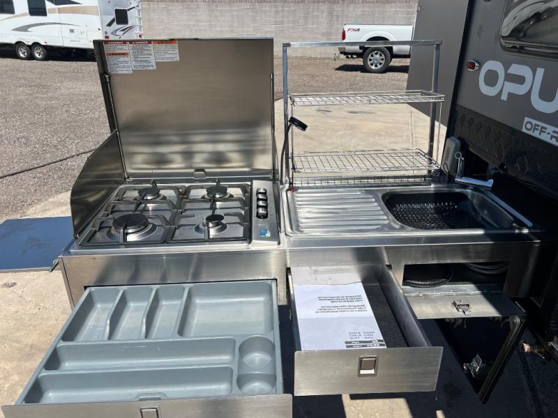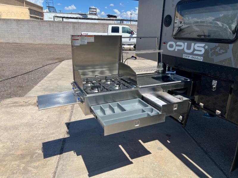 OFF-ROAD READY- Independent trailing arm coil suspension with dual shock absorbers- Lock’n’Roll articulating hitch with 360* rotation for flexible towing- 2 all-terrain tires, 2 spares, alloy wheels & spare (265/75r/16 mud tires)- Fully galvanized & welded chassis & drawbar- Stone guard & underbody anti-chip protection with diamond plating- 4x drop down heavy duty stabilizer legs & fulton tongue jack wheel- 4-burner stainless steel stove slide-out stove- Stainless steel wind guards, chopping board and prep deck- LED outdoor lights, storage and pantry access- 12v fridge/freezer combo - Permanently connect water lines REENGINEERED Suspension for increased durability The OP15 off-road suspension just got even tougher! OPUS increased the size of the gas Struts and positioned these vertically (instead of diagonally) to remove the wear on your Gas Struts interior gaskets. OPUS has also increased the size of the springs to allow for even heavier duty off-road towing. - 3 x 100ah AGM batteries- 300-watt solar panel setup - 2 x Fresh Water Tanks totaling 63 Gallons- 18 gallon Grey Water Tank- 10 gallon Black Water Tank- Utility Storage w/ 6 Gallon Jerry Can Holders- Dual 20 lb. Gas Bottle Holders