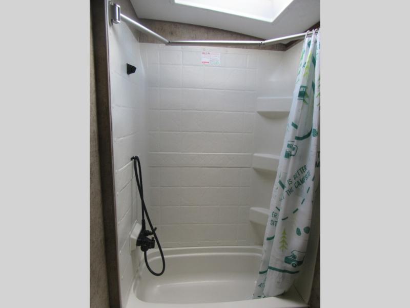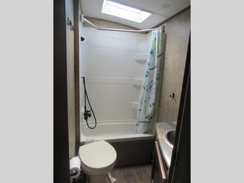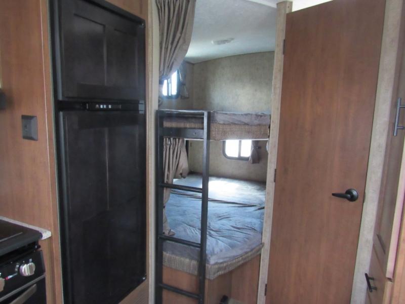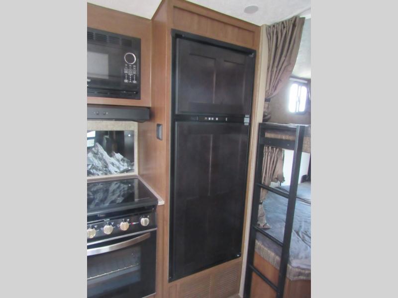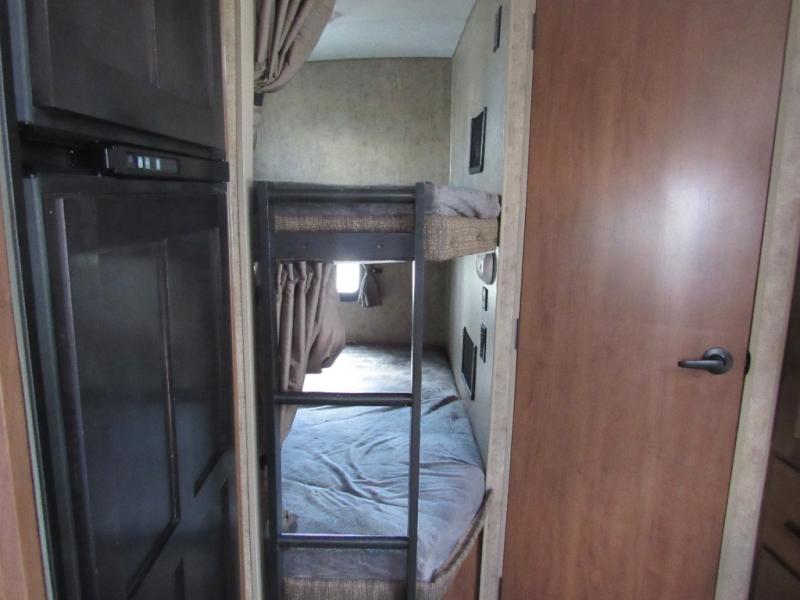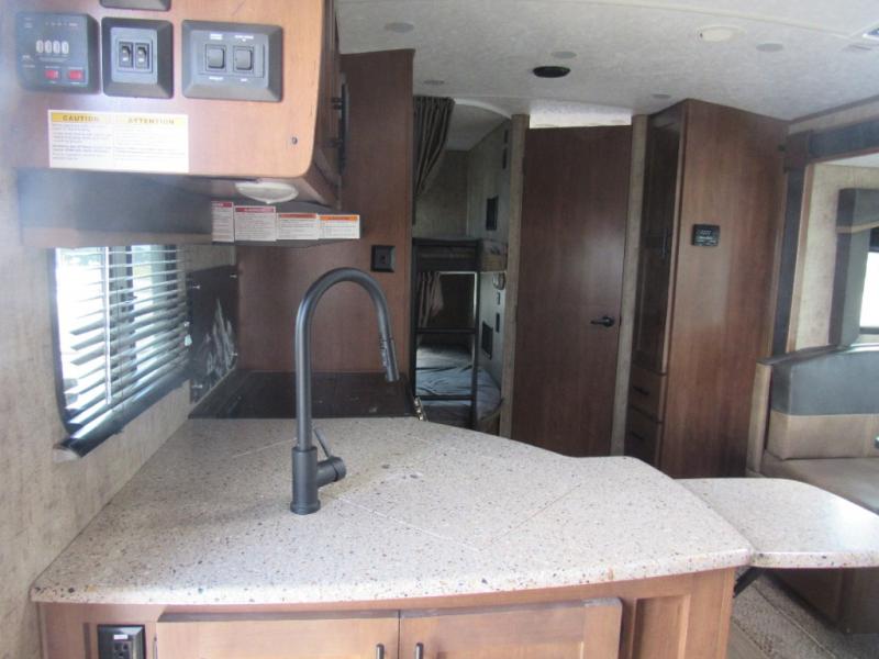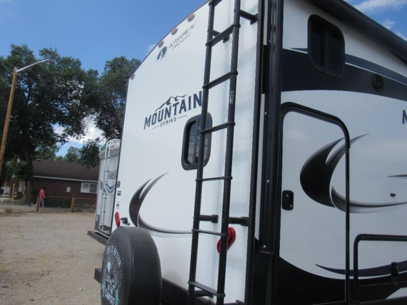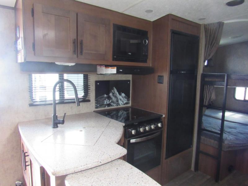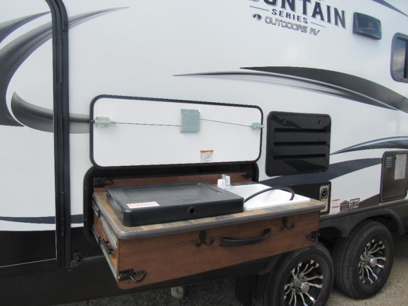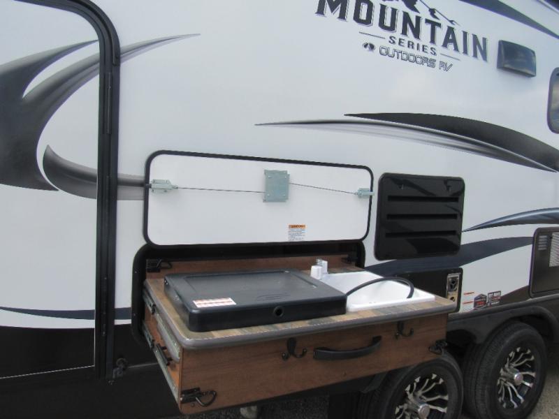A family of six or seven will love camping and exploring with this trailer from the double-size bunks next to the corner bathroom to the private front bedroom with dual entry and wardrobes, plus a queen-size bed for the parents! When everyone is relaxing or eating at the slide out Mountain dinette, they can also watch the 40" LED HDTV and plan their next adventure. The cook will love the galley kitchen with a solid surface countertop and farm sink, and there is a pantry for the snacks and dry goods. The cook will even have the choice of making meals outside on the pull-out exterior kitchen while others relax under the 20' adjustable electric awning.
