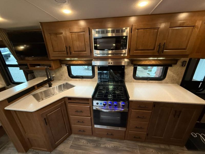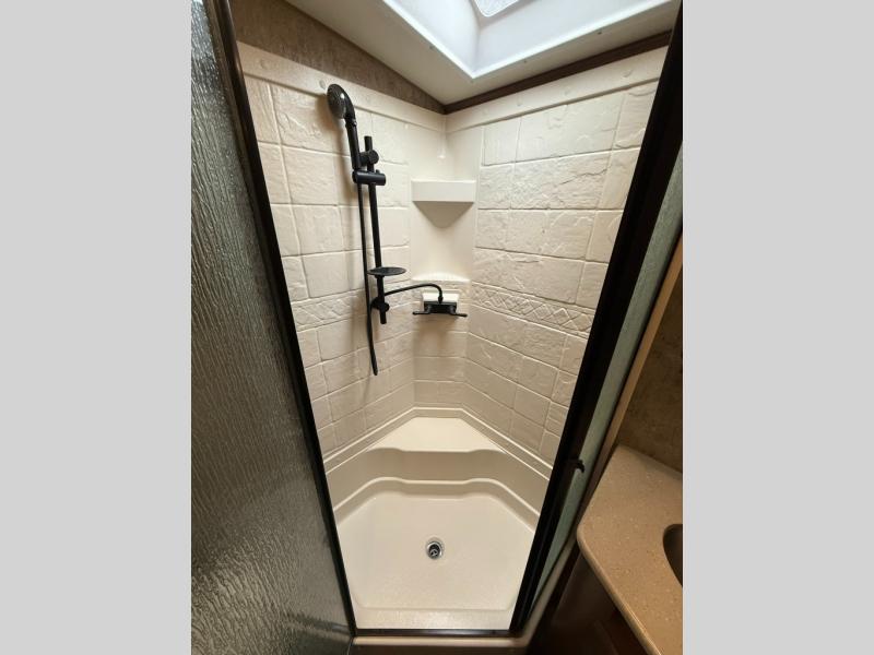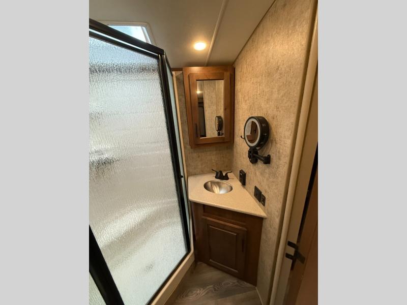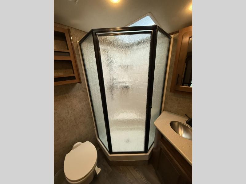 After a good night's rest on your queen-size bed or booth dinette, you can make breakfast with all the appliances provided in the kitchen area of this Timber Ridge Titanium Series travel trailer. When it's time to get ready for your adventure, you will have three wardrobes to choose from, and the wardrobe right next to the entrance will be helpful for keeping your jackets and umbrellas available whenever needed. The rear corner bathroom with its neo-angled shower will be a welcomed addition for you and your family after hiking, playing in the mud, or whatever you decided to do that day.
