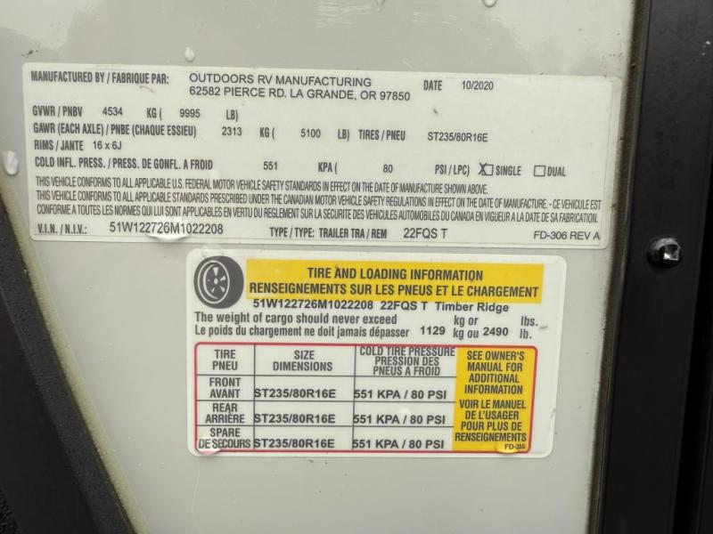 Used 2021 Outdoors RV Timber Ridge Titanium Series 22FQS Travel Trailer