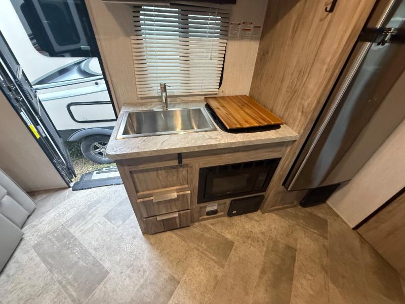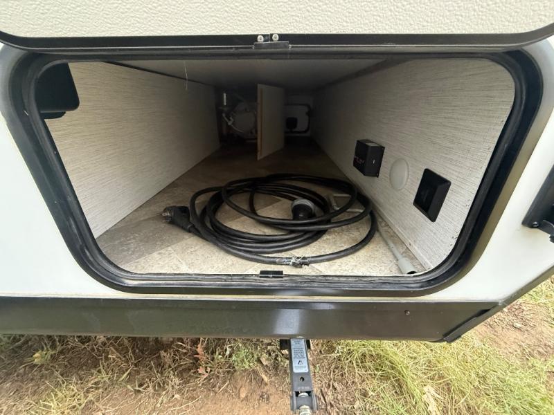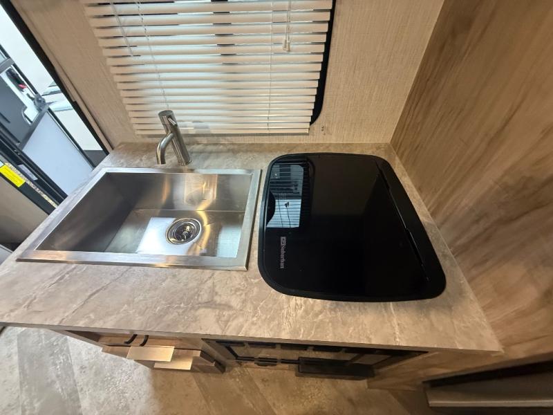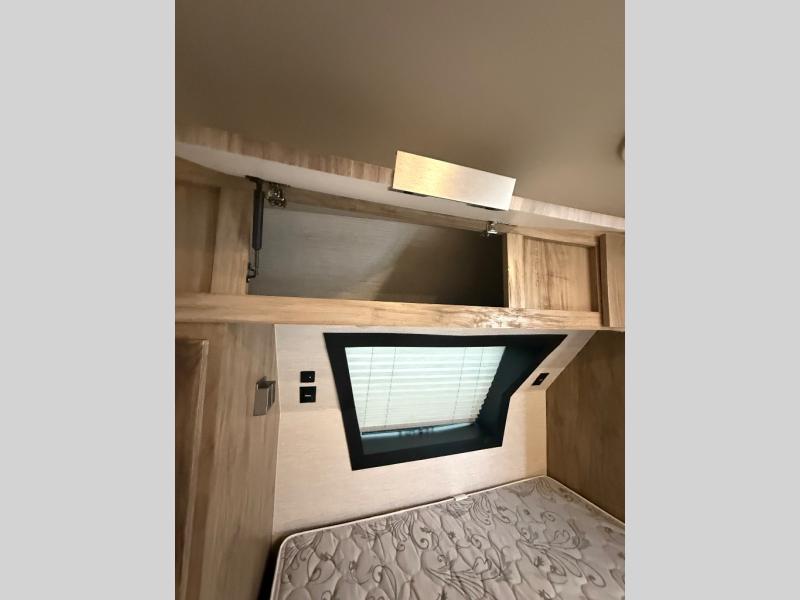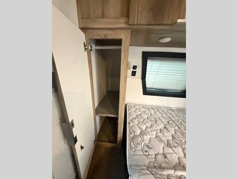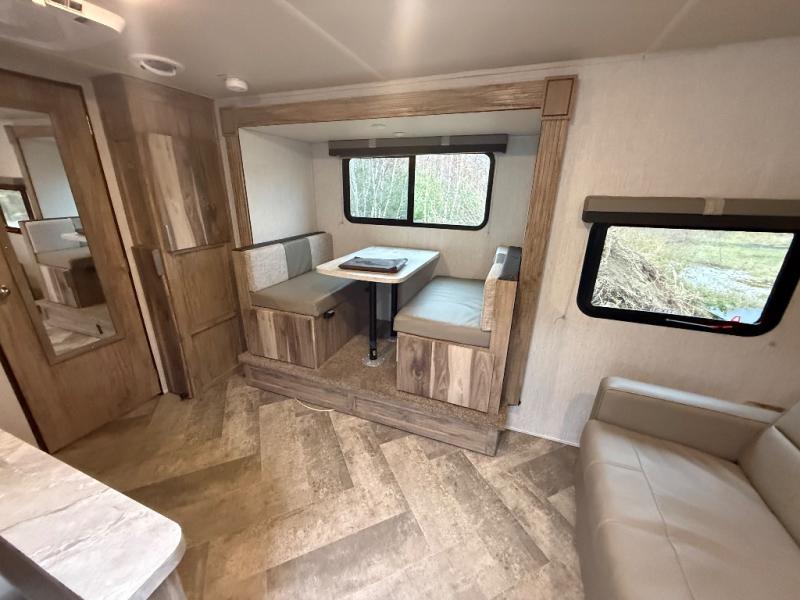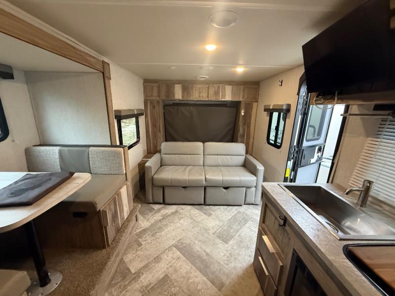 Head to your favorite spot with your favorite person in this travel trailer! The front Murphy bed offers versatility with a sofa to sit on during the day and a 60" x 80" queen bed to sleep on at night, plus there are wardrobes on either side for your clothes. Prepare your best home cooked meals with the two burner cooktop, 10 cu. ft. refrigerator, and even the microwave then enjoy them at the 38" x 70" booth dinette slide which can be transformed into an extra sleeping space. You even have an entertainment center for those days when mother nature rains on your parade. The full rear bathroom has a 32" x 32" radius shower to clean up in after a fun day at the beach and a linen closet to keep your towels close. The exterior has a 14' power awning with LED lights to highlight the good times and front outside storage to bring all of your camping necessities!