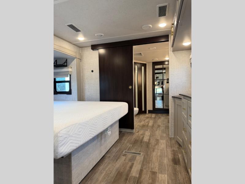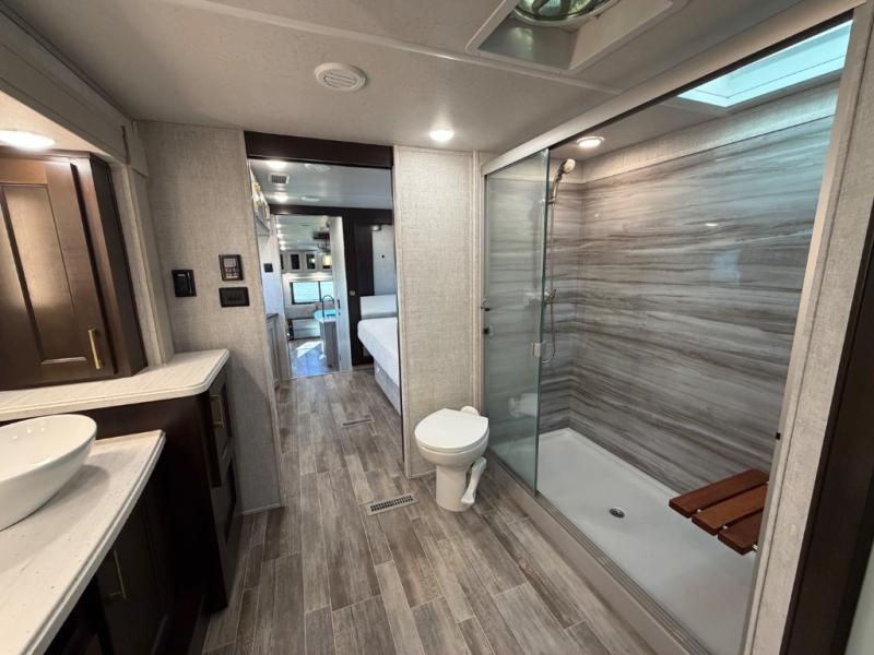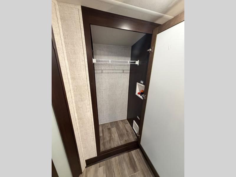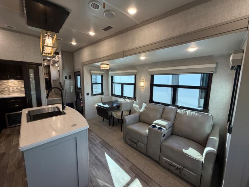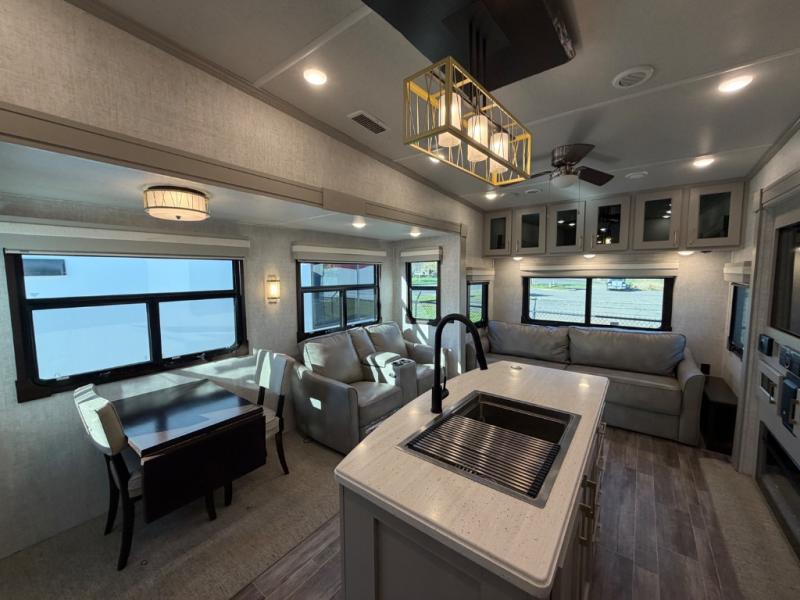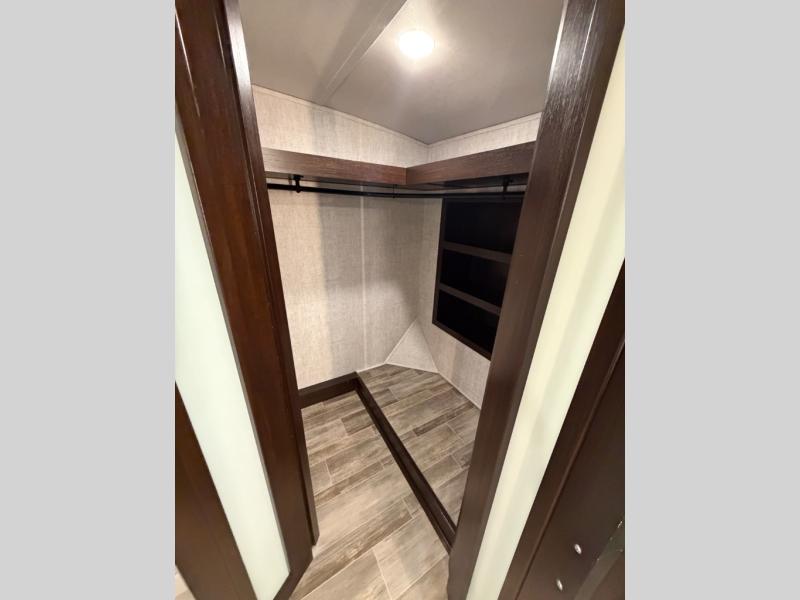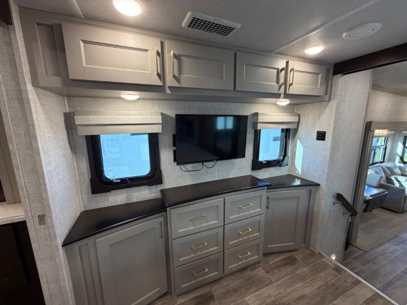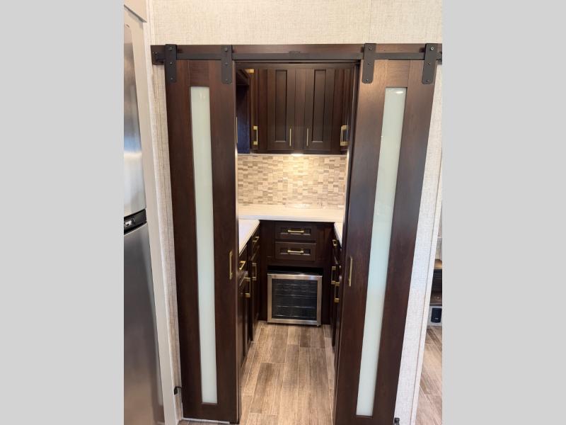 This Columbus 1492 fifth wheel is the epitome of comfortable living! This unit provides you with the greatest escape and a high level of luxury. You will be secluded away in your own master suite at the front of this unit, and all of your needs will be met with the dual-sink vanity, walk-in closet, 60" x 30" shower with teak wood seat, king bed slide, and 32" LED TV. The other extremely valuable feature in this model is the butler's pantry. This large pantry has a U-shaped countertop, overhead cabinets, and a wine cooler, and it is a valuable tool for entertaining while you are away. Another entertaining feature is the entertainment center back in the main living area, and the 88" tri-fold sofa will give you a cozy place to sit down with friends.