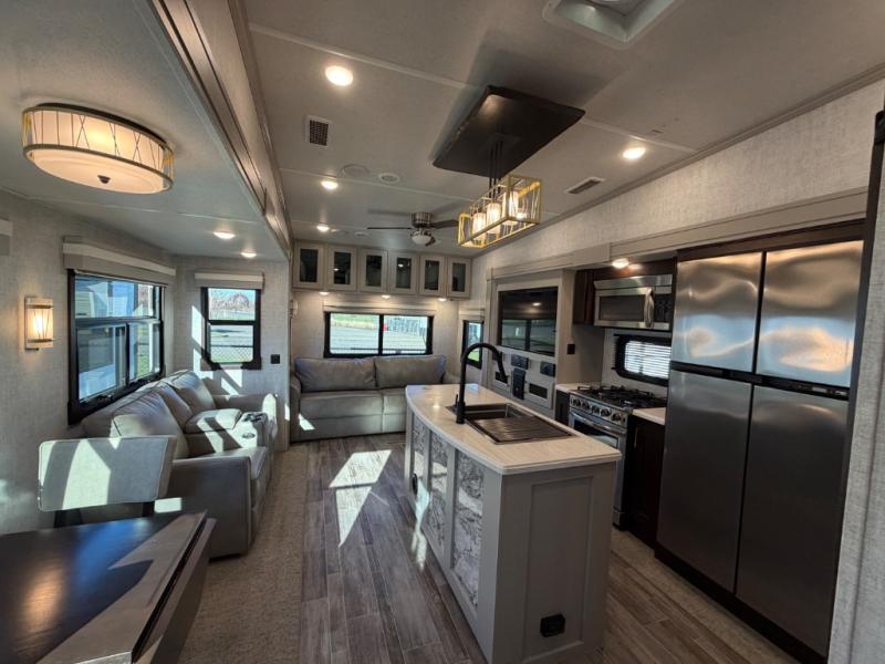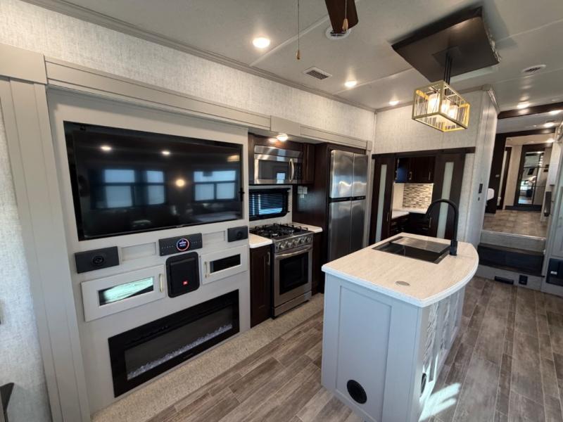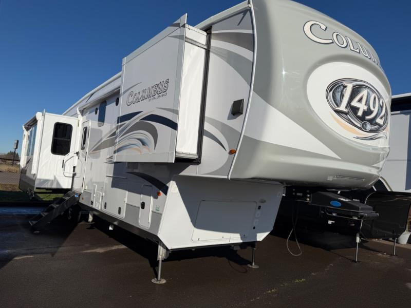 Do you enjoy vacations that are full of comfort, convenience, and class? The Palomino Columbus 1492 fifth wheel delivers a residential escape that can be used for any new adventure you have planned. The all-welded aluminum-frame superstructure has a snap-in ceiling molding, 12V heat pads on all holding tanks, 16" wheels with nitro-fill tires, large frameless tinted windows, residential crown molding, and crack/mold/mildew-resistant flooring. On the exterior, you'll find a heated utility convenience center, an outside shower, an outside AM/FM/Bluetooth receiver with USB port, and a full-view entry door with window and screen door. Plus, there are some modern features that will really seal the deal, like the Wi-Fi Booster with 4G LTE capability, the JBL sound system, the preparations for a washer/dryer, the electric fireplace, and the preparations for Go Power Solar.