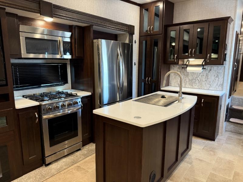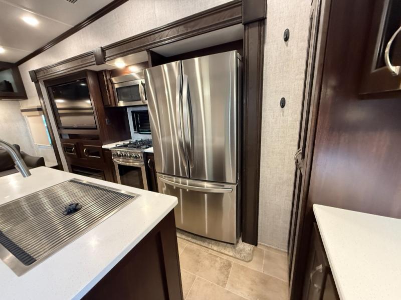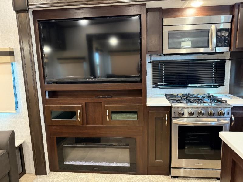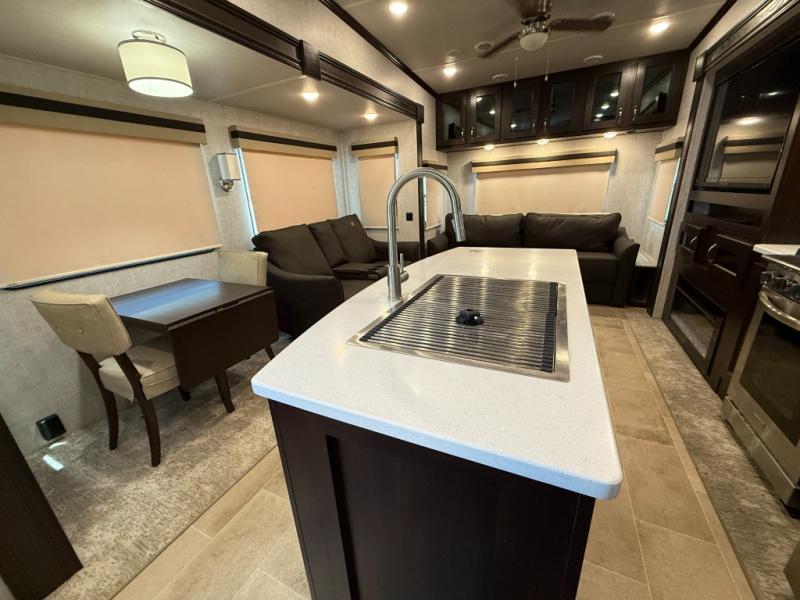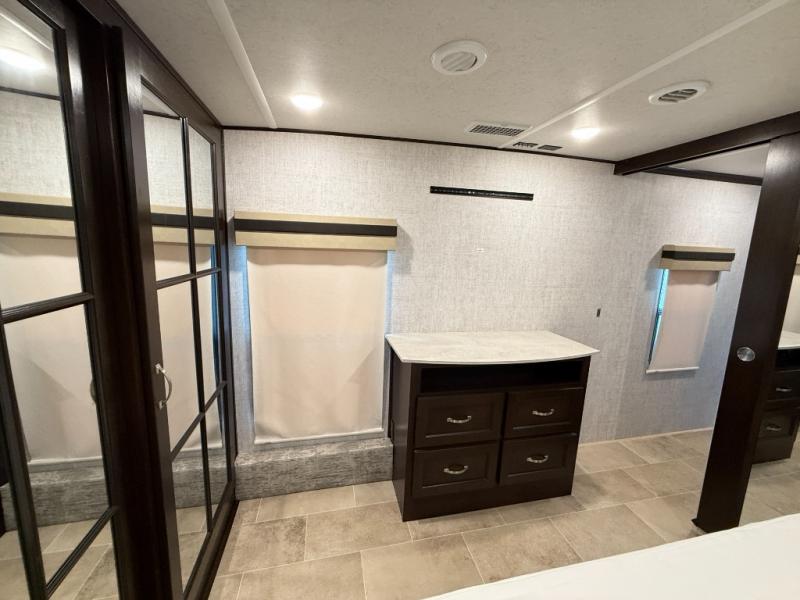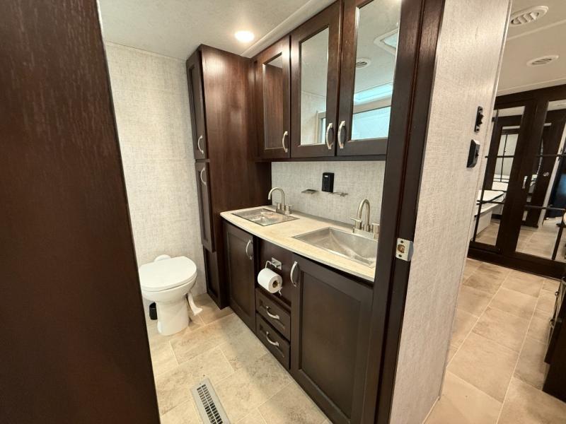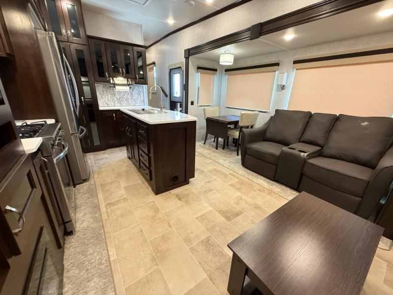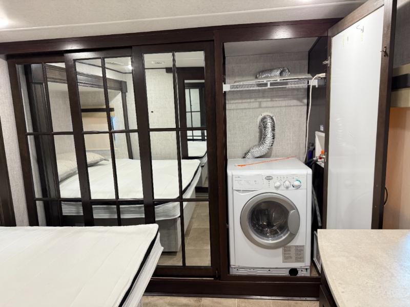 Head to RV parks, state parks or even your family ranch to setup camp for the weekend or even longer! The triple slides will give you more interior floor space in the bedroom thanks to the king bed slide, and you will find a storage for all your clothing and more in the dresser and wardrobe. You might even like to add the washer/dryer option to the prepped space. The bathroom might be the best feature with two bathroom sinks and a shower with a seat. In the main living and kitchen area you can relax on the theatre seats or the split tri-fold sofa after dining at the free standing table. And the kitchen island plus residential appliances will make cooking enjoyable while you watch the 50" LED TV.