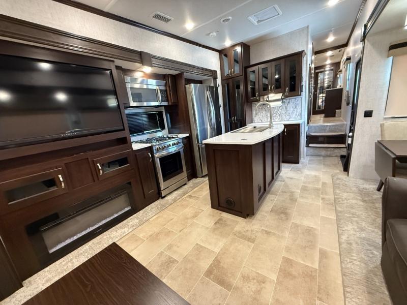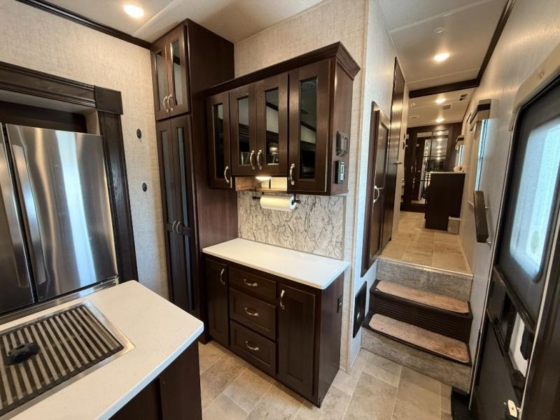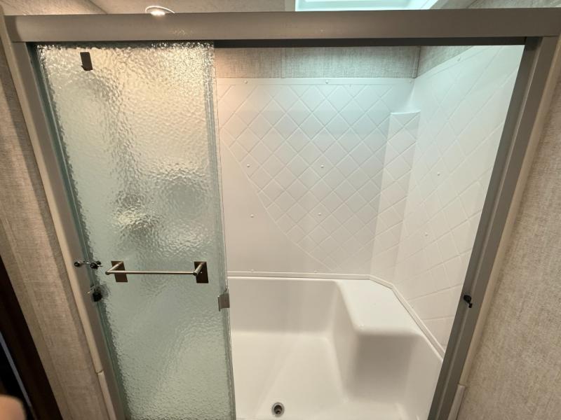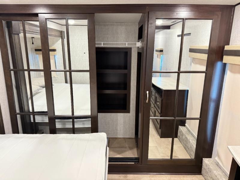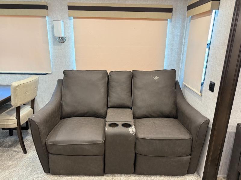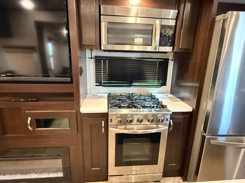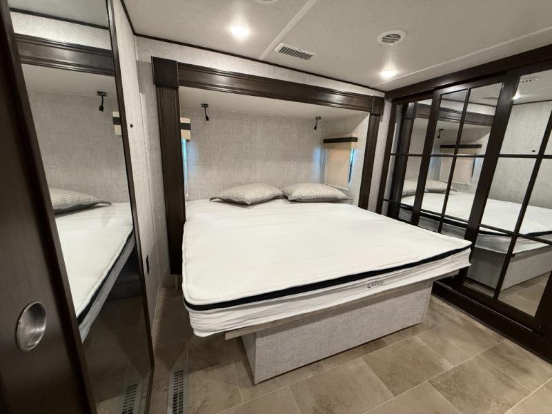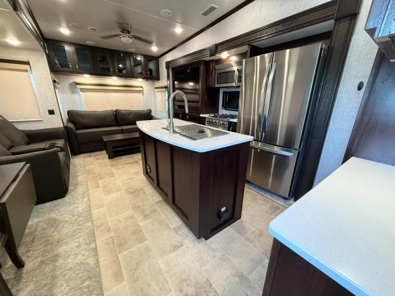 Head to RV parks, state parks or even your family ranch to setup camp for the weekend or even longer! The triple slides will give you more interior floor space in the bedroom thanks to the king bed slide, and you will find a storage for all your clothing and more in the dresser and wardrobe. You might even like to add the washer/dryer option to the prepped space. The bathroom might be the best feature with two bathroom sinks and a shower with a seat. In the main living and kitchen area you can relax on the theatre seats or the split tri-fold sofa after dining at the free standing table. And the kitchen island plus residential appliances will make cooking enjoyable while you watch the 50" LED TV.