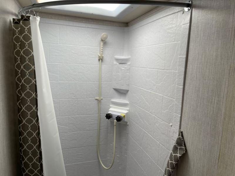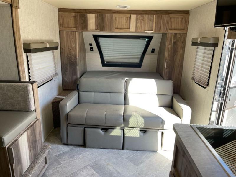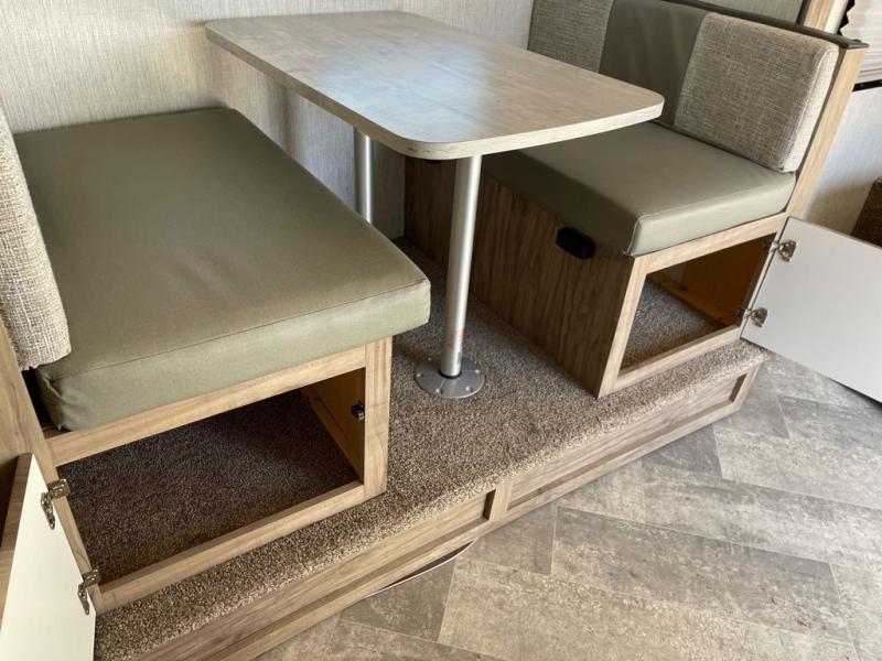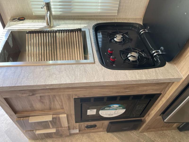 Are you looking for a little more interior space in your next RV? The booth dinette slide out gives you just that on this PaloMini travel trailer! You can enjoy a front living area during the daytime relaxing on the sofa, and at night you can easily set up the queen Murphy bed to rest up for the next day's adventures. Your kiddo or buddy can sleep on the dinette which measures at 30" x 70" once set up for bedtime. You can take turns getting cleaned up in privacy in the rear bathroom complete with linen storage and a radius shower, and the cook will appreciate having a two-burner cooktop and microwave as well as a refrigerator to keep everyone fed. You will also find storage in the wardrobes, pantry, and overhead cabinets.