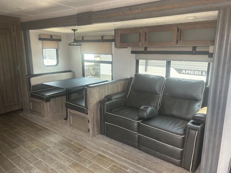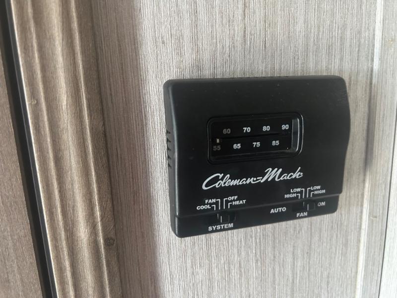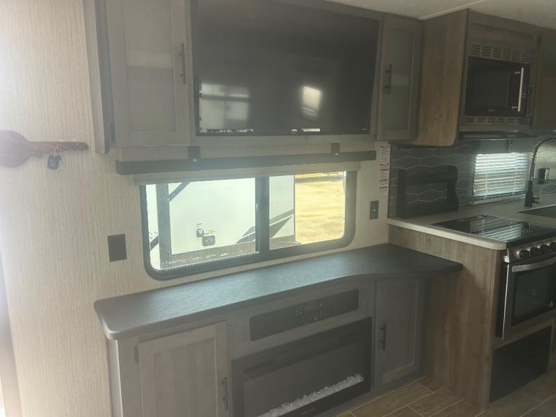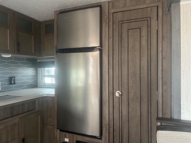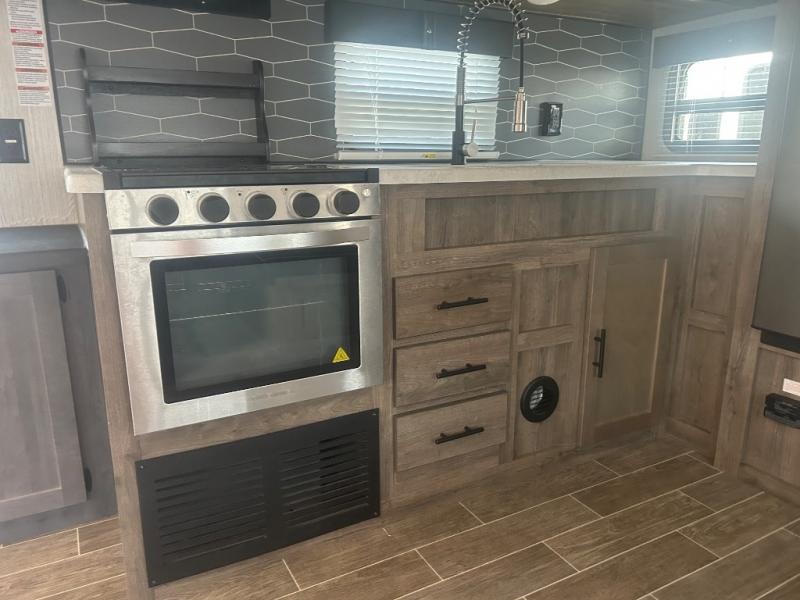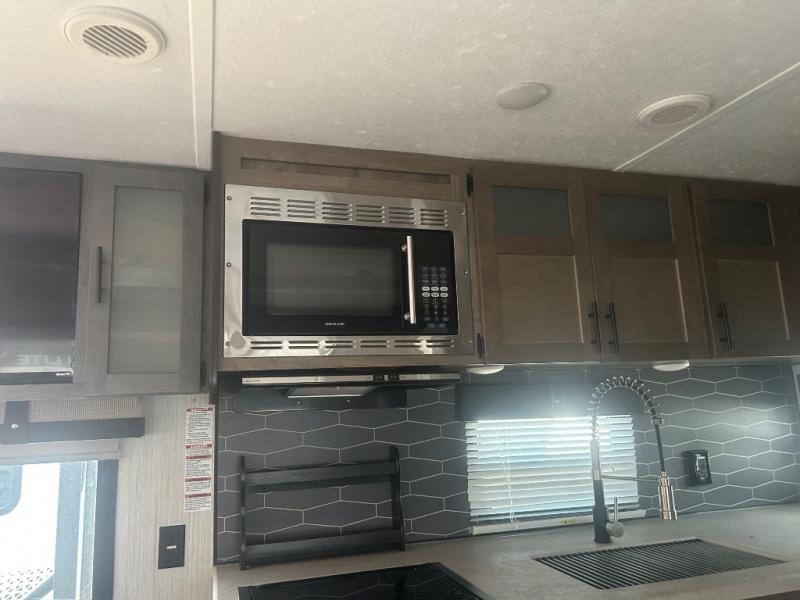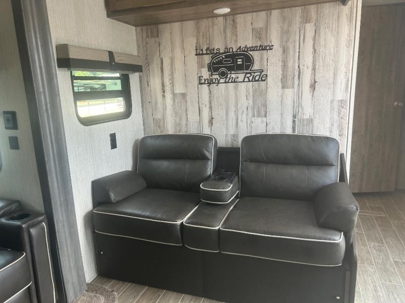 Let your worries fade away while you enjoy your time in this Puma travel trailer! You will be able to host any friends that you've made around the campground with the helpful amenities found in the full kitchen, like the three-burner high-output range with glass cover and the undermount stainless steel sink with roll-up covers. Plus, the spice rack, built-in knife rack, and divided silverware drawer make the kitchen exceptionally functional. Once you have prepared a delicious meal for your guests, you can offer them a place to sit back and enjoy that meal with the booth dinette, the two recliners, and the sofa.