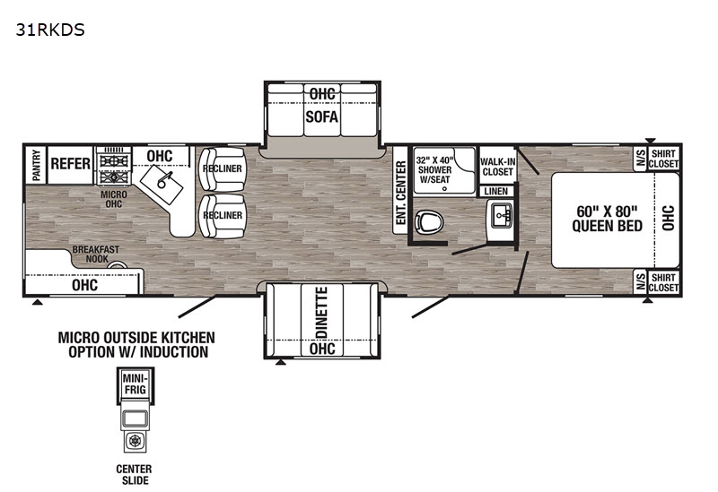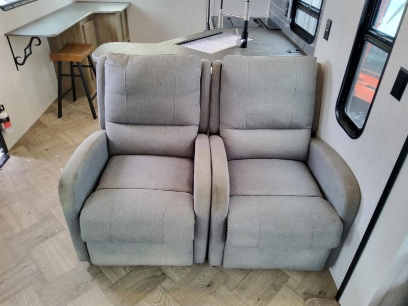 This unique Puma travel trailer gives you the comfort and convenience that you love about your own home! With its private bedroom up front, its central living area with two recliners and entertainment center, and its rear kitchen, this unit has it all. It will be so fun to spend your mornings cooking up a hearty breakfast on the three-burner range while your spouse or kids sit down at the breakfast nook and chat with you. Plus, you won't have to tip toe around furniture when you walk from one end of this trailer to the other because the central opposing slides give you space to move.