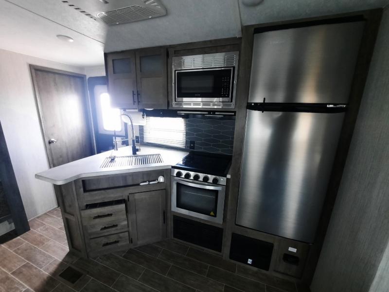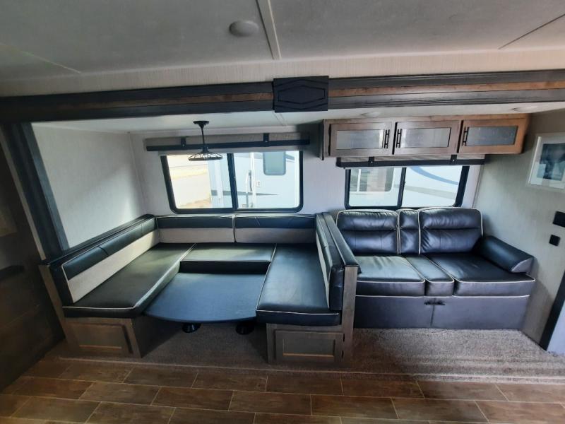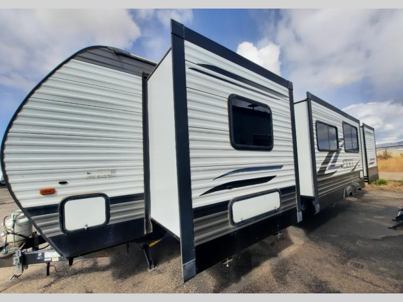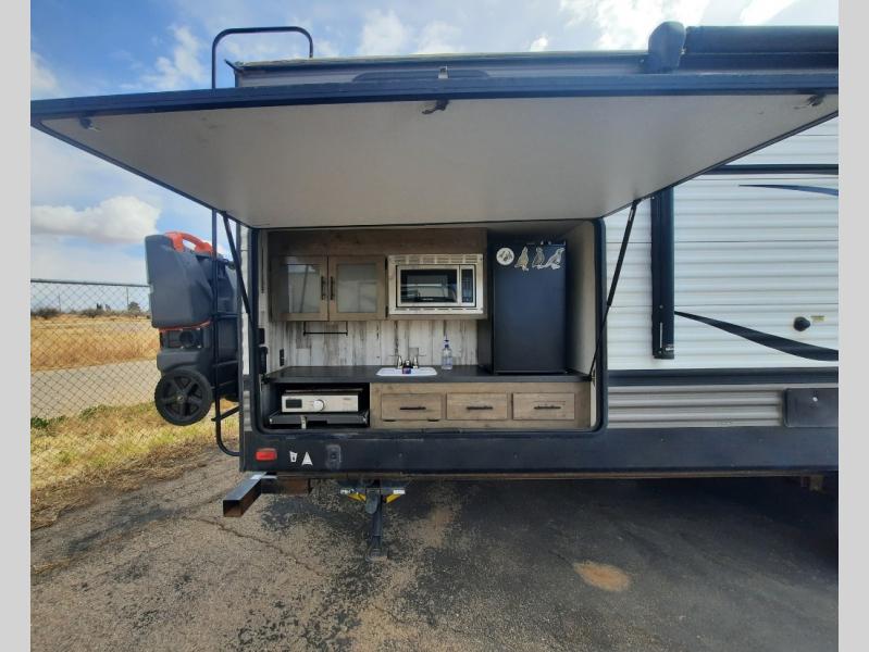 Enjoy privacy and comfort with a bunk room for the kids in the rear and a master suite at the front. A spacious sitting area, kitchen, and bathroom in between help keep things quiet. Outside, relax under the 21-foot awning while your grill master cooks up something delicious, and the kids run off their energy.