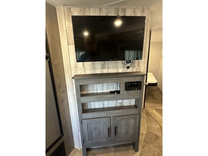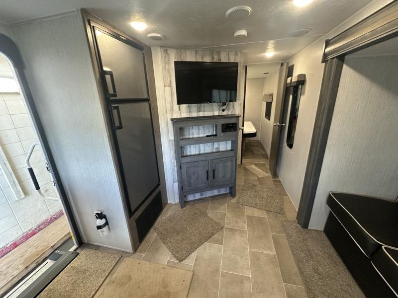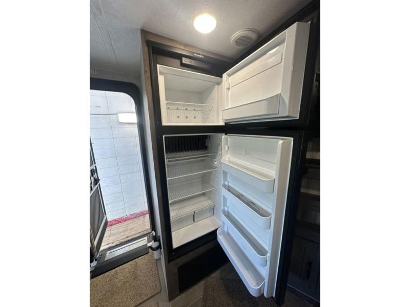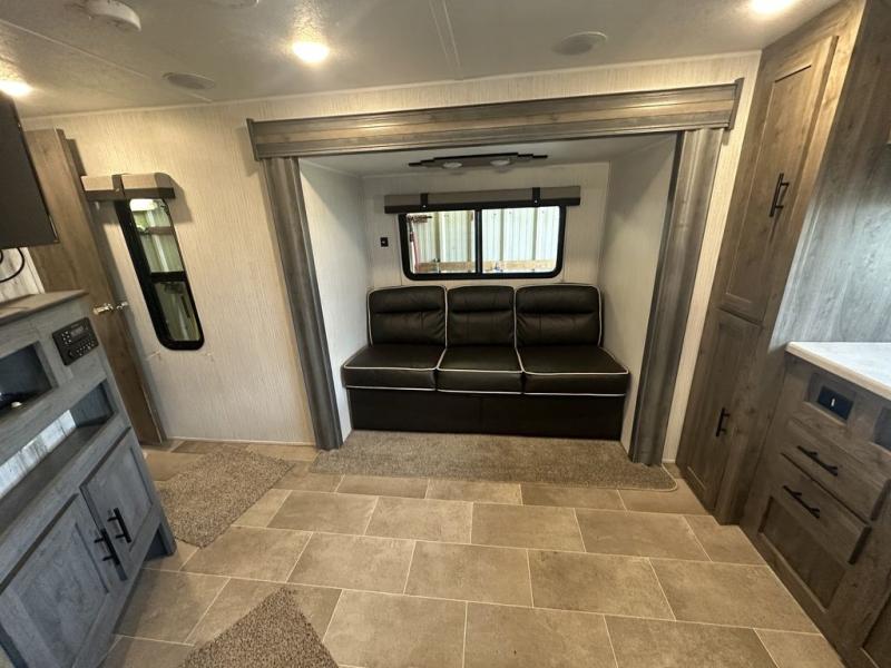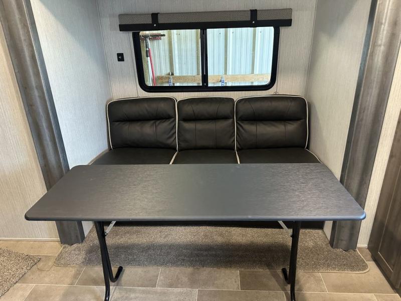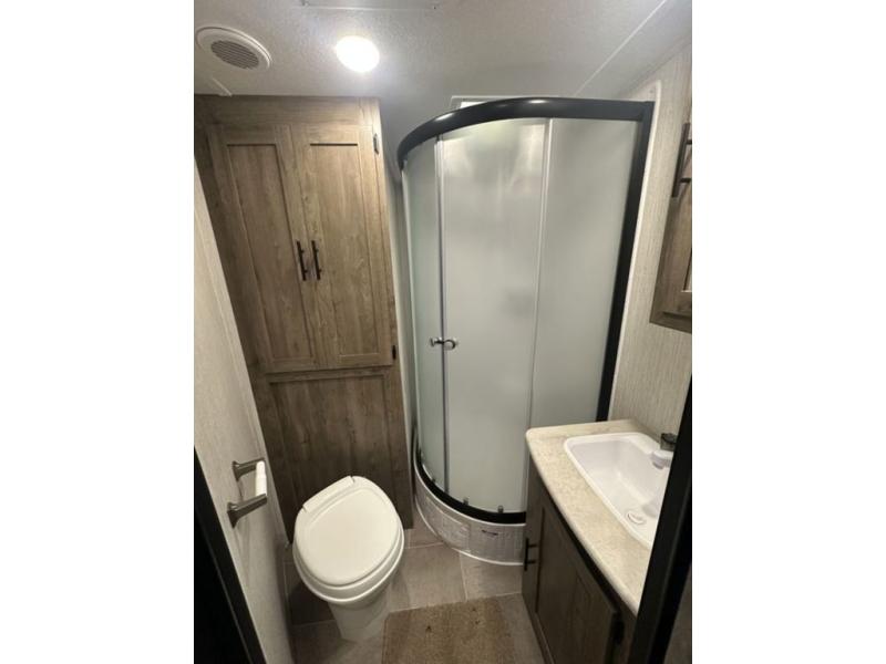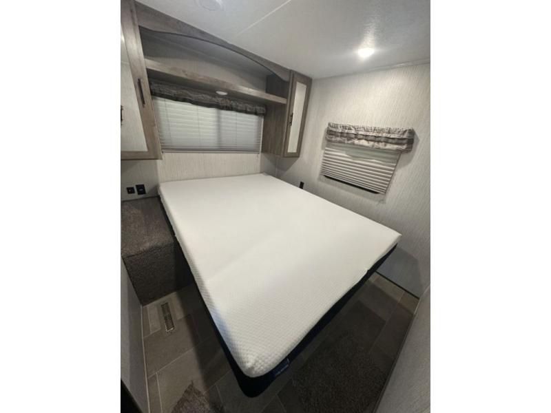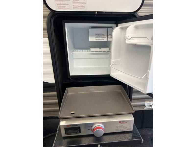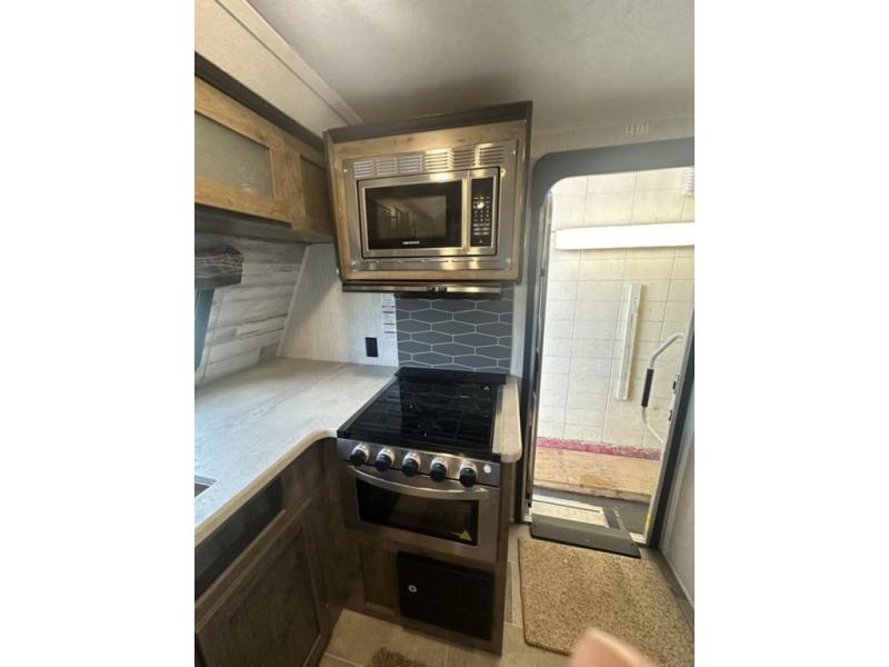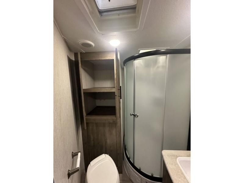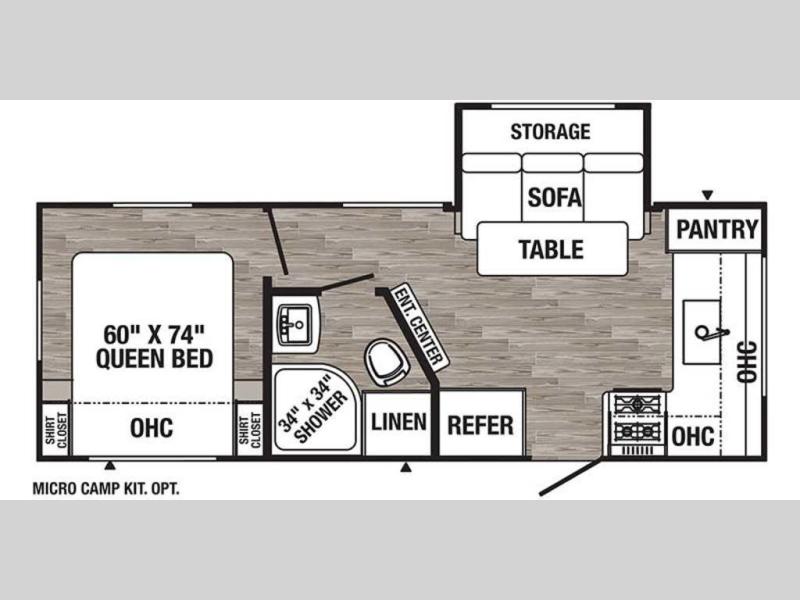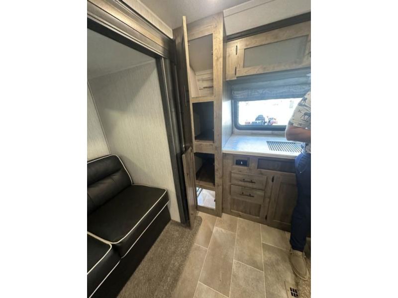 You're going to love this travel trailer with a front kitchen layout. There is ample counter space to prep fresh meals each day, and the pantry can store the dry ingredients. If you prefer to cook outside, just choose the optional micro camp kitchen with a griddle and a mini fridge! Dine with your loved one at the sofa with a table, and this area can double as sleeping space if you have any overnight guests. The full bath includes a shower skylight to let natural light in and a large linen closet for clean towels. When sleep is calling your name, head to the rear private bedroom to crash on the comfortable RV queen bed!