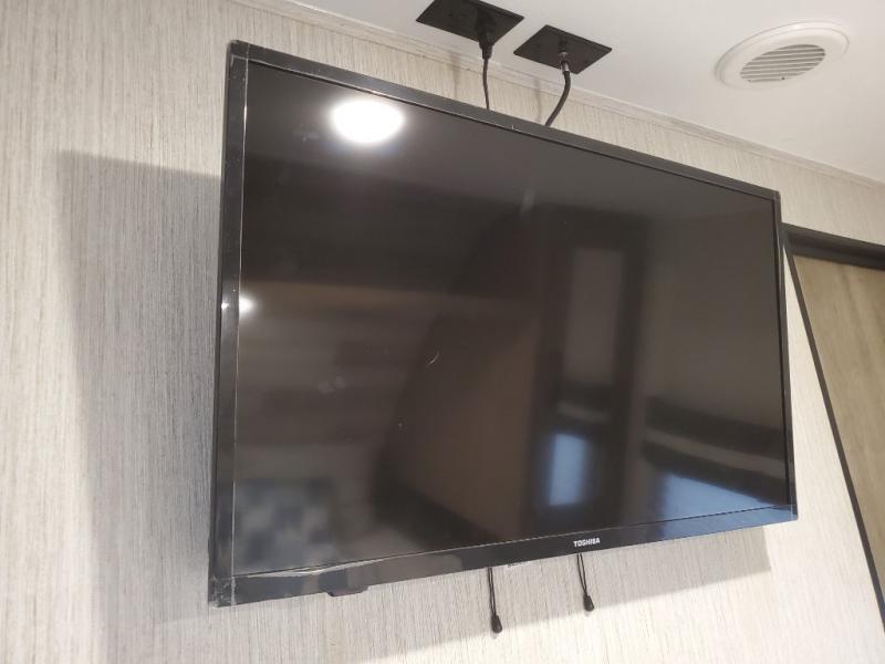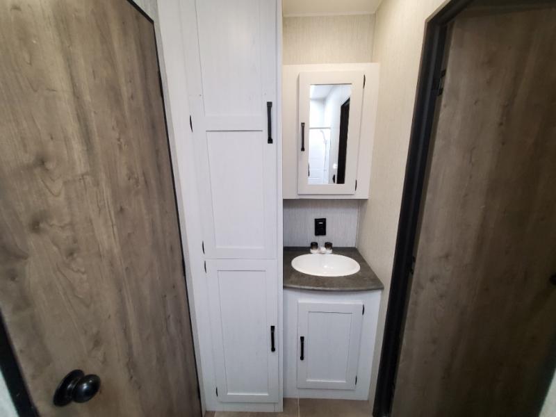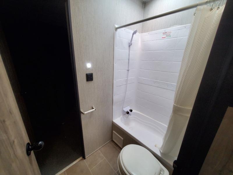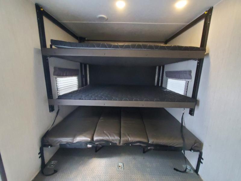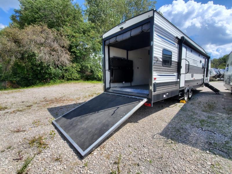 Dual entry doors, a 13' separate garage for guests, plus sleeping space for six to eight make this the perfect toy hauler to camp with friends. The walk-through bath is easily accessible for everyone to use, and the 40" tub will make bath time easy for little ones. Gather around the slide out U-shaped dinette for a meal together, or head outside to sit under the 21' electric awning. The front private bedroom with a queen bed will be perfect for you and your spouse, and if you need additional sleeping space, you can choose the optional electric queen bed.