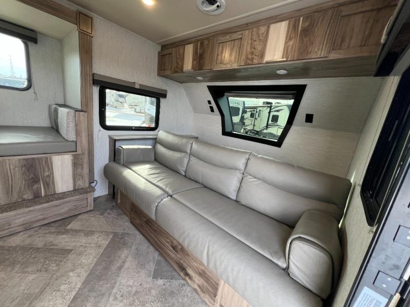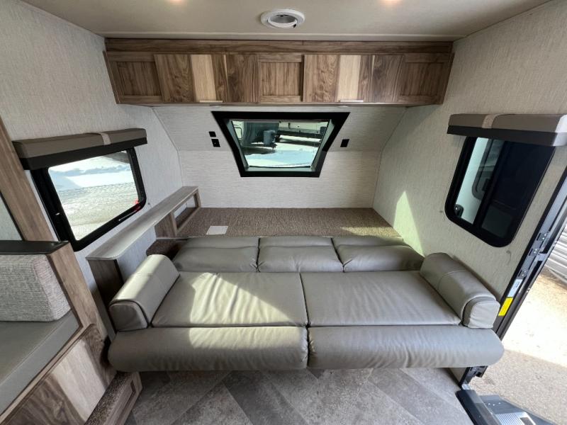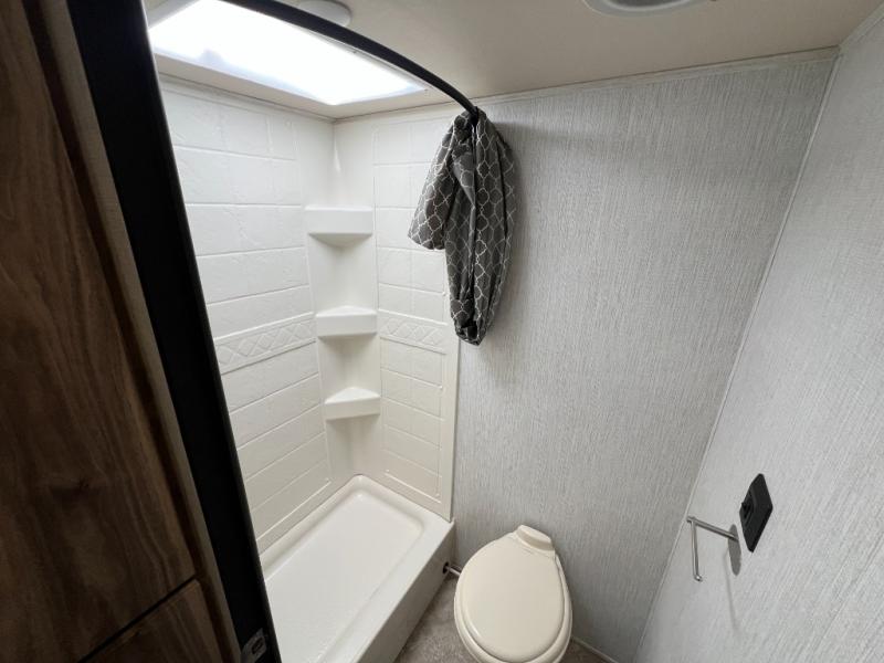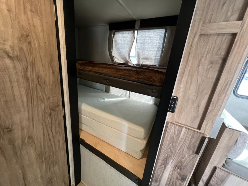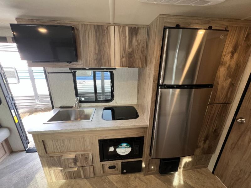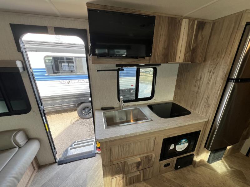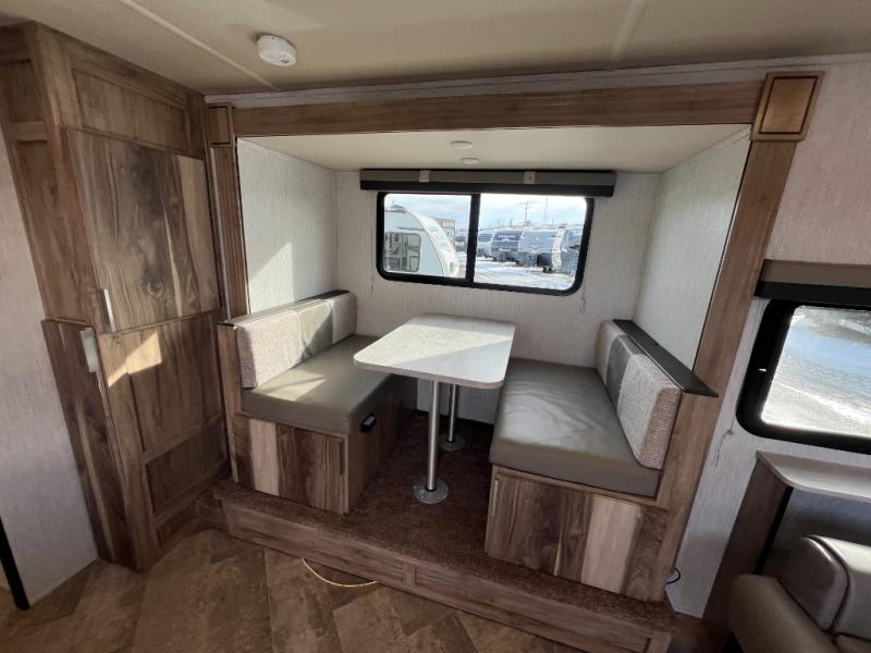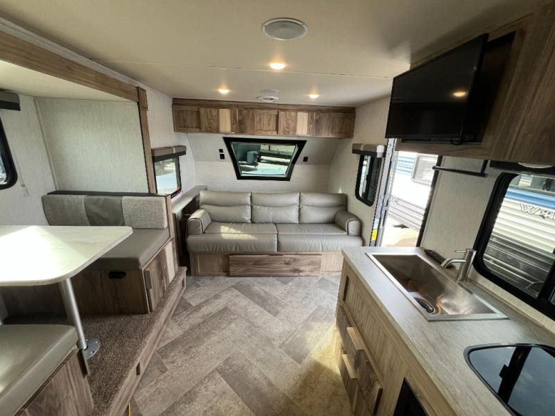 You're going to love the space you having in this travel trailer when the slide out is open and the Murphy bed is folded away for the day. You can relax on the sofa in front of the bed, or play a game of cards at the booth dinette. Whip up your best meals on the there burner cooktop, or use the microwave oven if you're on the go. And did we mention this model includes bunk beds?! This makes it the perfect trailer to camp with kids or overnight guests!
