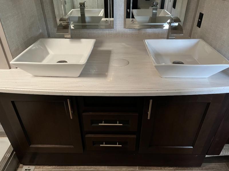 The bathroom is spacious and well-appointed with quality fixtures, a roomy shower, and plenty of storage—bringing residential convenience to your travels.