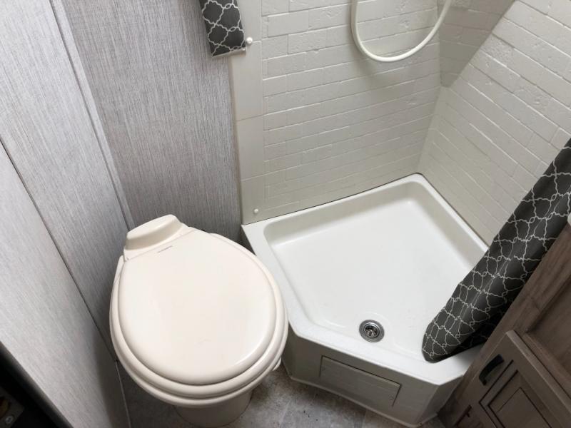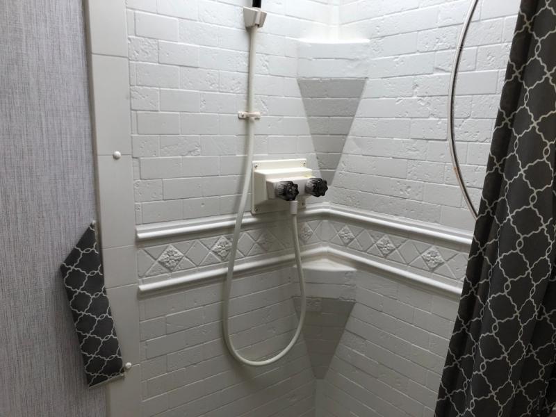 Bathroom: Features a neo-angled shower, toilet, and sink.