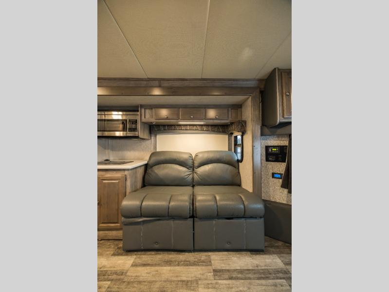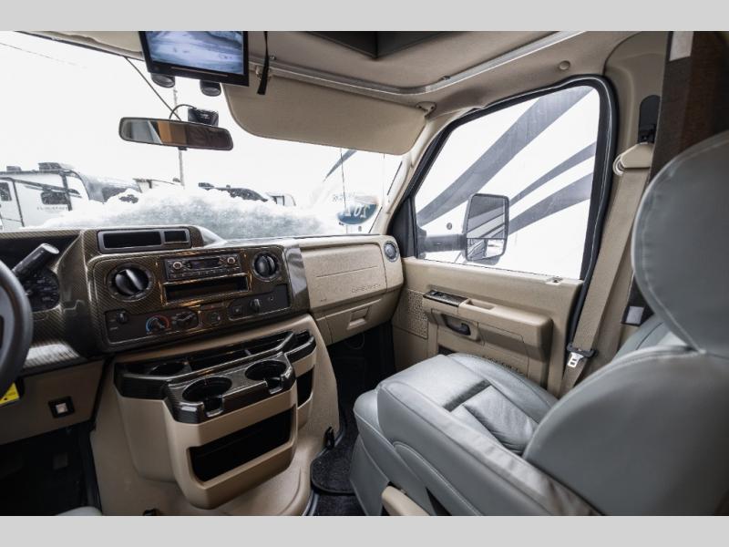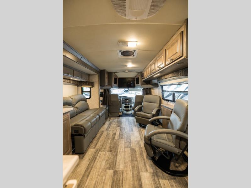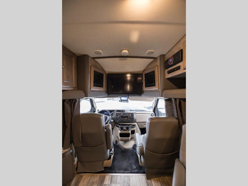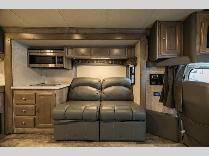 If you like to telecommute, this Phoenix Cruiser Class B+ gas motorhome is perfect since it includes a desk in the rear bedroom across from the RV queen bed. You will also find dual wardrobes and a TV cabinet. The main living area includes a slide out providing extra floor space for the cook, and the 54" x 74" sofa bed provides additional sleeping space once set up for nighttime. You will also find seating on the two lounge chairs and swivel passenger seat. This is the one!