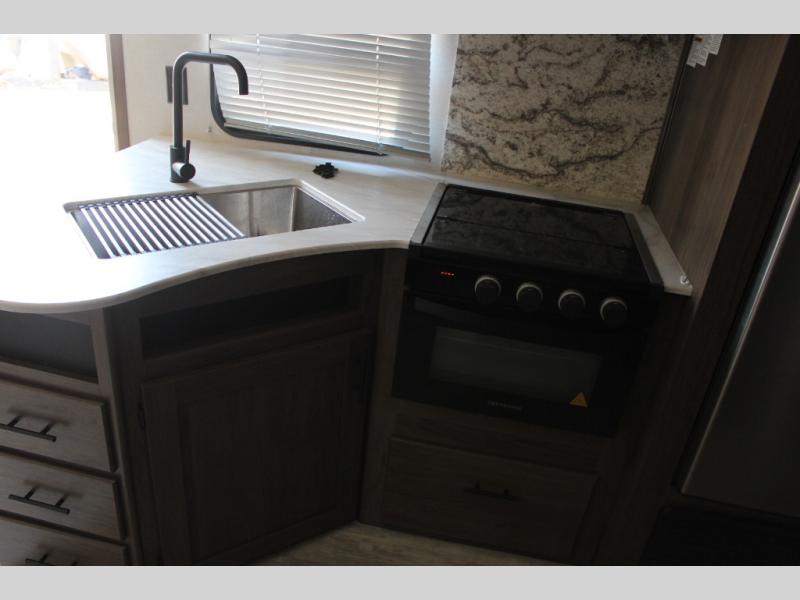 Imagine the kiddos hiking around the campground and laughing about their adventures in this Avenger travel trailer. This trailer offers sleeping accommodations for eight because of the double-size bunks, U-shaped dinette, and queen-size bed, and it also includes a full bathroom with a shower curtain on a curved track providing more elbow room. You will find full kitchen amenities inside, as well as an outdoor kitchen where you can watch the kids play while making dinner. The single slide provides more living space on the interior, as well as extra sleeping space.