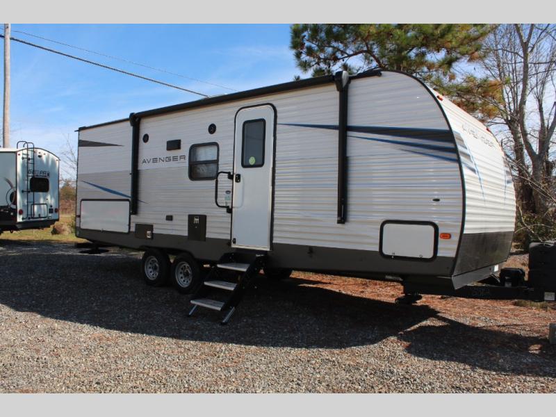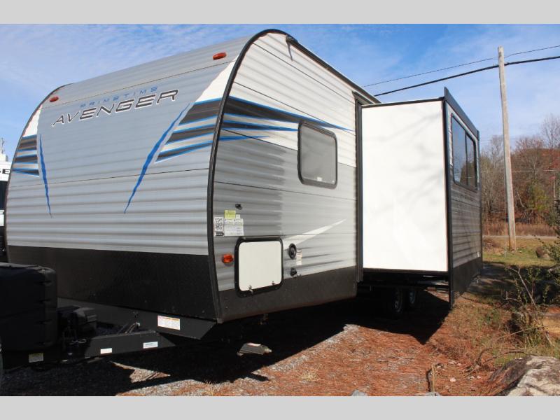 With premium fabrics and beautiful interior décor, the Prime Time Avenger travel trailers offer complete customer satisfaction! The innovative and lasting construction of the Avenger provides you with confidence as you travel. The Avenger is built with a powder-coated I-beam frame, an aluminum exterior skin, a PEX plumbing system, a Dynaspan 5/8" seamless floor decking, a secure tank system, and an extreme weather package. The interior has excellent features to accommodate all sorts of traveling types with its massive under-bed storage, Bluetooth entertainment system, in-floor ducted heat, large fully vented windows, and USB ports. You will also enjoy having an exterior hot/cold shower and a doggy D-ring so that you can rinse off your puppy's paws before taking them back inside for the night.