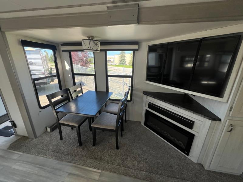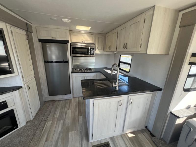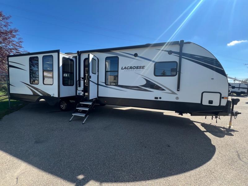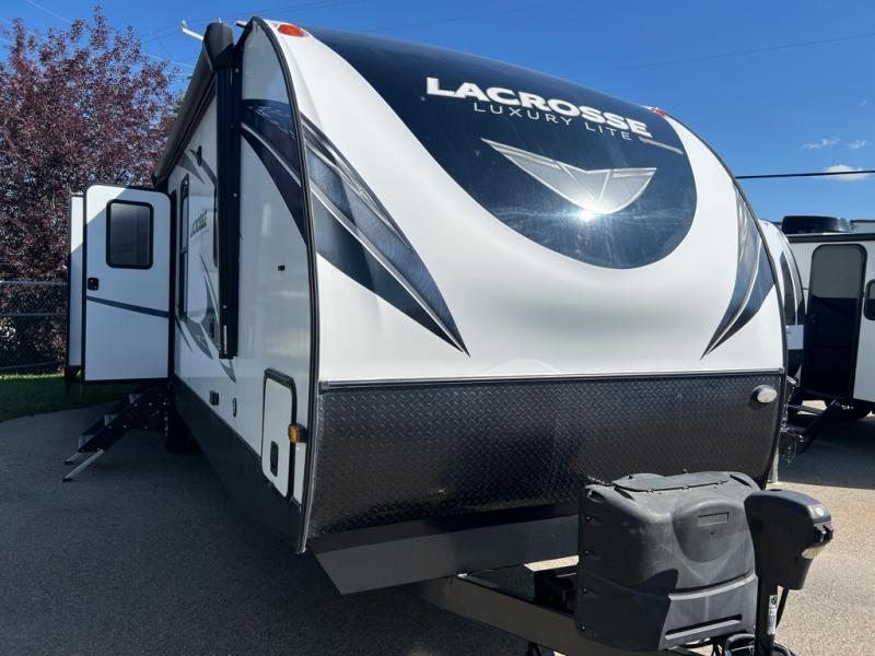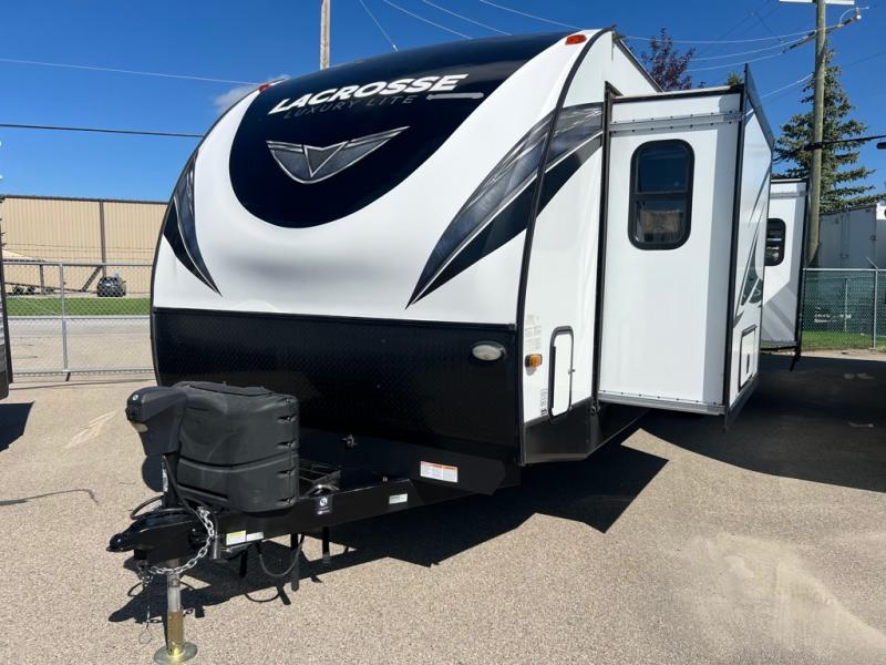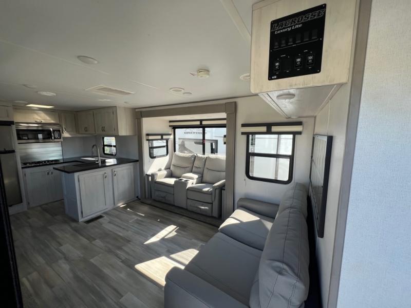 For any camping adventure, you will want this LaCrosse luxury travel trailer for several reasons. You will find sleeping space for up to four people, plus there are large panoramic slide room windows providing a beautiful view when dining. The rear kitchen offers the finest chefs the LaCrosse's best-in-class luxury kitchen with a Furrion residential cooktop, convection microwave, and single-bowl stainless steel sink on the U-shaped countertop. Come enjoy time together with your family or a few friends in the living area with theater seating, hide-a-bed sofa, and windows galore! The front private bedroom will not disappoint with the king bed slide, a huge wardrobe, and a large chest of drawers. This is the one!