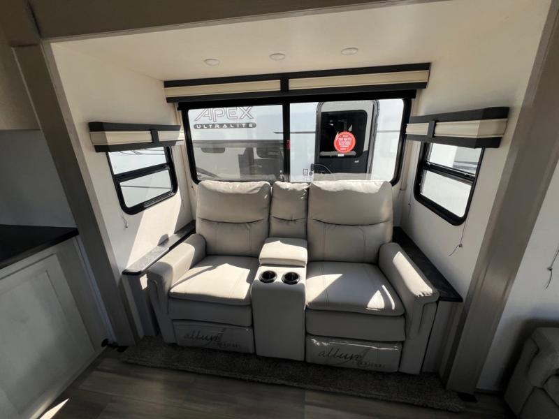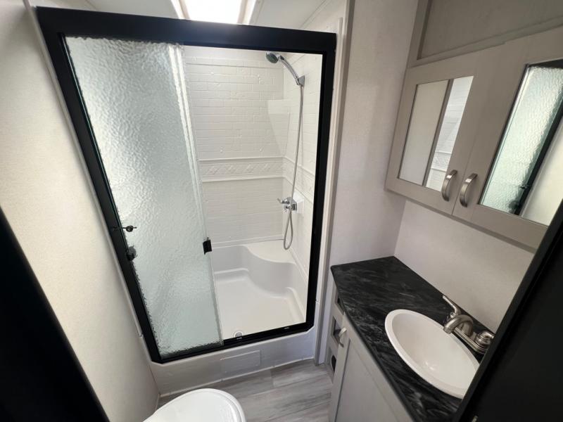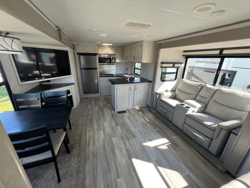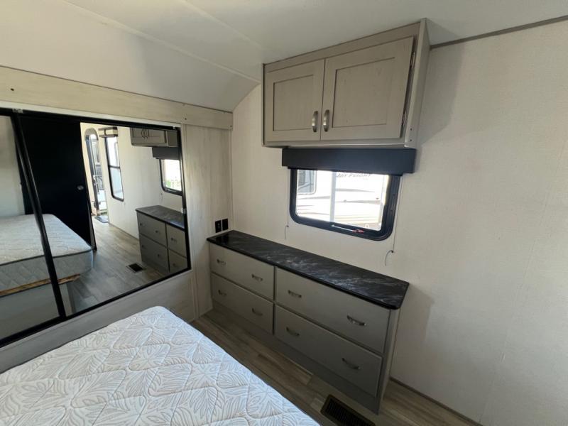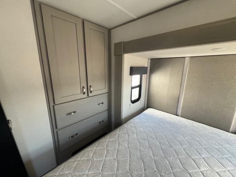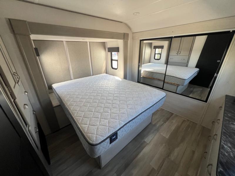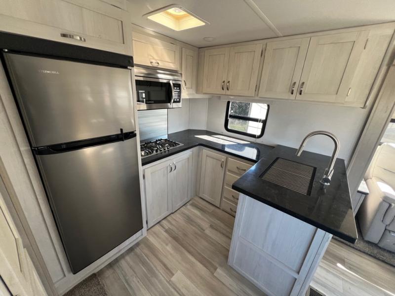 For any camping adventure, you will want this LaCrosse luxury travel trailer for several reasons. You will find sleeping space for up to four people, plus there are large panoramic slide room windows providing a beautiful view when dining. The rear kitchen offers the finest chefs the LaCrosse's best-in-class luxury kitchen with a Furrion residential cooktop, convection microwave, and single-bowl stainless steel sink on the U-shaped countertop. Come enjoy time together with your family or a few friends in the living area with theater seating, hide-a-bed sofa, and windows galore! The front private bedroom will not disappoint with the king bed slide, a huge wardrobe, and a large chest of drawers. This is the one!