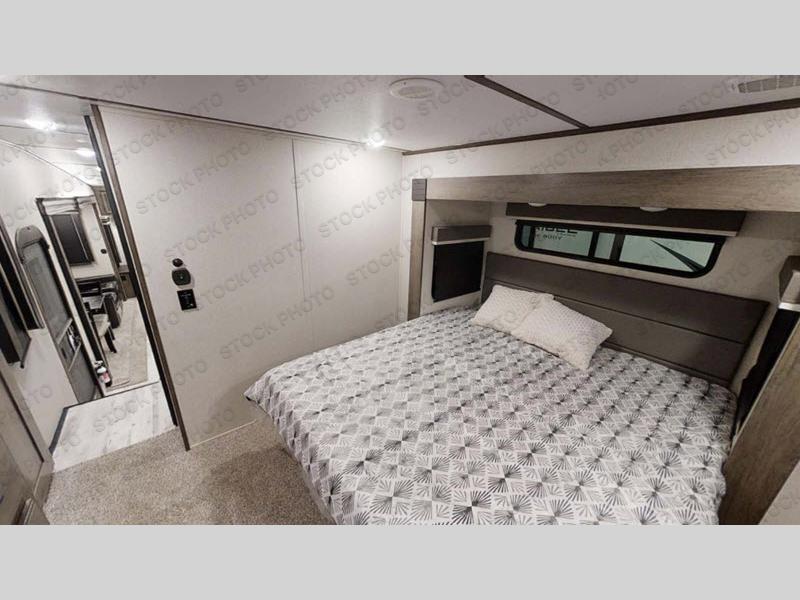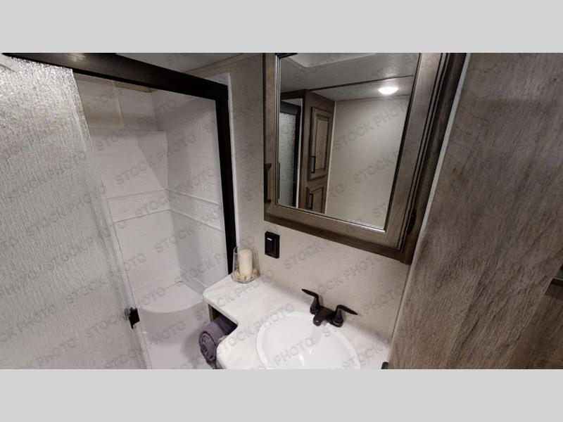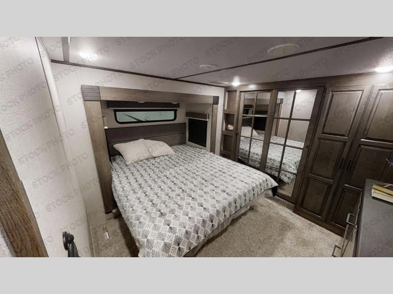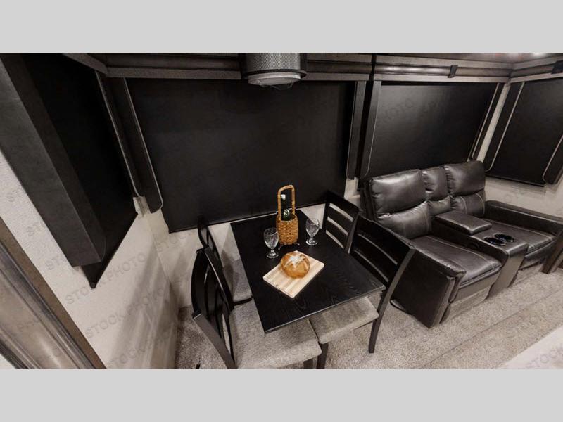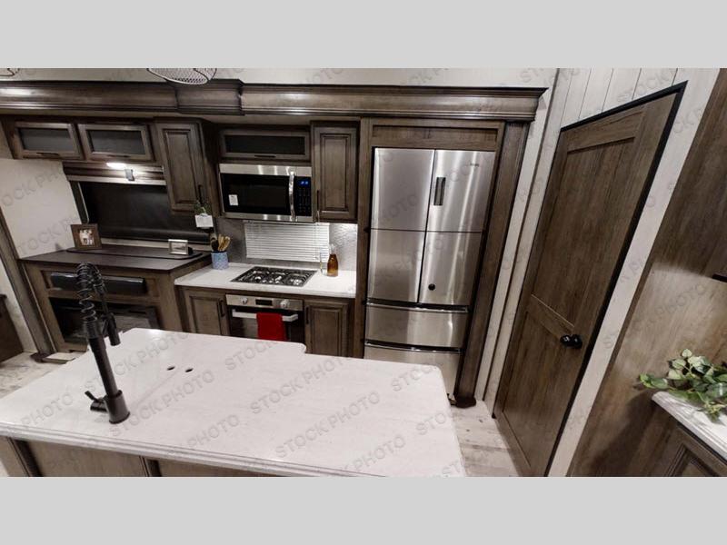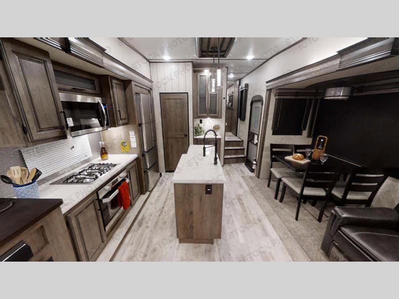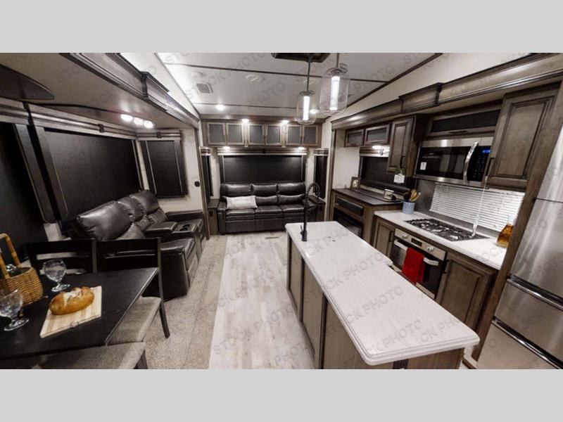 Pack your bags and hitch this fifth wheel up to have a fun getaway with your spouse! It features a front private bedroom with a 72" x 80" king bed across from a dresser with a TV prep above it and a front wardrobe with shelves which is also prepped to add an optional washer and dryer. The full bathroom has a linen closet next to the shower for you to easily grab a towel. Store your favorite snacks in the walk-in pantry, your nice dishes in the hutch, and keep your beverages cold in the 15 cu. ft. residential refrigerator. The kitchen island will make meal prep and cleaning up a breeze with a double sink. When mother nature rains on your parade, relax inside on either the hide-a-bed sofa or the 65" theater seating across from the entertainment center with a fireplace and a pop-up TV!