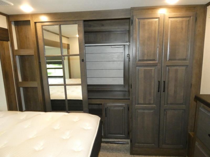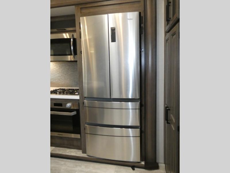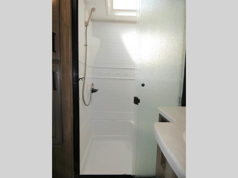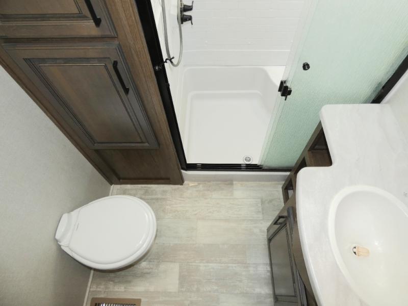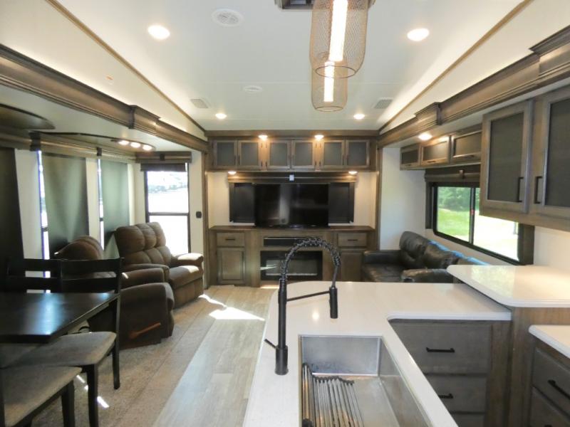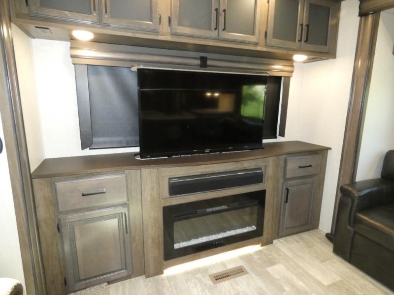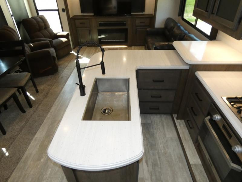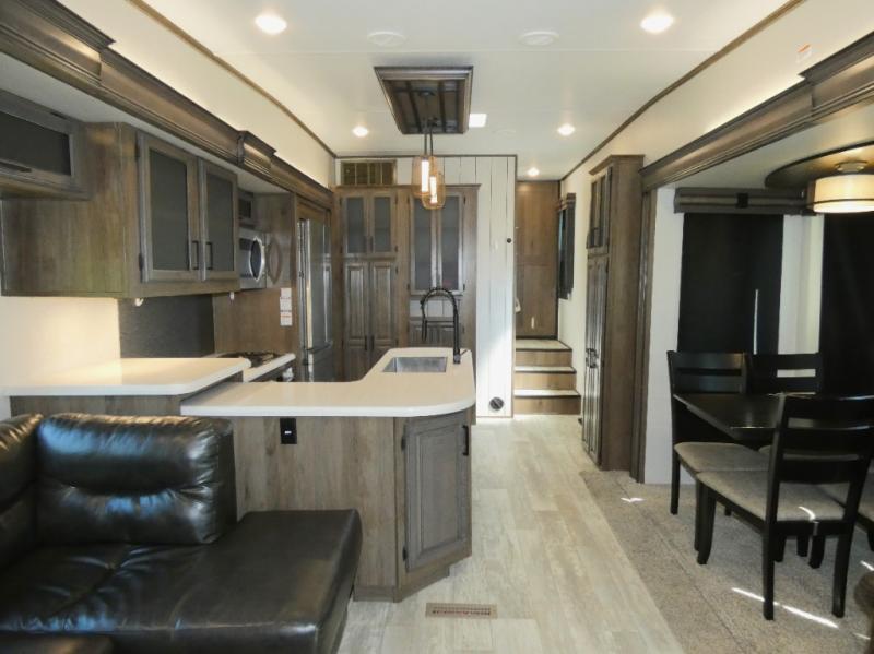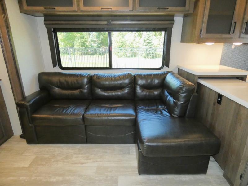You won't be left wanting for any amenities in this comfortable fifth wheel. Once you arrive at your destination, your crew can relax in the rear living area that includes a rear entertainment center with a 50" TV on lift. The dual recliners, hide-a-bed L-shaped sofa, and dinette with chairs will provide seating for everyone, and the chef of the family can easily prepare meals in the spacious kitchen. There is a closet and a pantry to store paper goods and snacks, a residential refrigerator, and a Furrion oven and cooktop to make meals each day. After you've explored all day, freshen up in the full bath with a 40" shower with a seat, a deluxe "skyview" skylight, and a linen closet to store clean towels. The front private bedroom will feel like your own oasis with its slide out king bed, a large closet with shoe storage and sliding hardwood mirror doors.