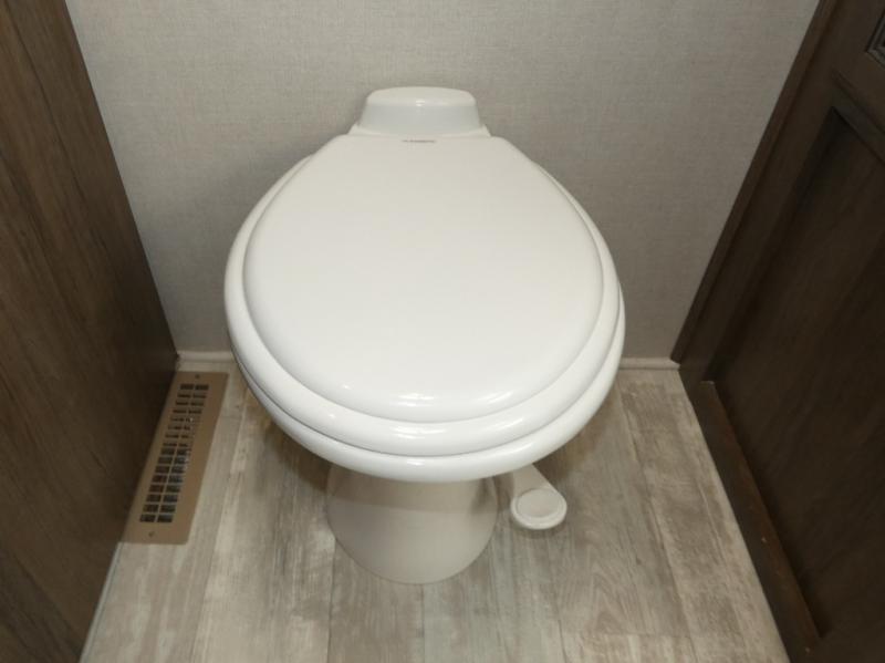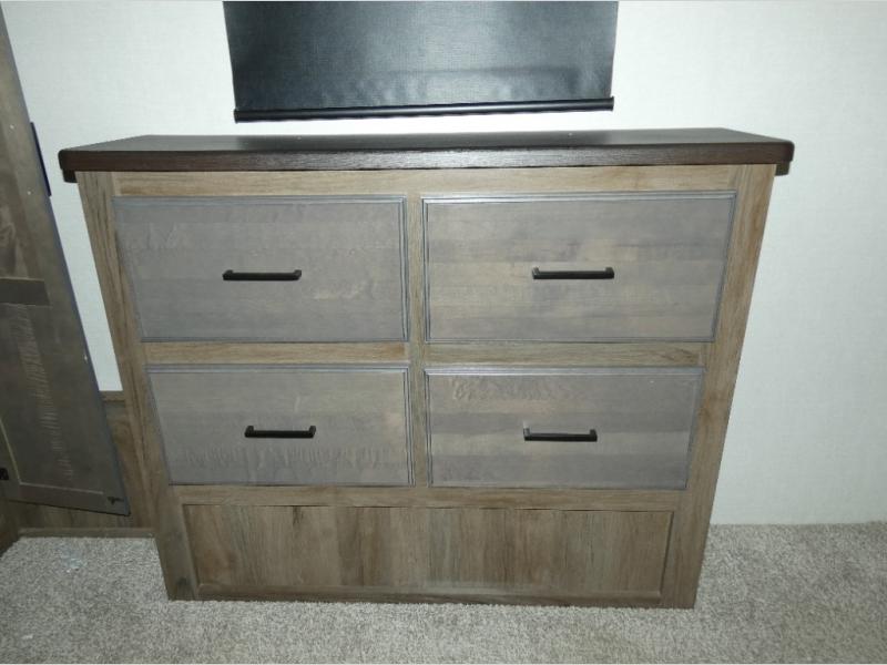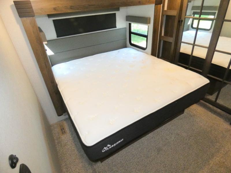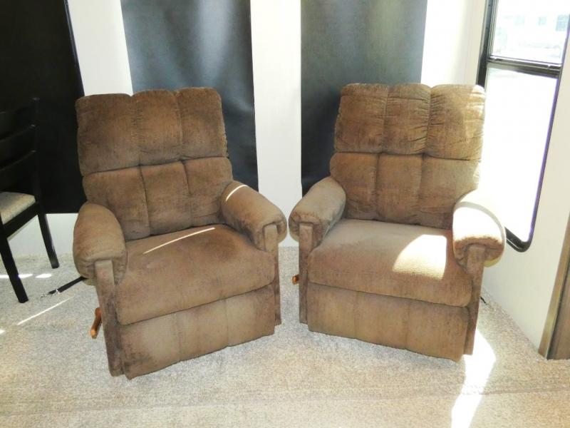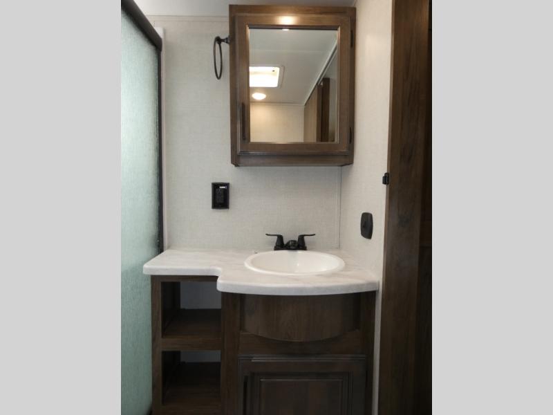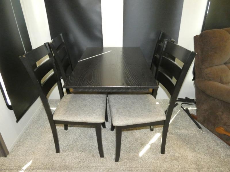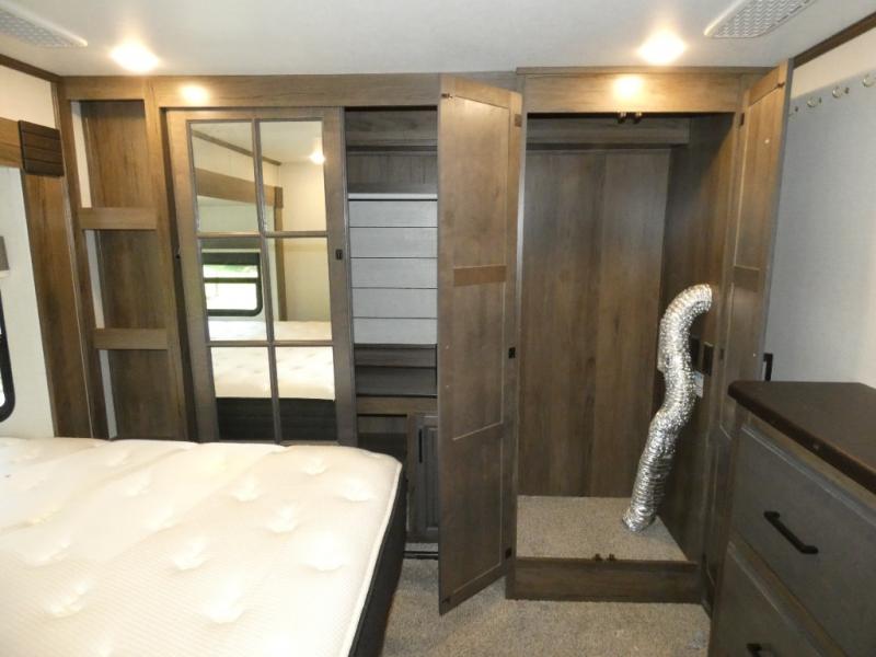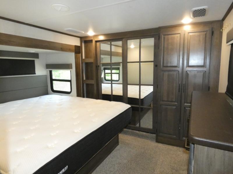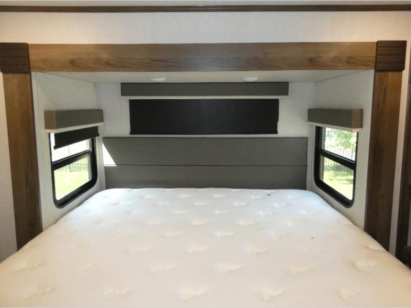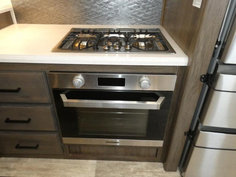 You won't be left wanting for any amenities in this comfortable fifth wheel. Once you arrive at your destination, your crew can relax in the rear living area that includes a rear entertainment center with a 50" TV on lift. The dual recliners, hide-a-bed L-shaped sofa, and dinette with chairs will provide seating for everyone, and the chef of the family can easily prepare meals in the spacious kitchen. There is a closet and a pantry to store paper goods and snacks, a residential refrigerator, and a Furrion oven and cooktop to make meals each day. After you've explored all day, freshen up in the full bath with a 40" shower with a seat, a deluxe "skyview" skylight, and a linen closet to store clean towels. The front private bedroom will feel like your own oasis with its slide out king bed, a large closet with shoe storage and sliding hardwood mirror doors.