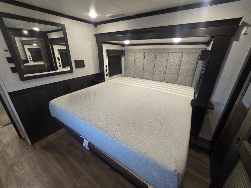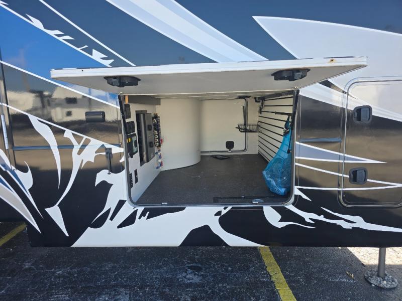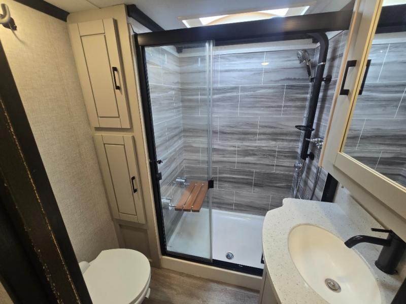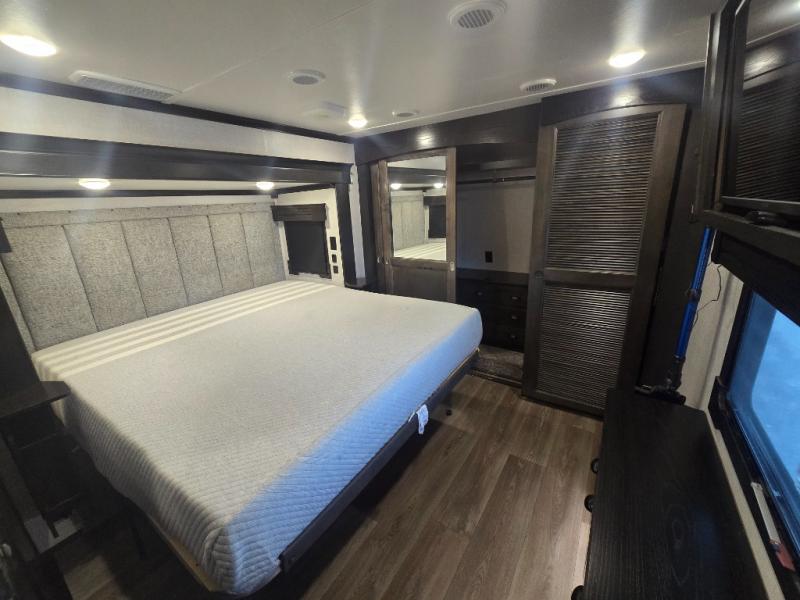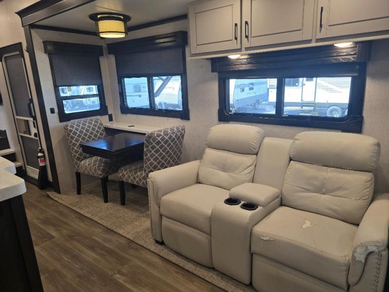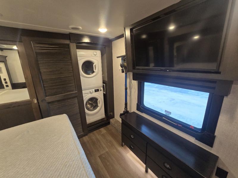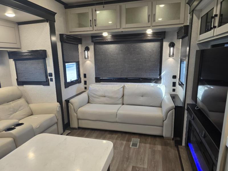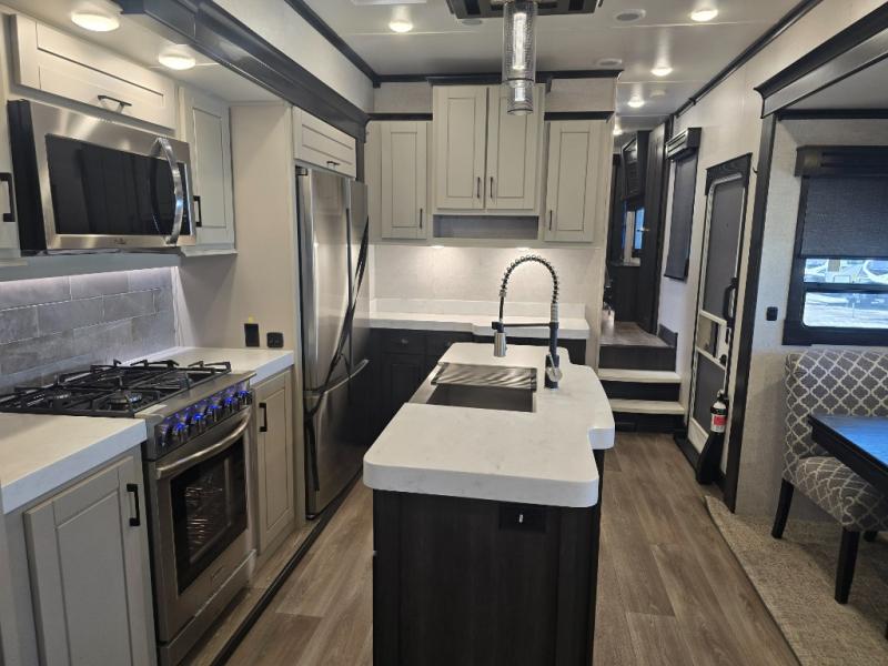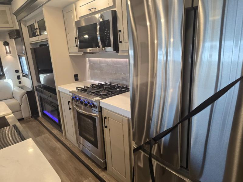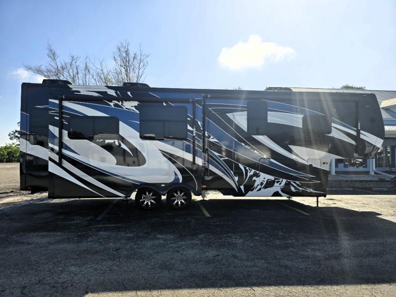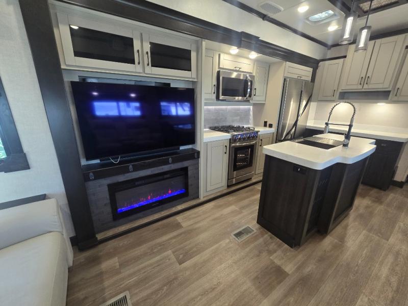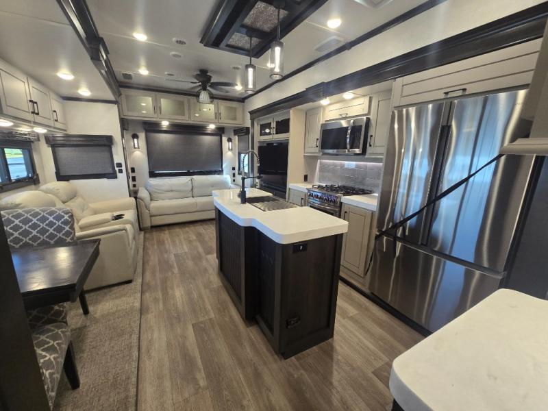 Come make this luxury fifth wheel your home away from home while you camp at your favorite campground! This model features triple slides, a rear living area with a sofa, and theater seats for movie night! Meal prep is a breeze in this residential kitchen. You will love all of the storage space with the residential refrigerator and overhead cabinets. The kitchen island provides extra counter space as well as over-island lighting that will make prepping dinner easier than ever. Head up the stairs and you will find the bathroom that features a domed shower skylight that provides extra standing room. This unit includes a front bedroom with a king bed, plenty of storage with a dresser, a large wardrobe, plus there is a spot for an optional stacked washer and dryer!