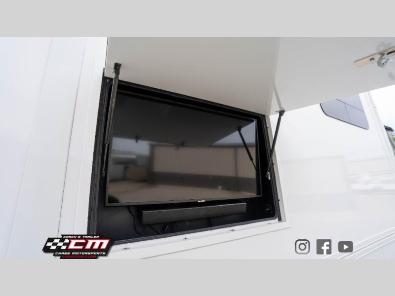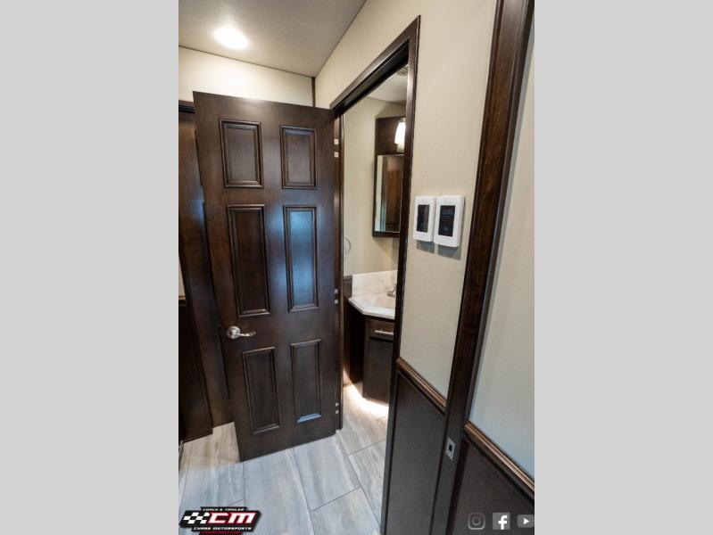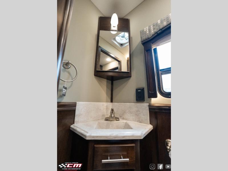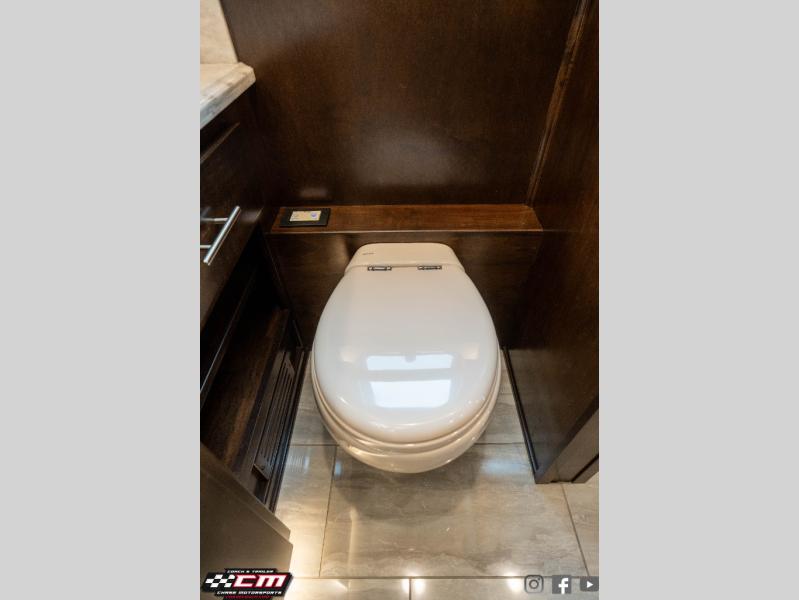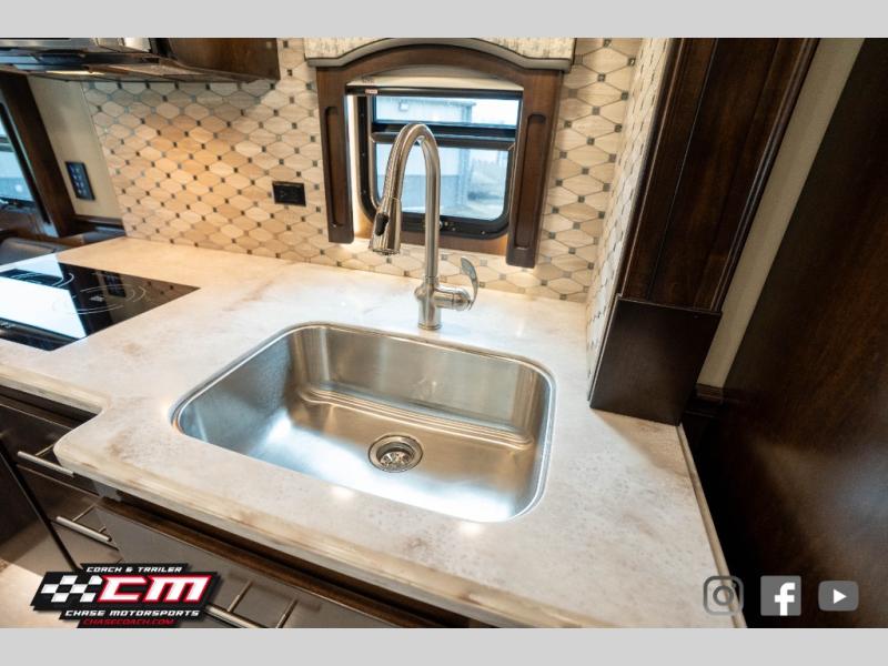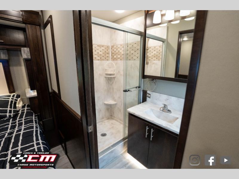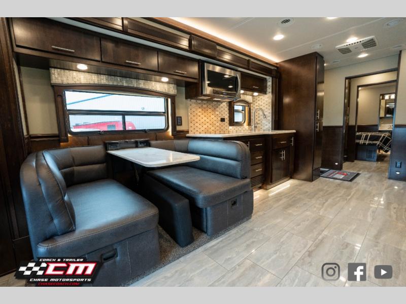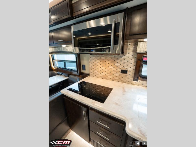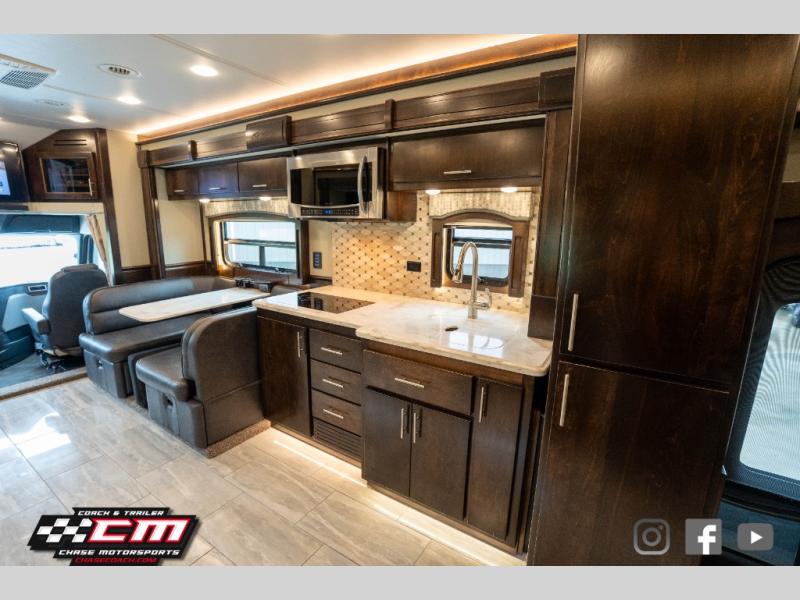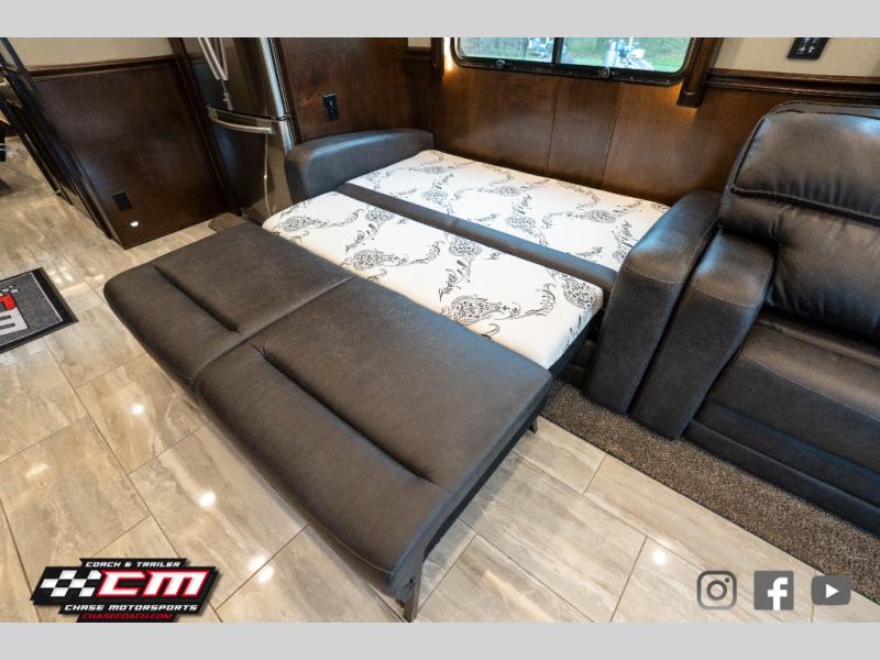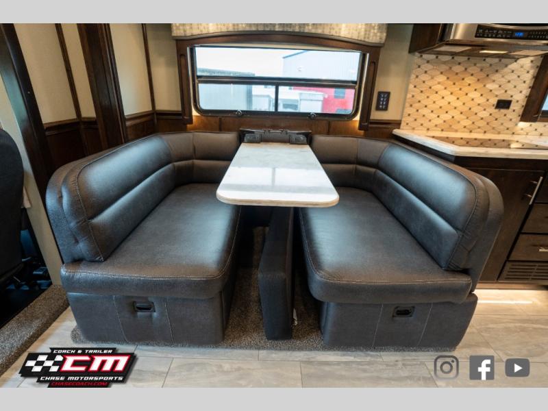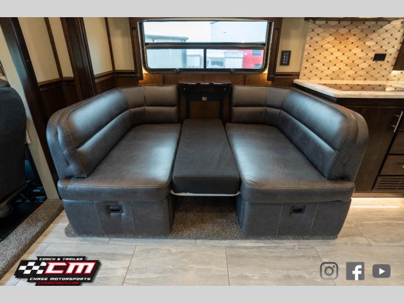 Pack your bags for a road trip in this four slide out coach! A mid ship half bath will make quick trips to the restroom easier than ever, and the full rear bath will create a master bedroom you are sure to love. Here, you'll sleep soundly on the 66" x 80" mini-king bed slide, store your clothes in the two bedroom closets, and watch a movie on the bedroom 4K Smart LED TV. Once dinner is made on the two-burner induction cooktop or in the stainless-steel convection oven, you can dine at the booth dinette, or head outdoors to relax under the roof mounted lateral arm awning with LED lights. There is also a sofa sleeper, loveseat, and bunk over cab for seating and sleeping space!