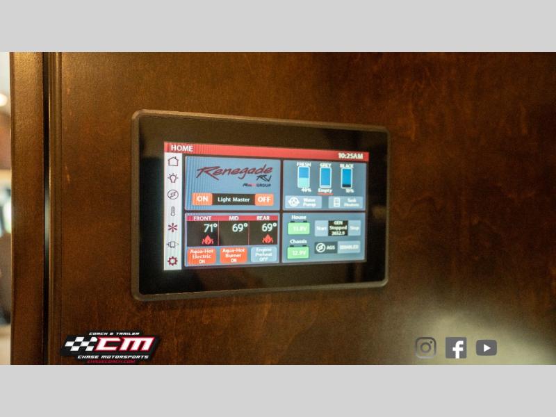 With any Renegade Classic Super C diesel motorhome toy hauler motorhome, you will enjoy luxury and versatility at every turn! First, choose between four chassis options that include a Freightliner Cascadia, Volvo VNR/VNL, Western Star, or a Peterbilt! Then you can choose from three stylish decor options and a wide variety of floorplan layouts to fit your needs. Each coach includes "Super Sandwich" floor construction, a roof mounted lateral 2-stage lateral arm awning with LED lights, and frameless dual pane tinted windows with screens. You will love the luxury interior with its grouted tile backsplash in the galley, memory foam mattress in the bedroom, and solid surface shower with wall tile inlay and a sliding glass door in the bath. There are also color rear and side view cameras for easy maneuvering and a rear air suspension for the smoothest ride around!
