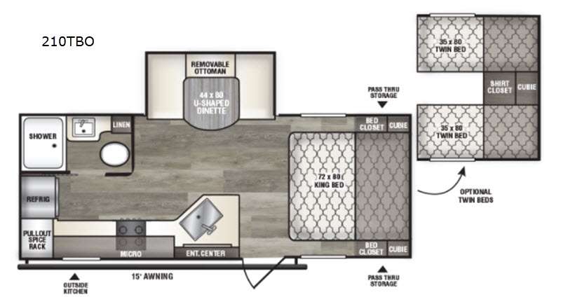 This travel trailer will feel more like home with its king bed for maximum comfort. If you plan to camp mostly with friends, you may want to choose the optional twin beds in place of the king bed for your convenience. You will appreciate the two bed closets on both sides of the bed, plus two cubbies to store special belongings, and the exterior pass-through storage will be perfect for large camp gear. This model features a slide out U-shaped dinette for meal times, game night, and additional sleeping space, and the entertainment center with an LED TV will allow you to watch a movie at night. The indoor kitchen includes plenty of counter space and a convenient pull-out spice rack, and the outside kitchen will be great for cooking breakfast outdoors!