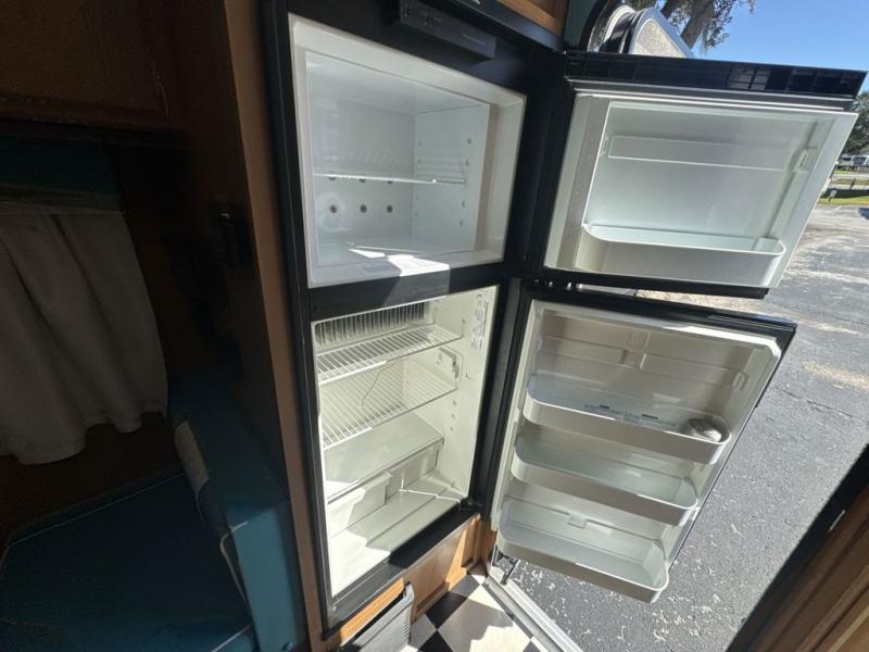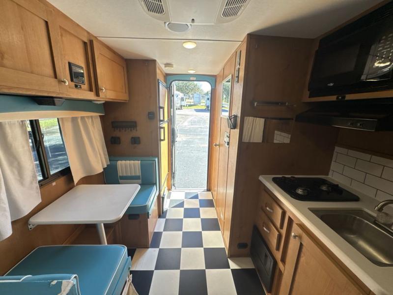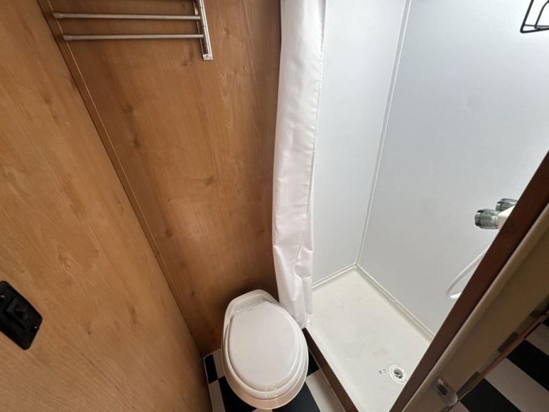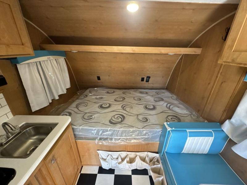 This Retro is the perfect classic travel trailer for you and your spouse. You will have your own RV queen bed up front and a sofa for comfortable seating space. Prepare breakfast on the two-burner cooktop, or use the microwave oven for instant oatmeal. You can clean up in the private bath that includes a shower and a toilet, while your spouse brushes their teeth in the sink within the trailer. This model also includes a power awning with an LED light strip so that you can enjoy a drink outdoors in the evening.