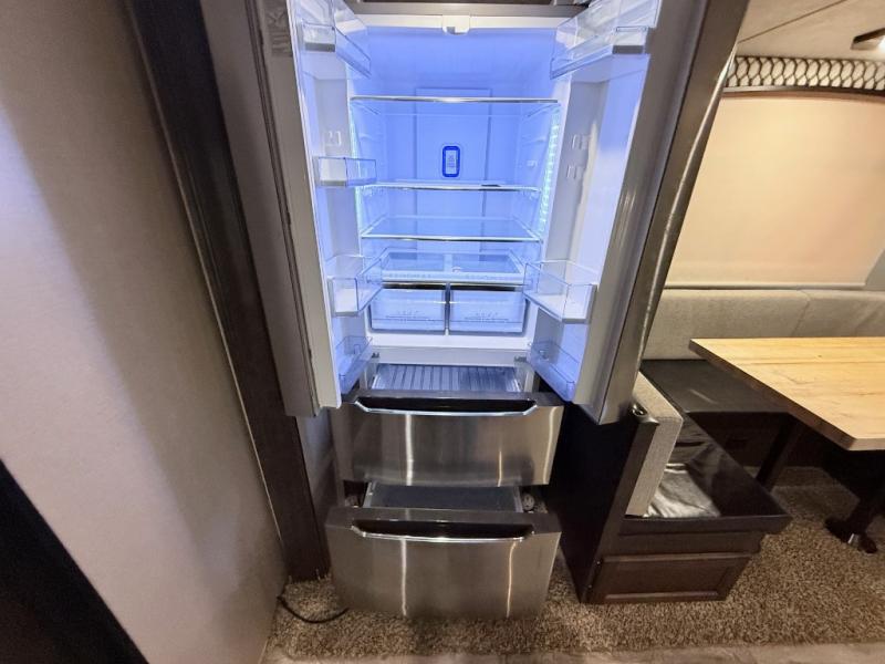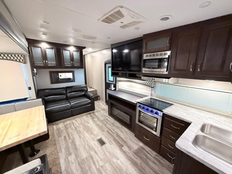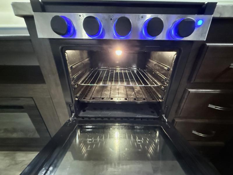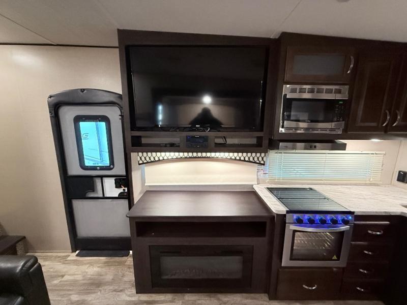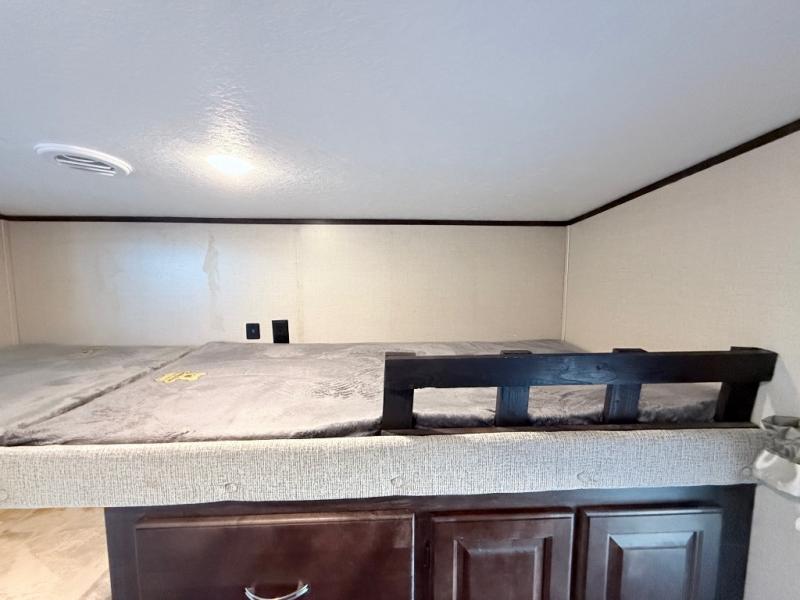 The whole family will love camping in this fifth wheel that can sleep nine people each night. The bunkhouse includes three bunks for the kids, and you and your spouse will love the front private bedroom for yourselves. There is also a tri-fold sofa and a U-shaped dinette in the living room for more sleeping space. You will have all the appliances needed to prepare meals each day, whether that be indoors, or outdoors on the outside kitchen. The full bath includes a shower with a seat for convenience and motion sensor lights for nighttime use!