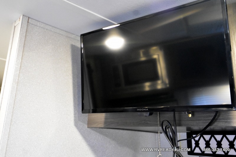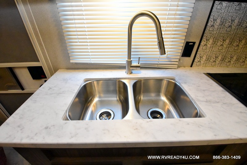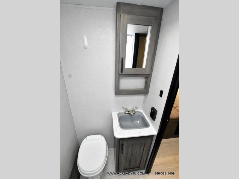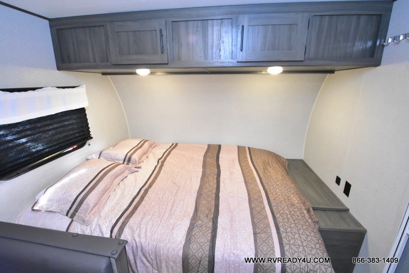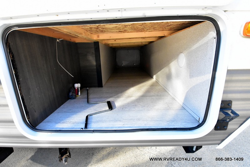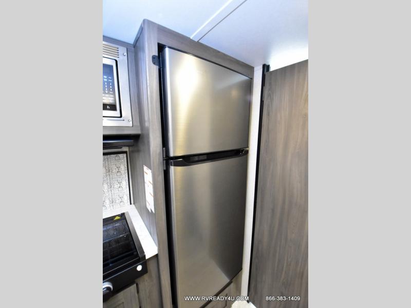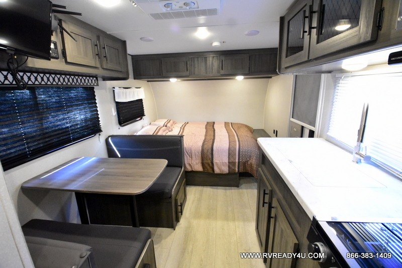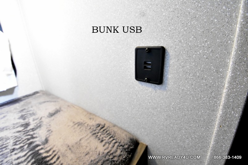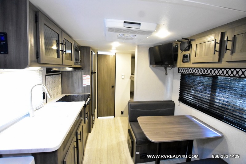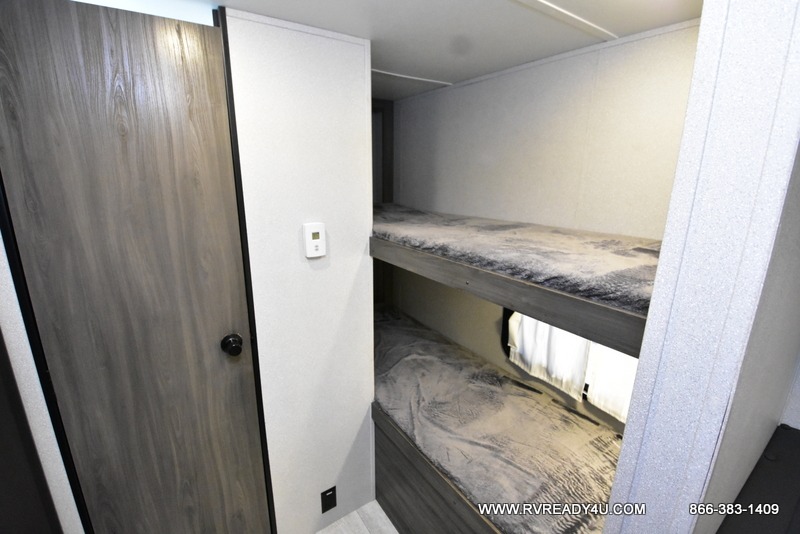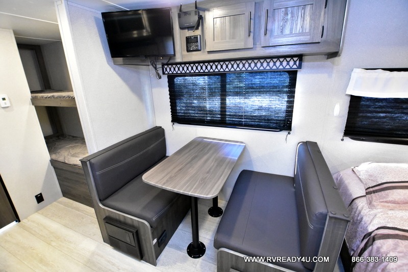 The kids or your friends will love camping in this travel trailer! It features a set of rear corner bunk beds with storage that are next to the full bathroom for easy access at night. There is also a 60" x 74" bed up front with an overhead cabinet, and the booth dinette can also transform into an extra sleeping space, plus it has an overhead entertainment. The kitchen has everything you will need to whip up a home cooked meal, as well as a microwave for those nights when you don't feel like cooking!
