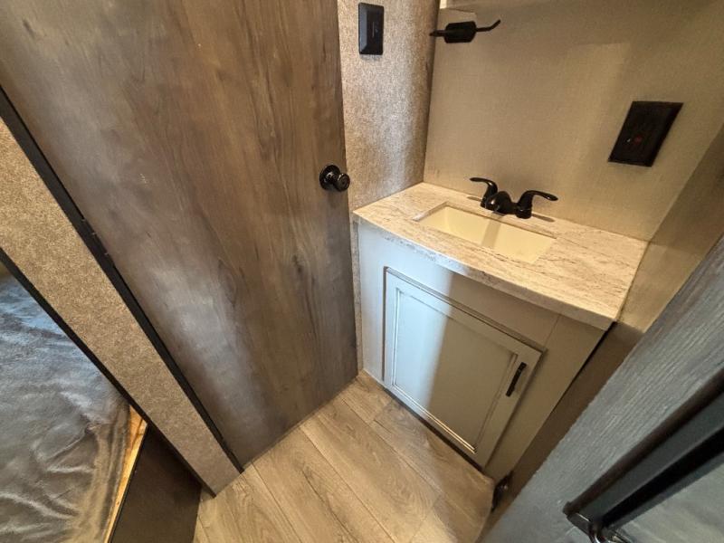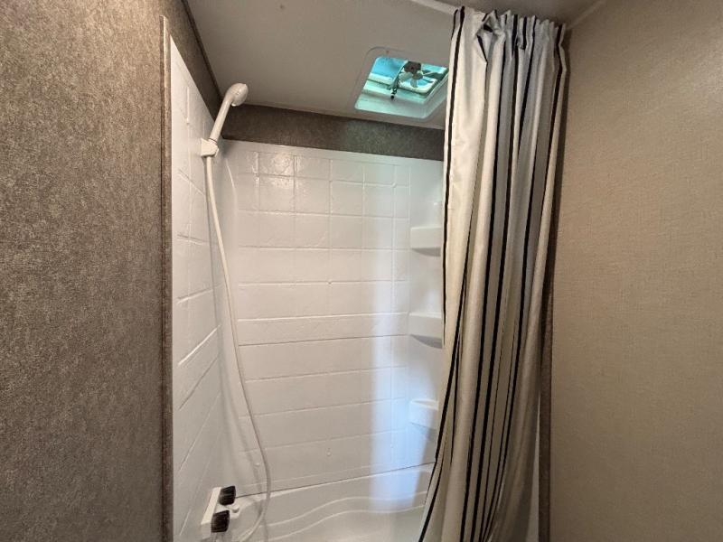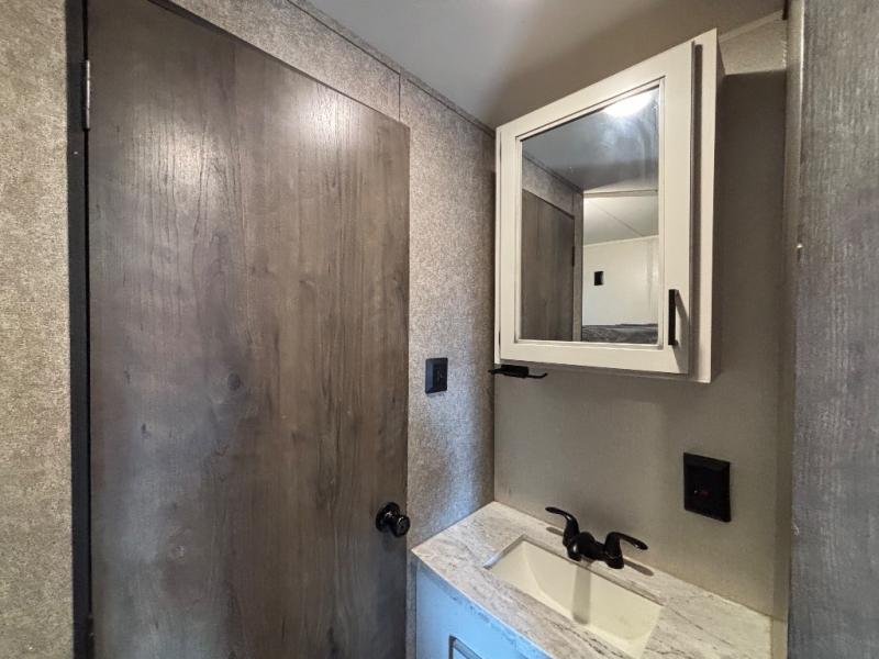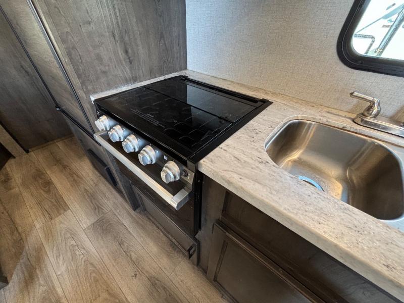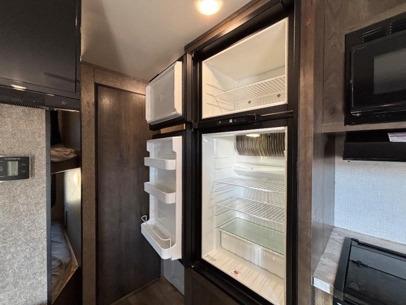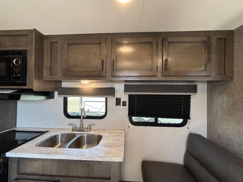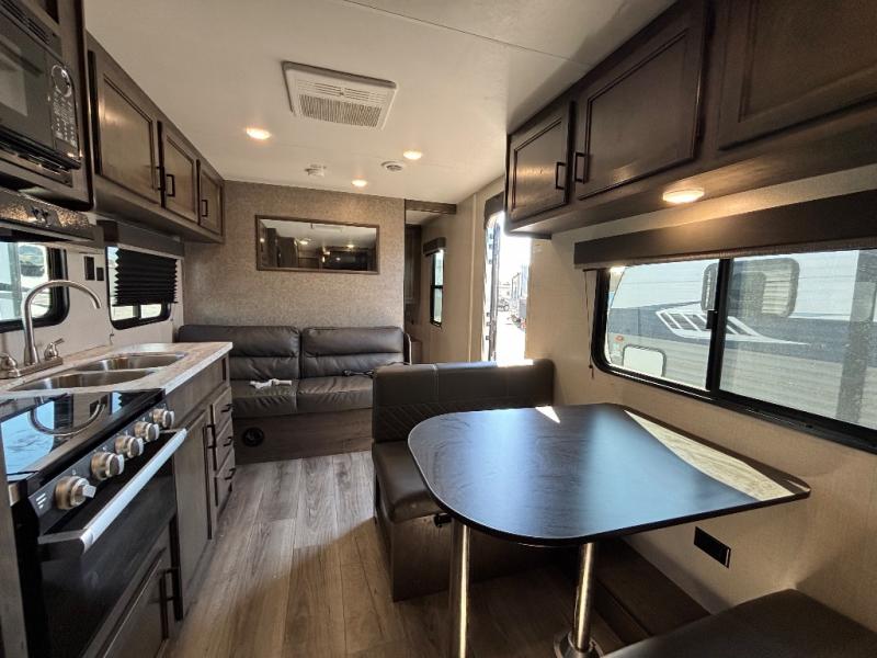 When you walk through this Autumn Ridge travel trailer, you'll notice all of the many different sleeping areas that it has to offer, like a queen-size bed in the front private bedroom, a jackknife sofa and booth dinette in the central living area, and a set of double-size bunks in the back. The private bathroom is conveniently located next to the bunks, and it also offers a bathroom sink just outside the door. It won't be any trouble to create home-cooked meals for you and your family with the three-burner range and 17" oven in the kitchen, and the residential high-rise faucet will make it a simple task to clean up afterwards.