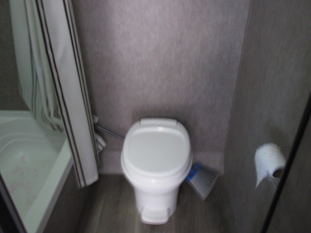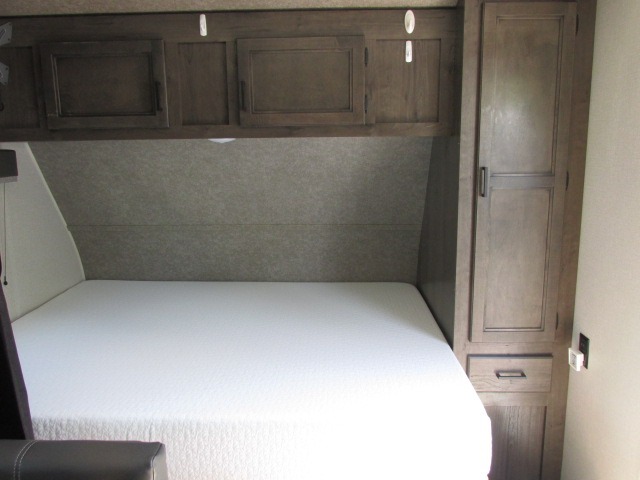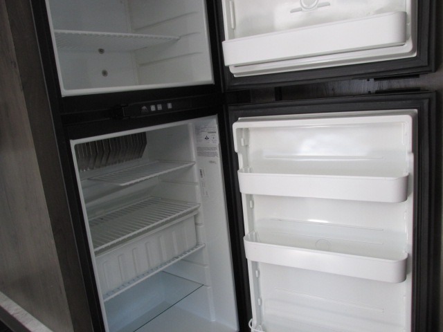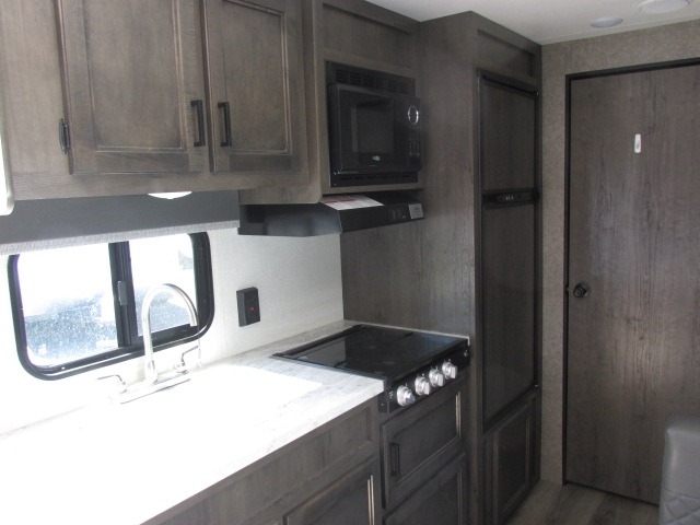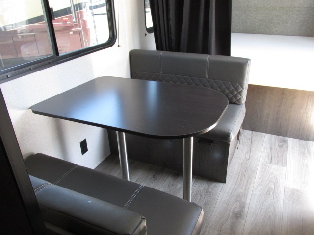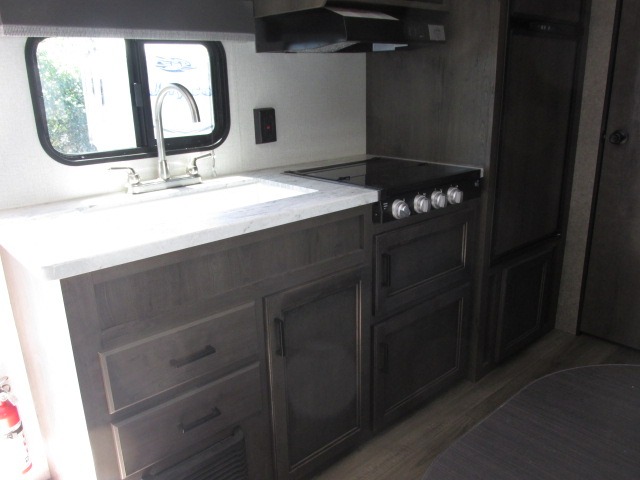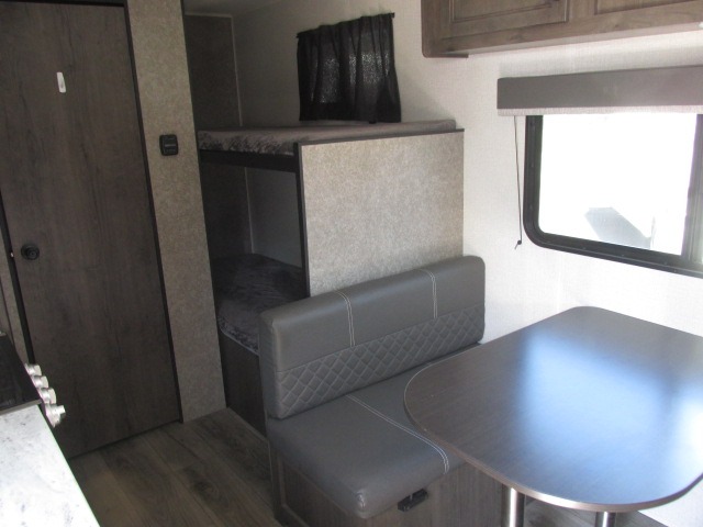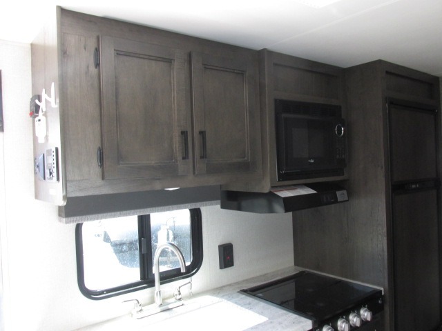 This family and pet friendly trailer offers sleeping space for five to six people between the front bed, the rear corner bunk beds and the booth dinette when set up for bedtime. You can choose to dine inside or outside under the 13' power awning with LED lighting for nighttime meals and integrated speakers for outdoor music. The cook will enjoy the galley kitchen with a microwave and range, plus the 12V refrigerator or choose to replace it with a 6 cu. ft. gas/electric fridge option. And find privacy when getting ready for bed or the day in the rear corner toilet and tub/shower room.