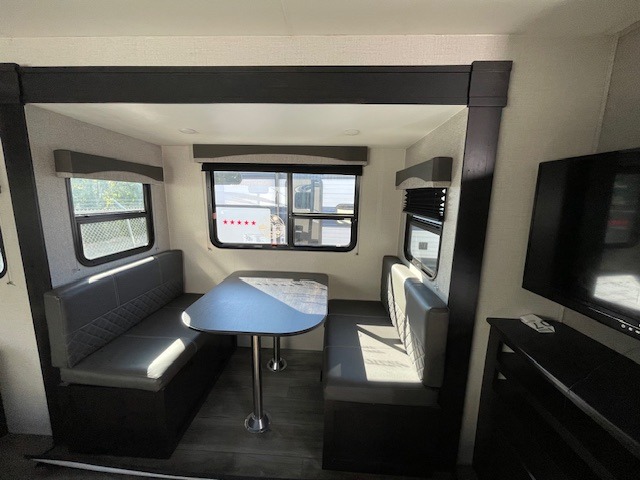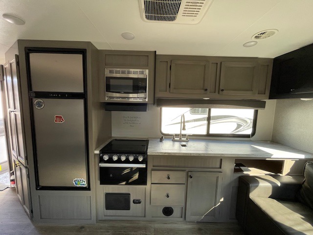 Start planning your next camping trip in this Super Lite travel trailer that includes a slide out for more interior space. You'll find plenty of seating space at the booth dinette or on the tri-fold sofa, and these areas can convert into sleeping space for your guests or kids! Prepare dinner on the three-burner cooktop or use the convenient microwave oven. This model features a dual-entry bath with access into the front private bedroom which creates a master suite that you are sure to appreciate.