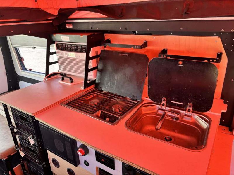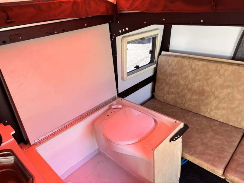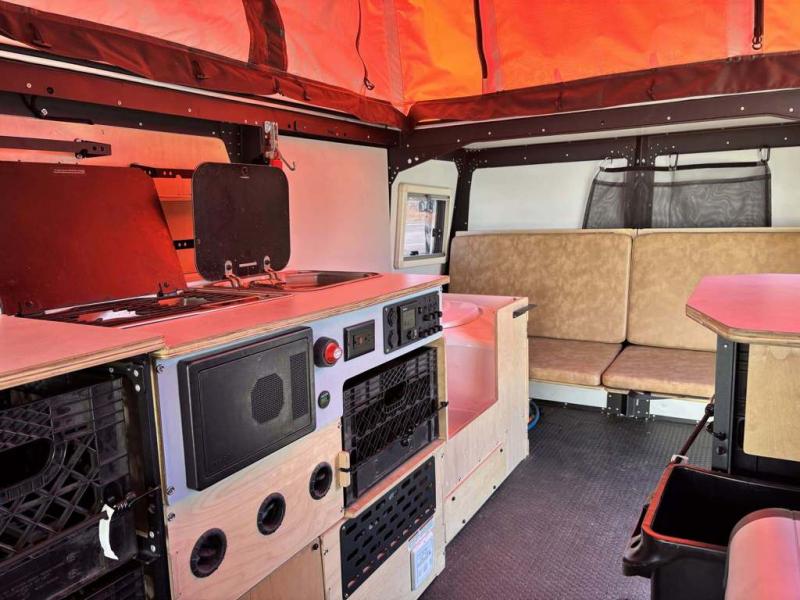 This Mantis travel trailer is perfect for you and your spouse on your next big adventure. You will feel right at home with the full-size bed that includes convenient under-bed storage, and you can invite more friends along by adding the optional folding couch/bunk bed system or the optional rooftop tent. Prepare eggs and bacon on the two-burner stove and easily clean up in the sink. The café table provides a place to dine, or you can enjoy the fresh air outdoors as you sit under the 8' patio awning. This model includes many convenient features, such as a 16-gallon trash can, a rear hatch for access and ventilation, and a storage tower with three milk crates for snacks, flashlights, and the first-aid kit! You can even choose to add the optional wet bath with a cassette toilet and a shower to stay clean throughout your whole trip!