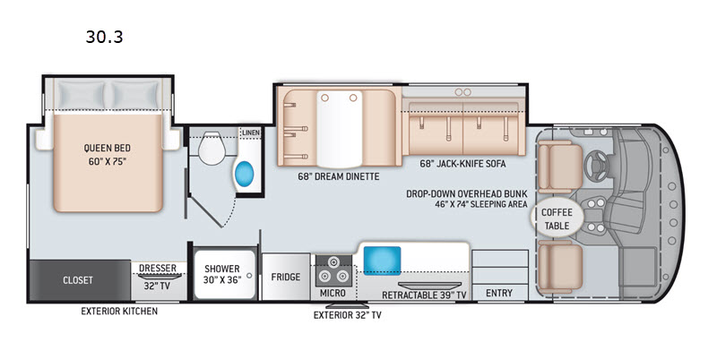 | TV Info | LR 39" Retractable LED TV, BR 32" LED TV, Ext. 32" LED TV |