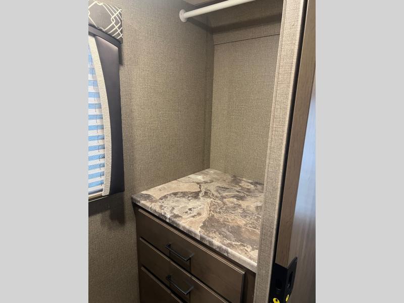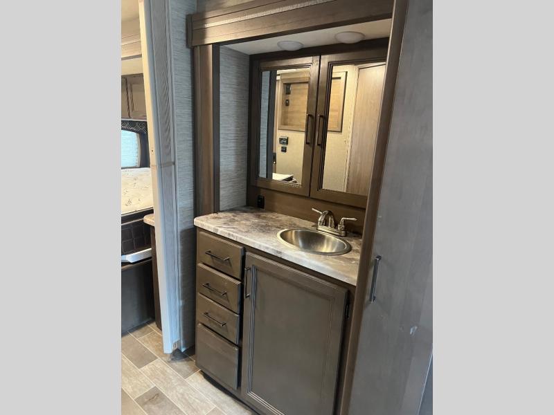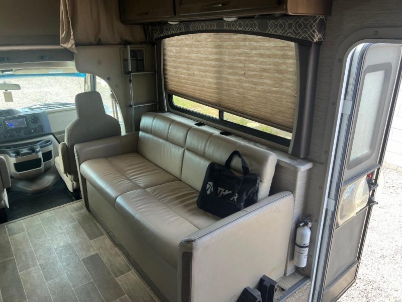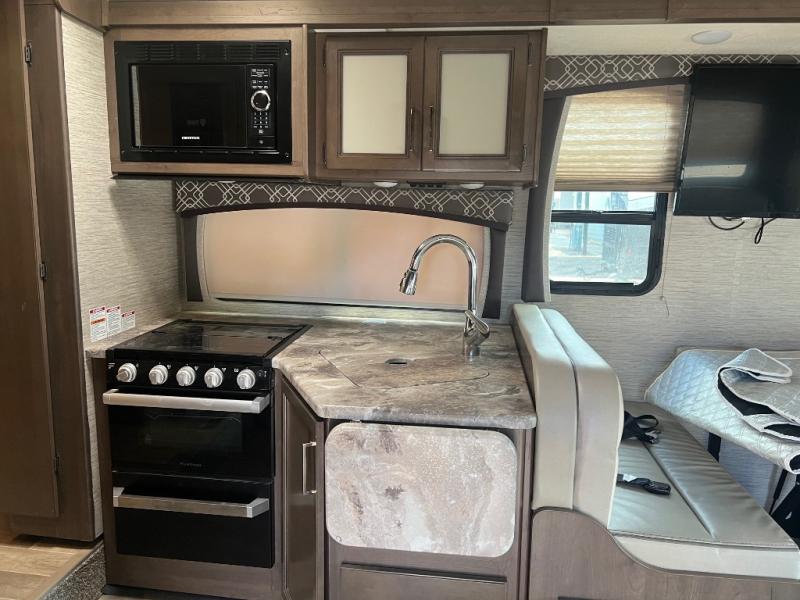 Whether you're taking your family or group of friends out to the campsite, this Chateau Class C gas motorhome is the reliable friend you want to tag along! This coach will provide you with a two-burner gas cooktop and single induction cooktop and convection microwave in the kitchen so that you can prepare all of your favorite dishes, and you will also find plenty of entertainment with the 32" TV in the rear private bedroom and the 39" TV across from the 68" jackknife sofa in the main living area. Since this model also comes with the Premier Package, you will find extra touches that will make this coach even more fabulous, like solid-surface countertops in the kitchen and premium window privacy roller shades. You can also find this layout available at a more value-friendly price point if you take a look at 31BV.