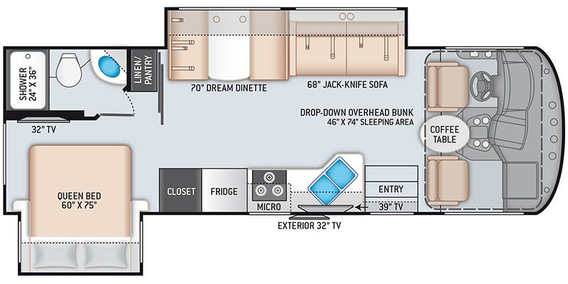 | TV Info | LR 39" LED TV, BR 32" LED TV, Ext. 32" LED TV |