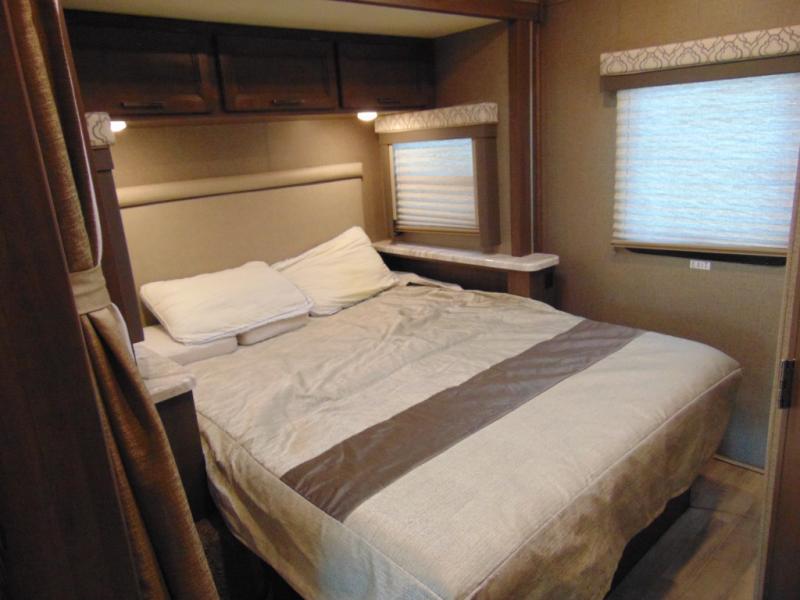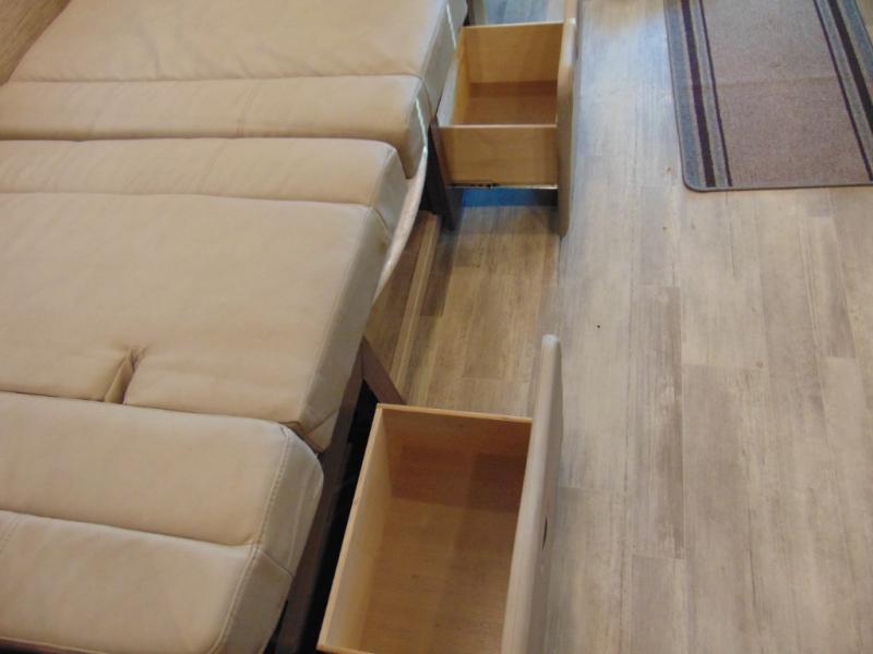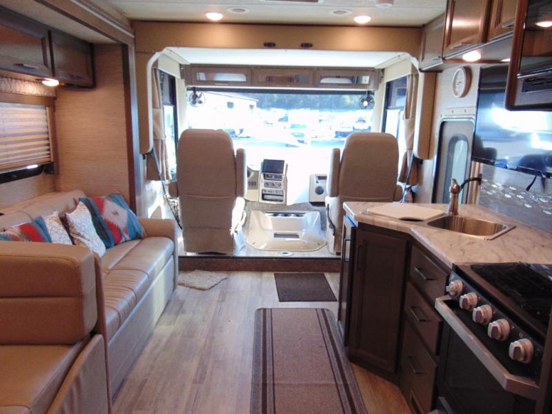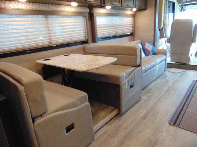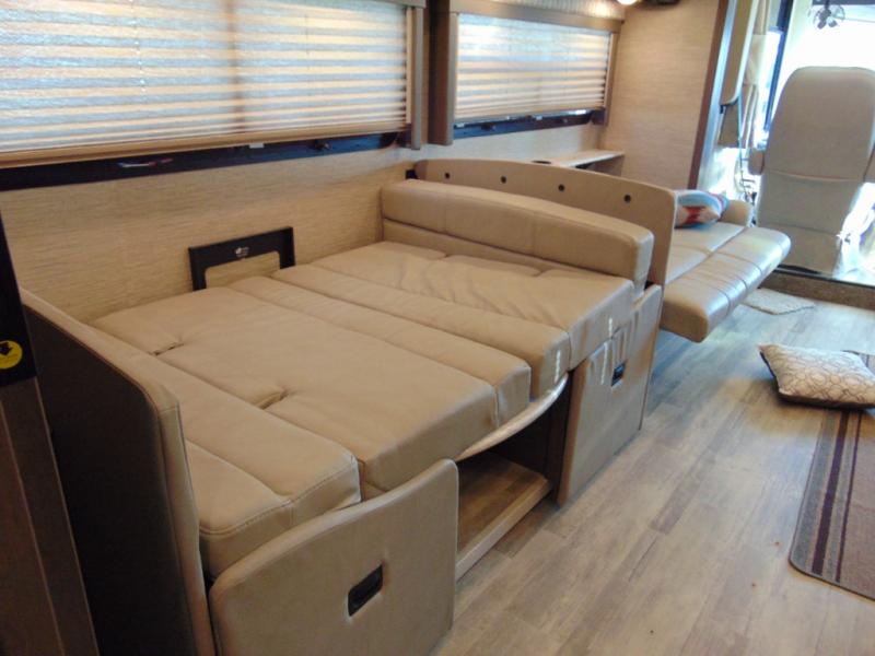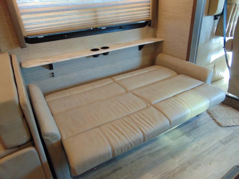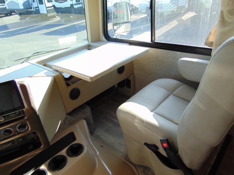 Searching for the perfect Class A motorhome to take across the country? Just imagine drinking your morning cup of coffee in the captain's chairs while placing your book on the stow-away coffee table. You might even choose to complete some work at the dash workstation with 110V and 12V outlets while your spouse takes a walk around the RV park. When it's time to make breakfast, you will find full kitchen amenities, plus you can watch the Large LED TV while dining or relaxing after cooking. This model includes plenty of storage space, including a large slideout that includes a sleeper sofa and sleeper dinette with lots of storage. You will also find your own queen-size bed slideout and a full bathroom, plus extra sleeping space for overnight guests.