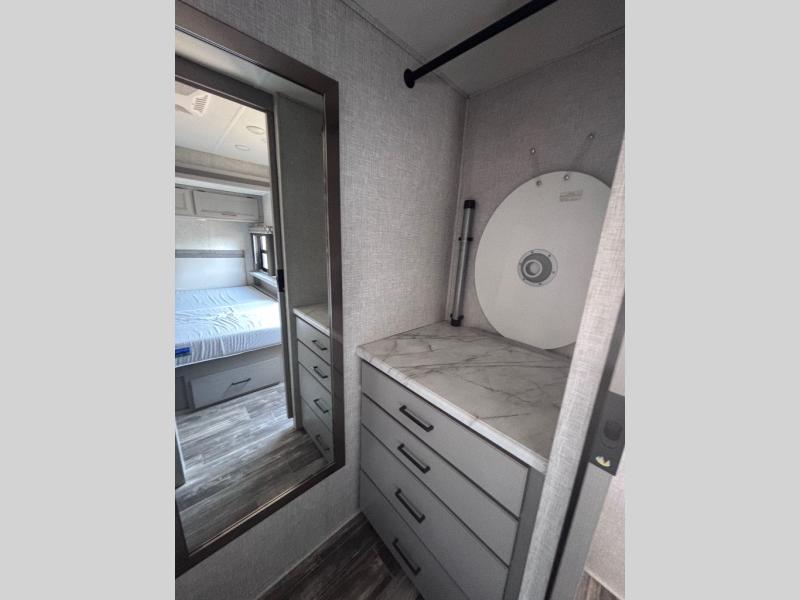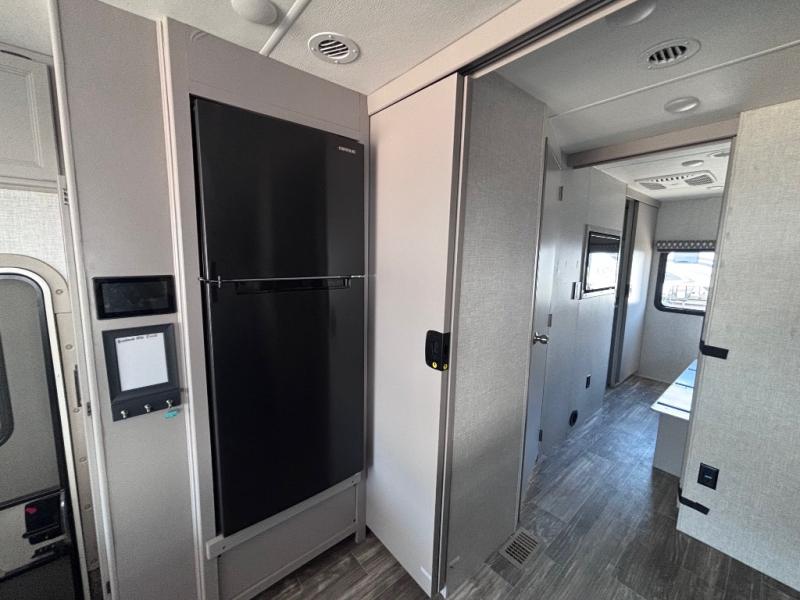 If you are looking to upgrade your adventures, choose to do so with this Hurricane Class A gas motorhome! This coach will give you many conveniences that you've always hoped to have, like a walk-in closet and a king bed slide in your own private bedroom, a huge slide in the main living area for extra space, a 70" Dream Dinette for easy dining, and three LED TVs for excellent entertainment all throughout your trips. Plus, this coach also comes with extra sleeping space for family or friends with the 54" x 74" drop-down bunk above the cab and the 68" sofa bed. Up in between the reclining/swivel cab seats, you'll find a coffee table which creates an additional lounge area in this coach, and there is also a broom closet right next to the residential refrigerator in the kitchen.