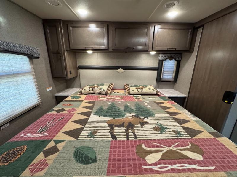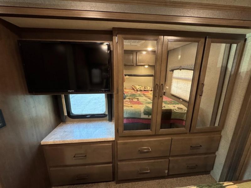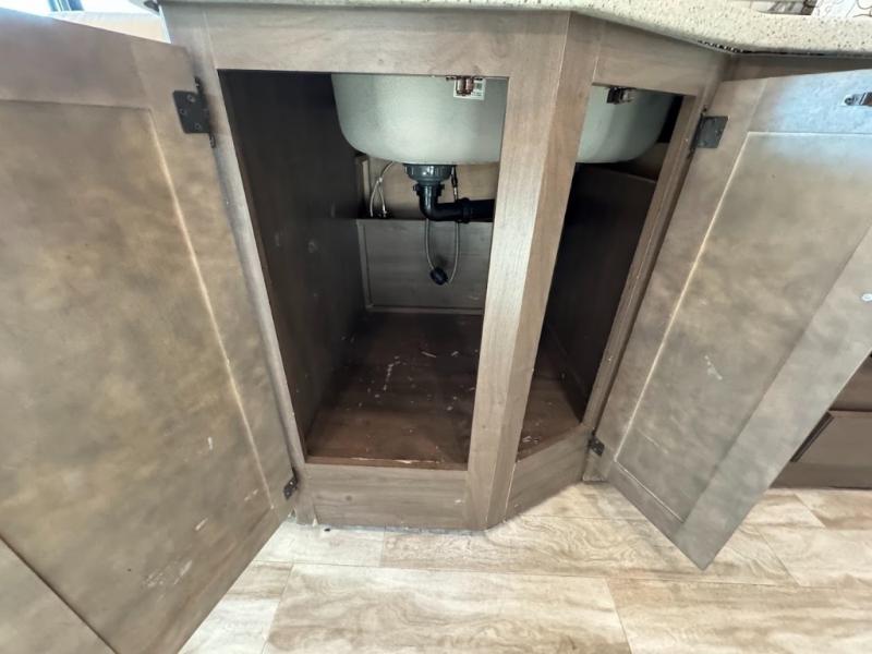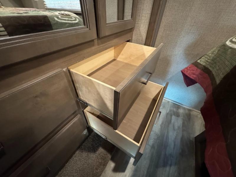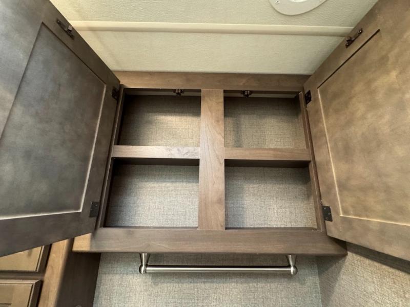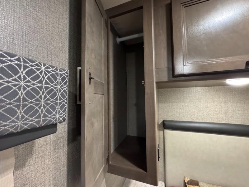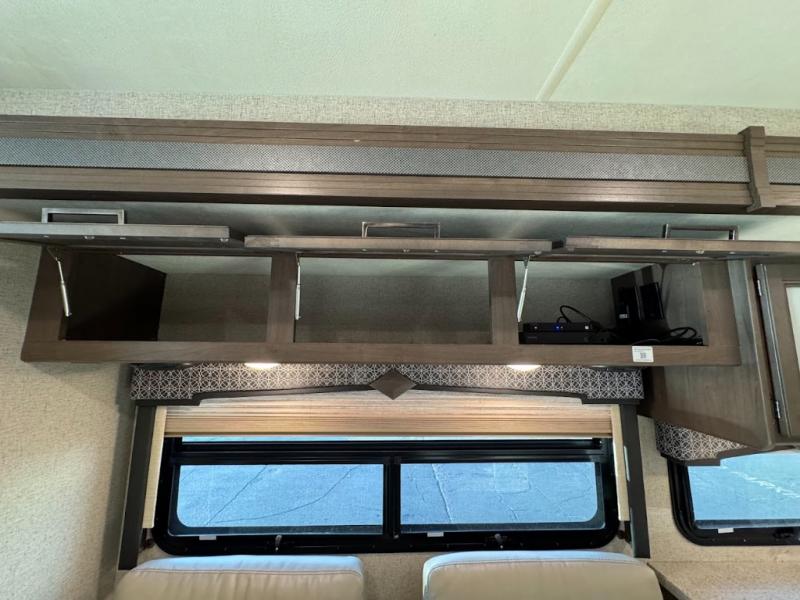 You can enjoy the journey as much as the destination when sitting on the comfortable captain's chairs in this Hurricane Class A gas motorhome. The chairs swivel to be able to visit with your family in the main area once you have arrived to your campsite, and the 68" sofa bed, Dream dinette, and theater seating with footrests will offer your family and guests plenty of seating. The kitchen and the full bath allow you to make meals, store leftovers in the residential refrigerator, and get cleaned up before bedtime. When it's time to turn in for the night, you will find a king bed and a 32" TV in the rear bedroom with a sliding door for privacy. You might even like to add the optional washer/dryer in the closet space, and the kiddos will love the drop-down overhead bunk to sleep on at night.
