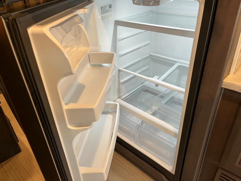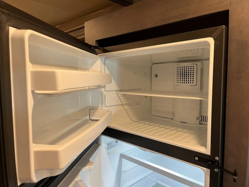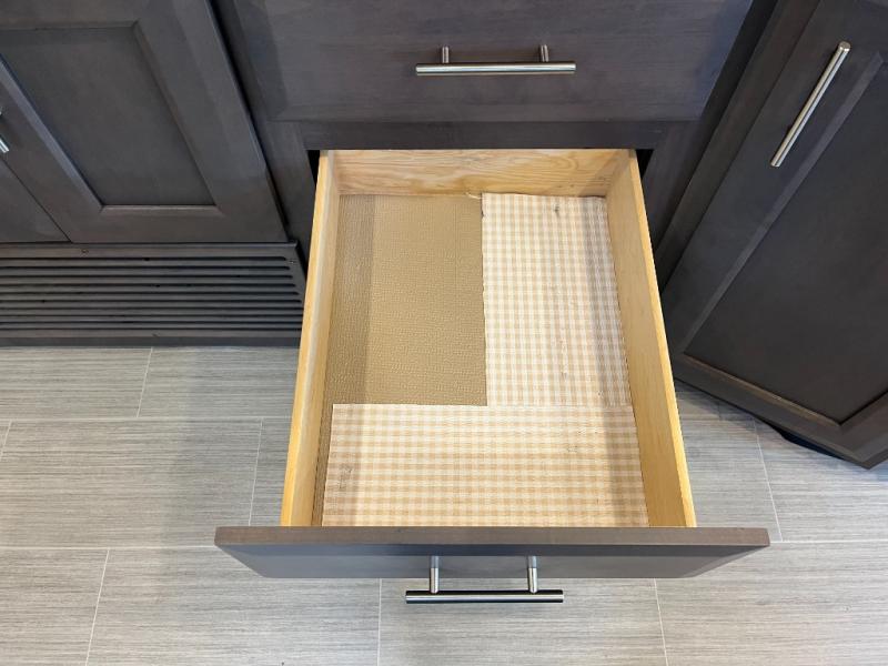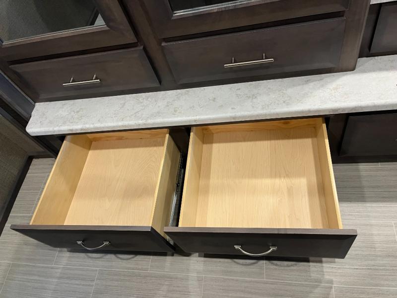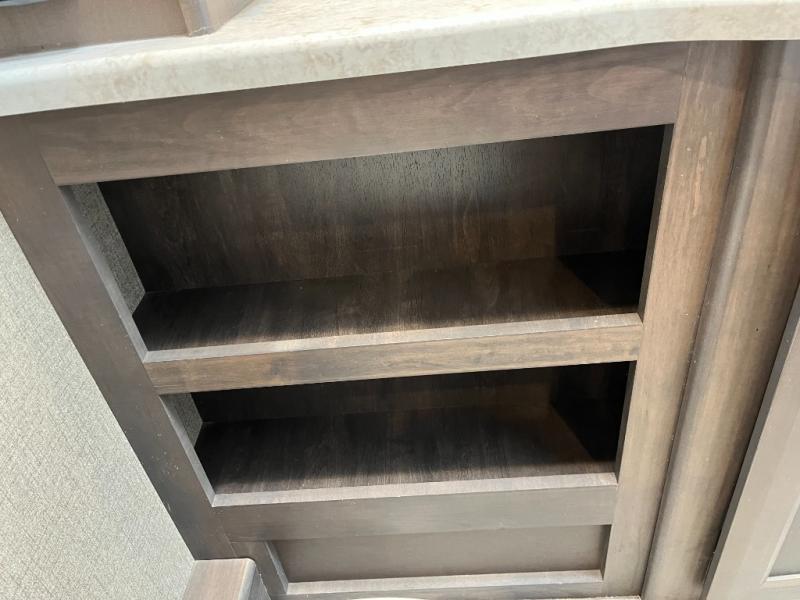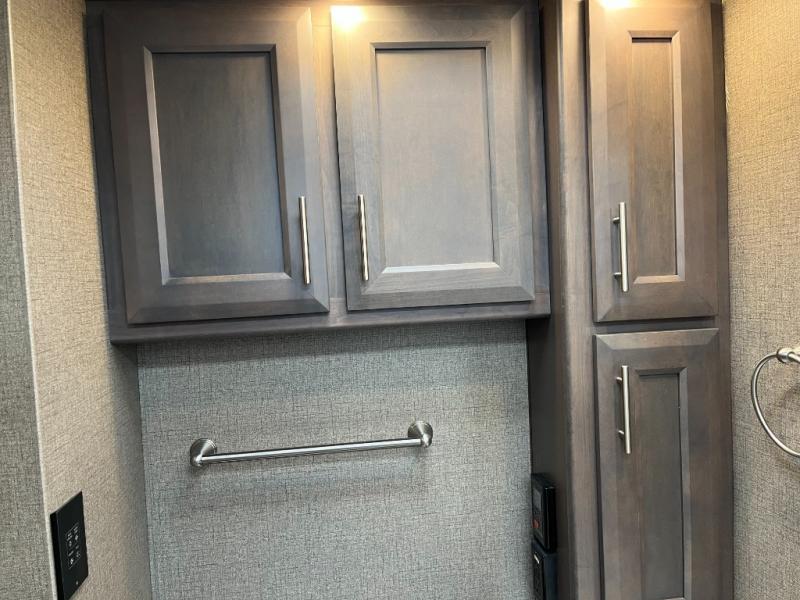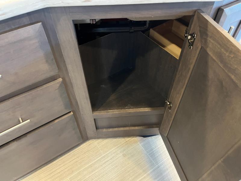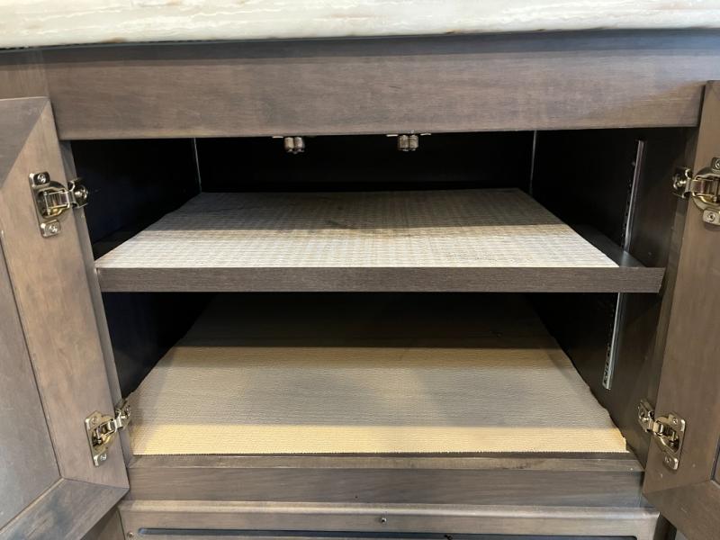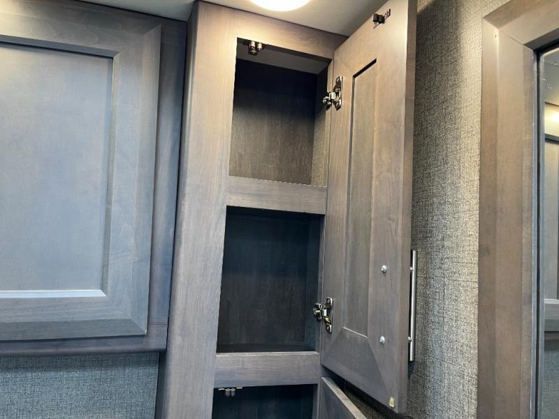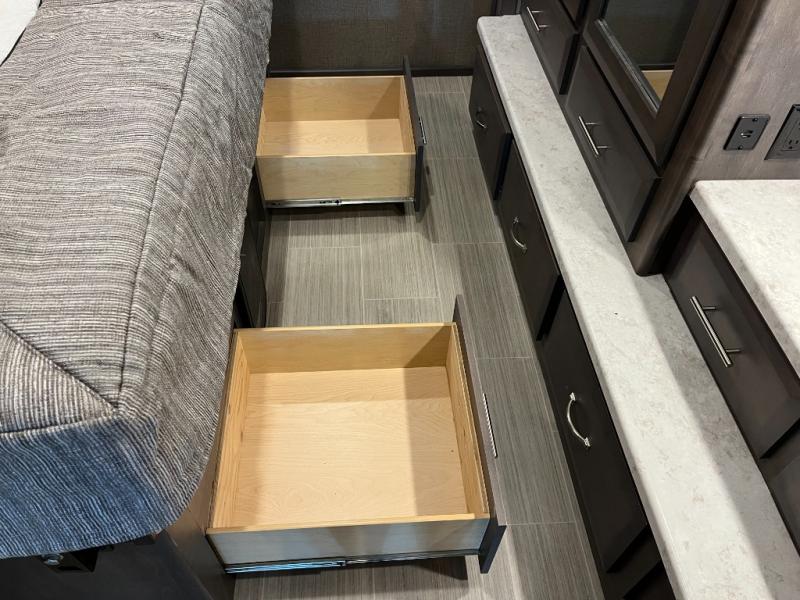 The kitchen in the Magnitude SV34 is designed for everyday convenience and meal-time flexibility. Featuring a three-burner cooktop, oven, microwave, residential-style refrigerator, and ample counter space, this setup lets you prepare everything from quick snacks to full family dinners with ease. Thoughtful storage keeps cookware and pantry items organized and ready to use.
