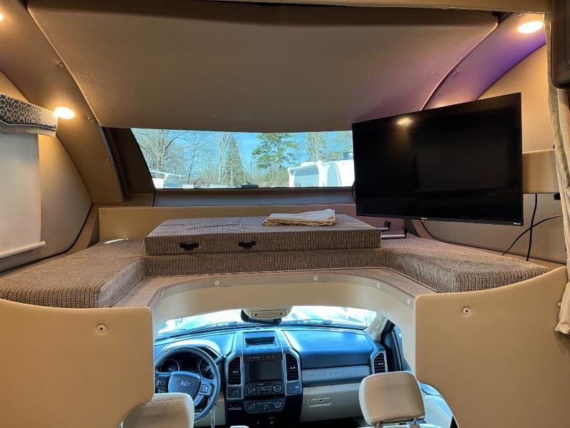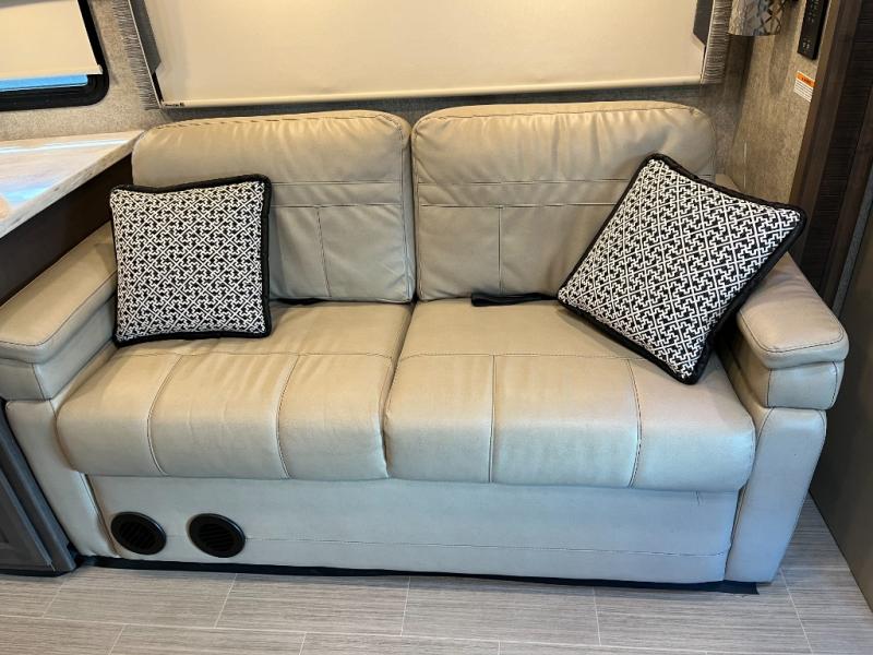 Step inside and feel immediately at home in the open, well-appointed living area. Plush seating, including theater recliners and a convertible sofa, creates a cozy environment perfect for relaxing after a day of exploring. Large panoramic windows bring in natural light and offer scenic views from every campsite, making the living space feel expansive and inviting.