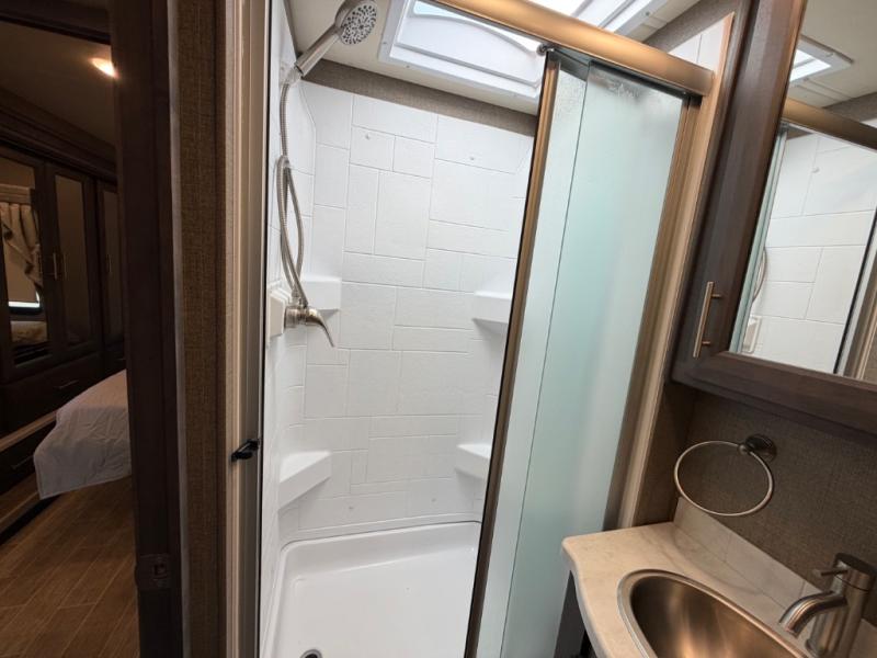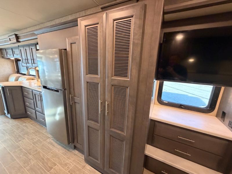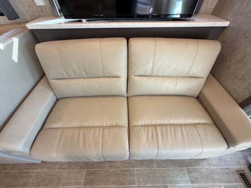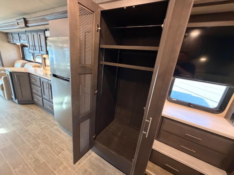 Whether you travel in this coach for long periods of time or for weekend getaways, you will find that the entire motorhome is spacious with a full wall slide out, and a second smaller slide in the main living area. As the cook makes meals in the kitchen with a residential refrigerator to store lots of cold items and beverages to the convection microwave, you can relax on the dinette, the theater seats or the sofa bed while watching either the 39" LED TV or the retractable 49" LED TV. The kids will love sleeping on the drop-down overhead cab bunk and on the furniture once set up for bedtime so they have their own room while you enjoy the rear bedroom which offers a Tilt-A-View inclining king bed.
