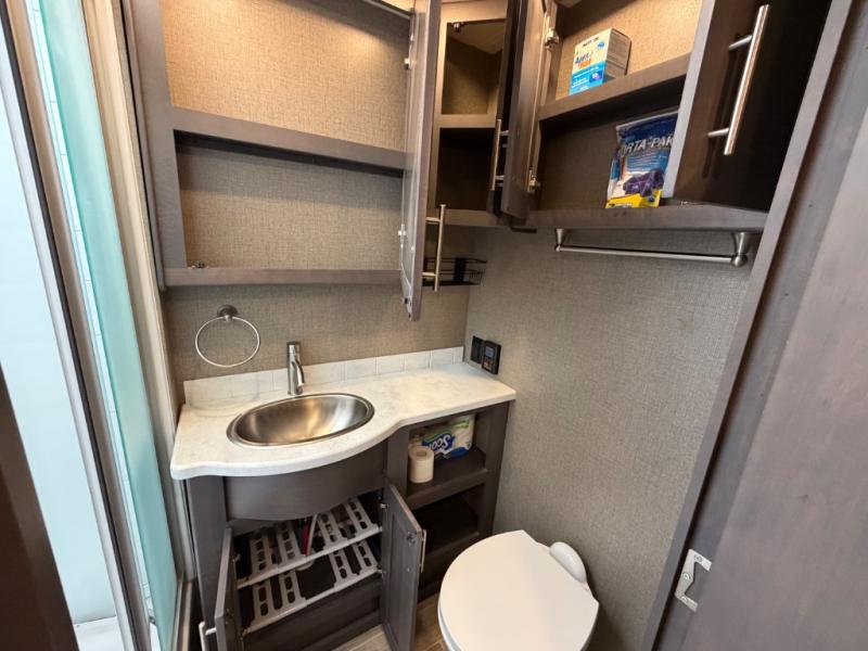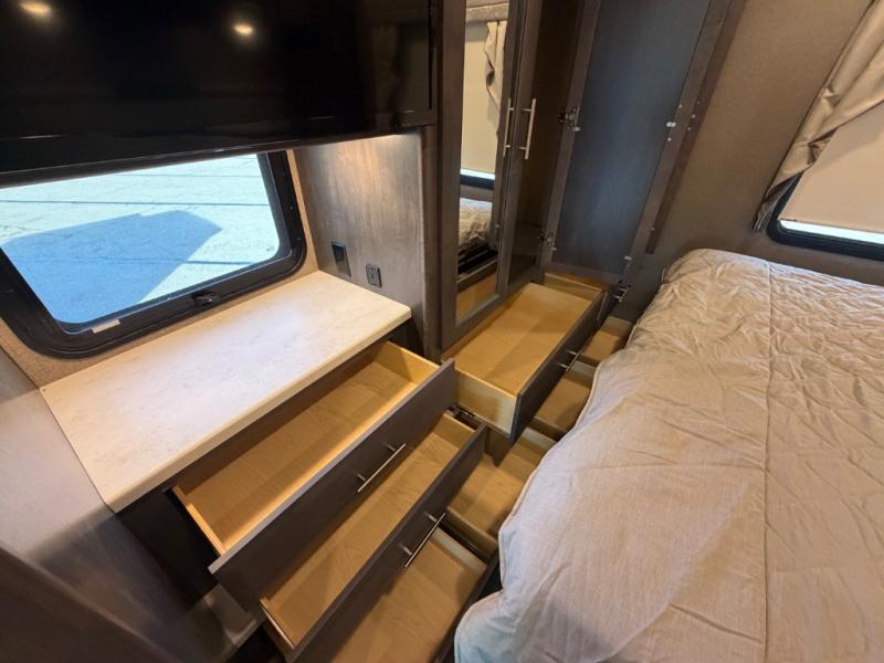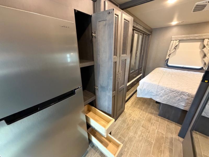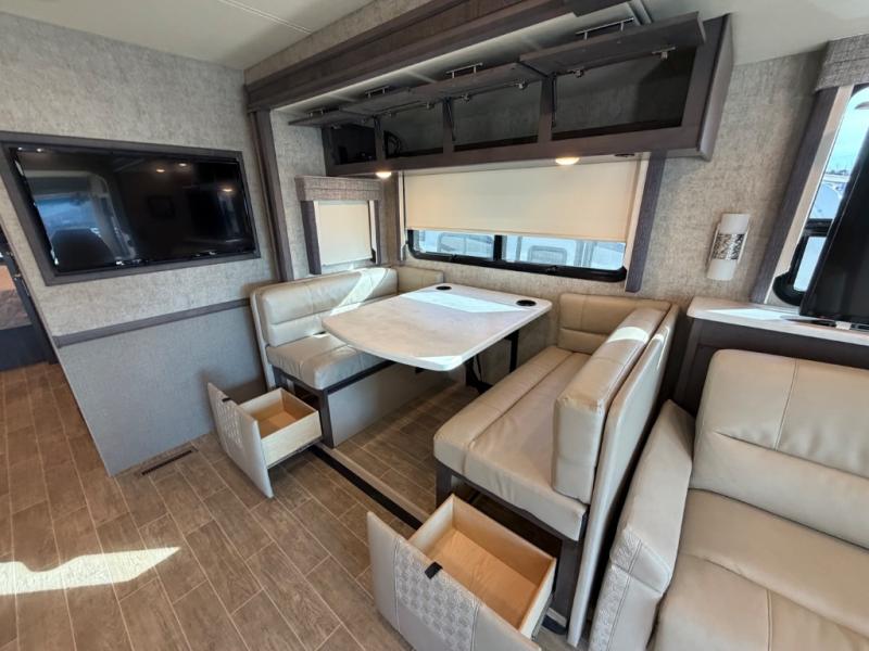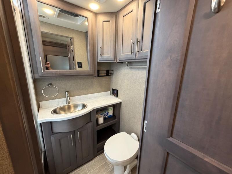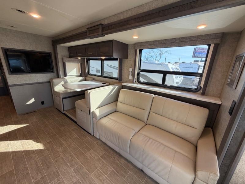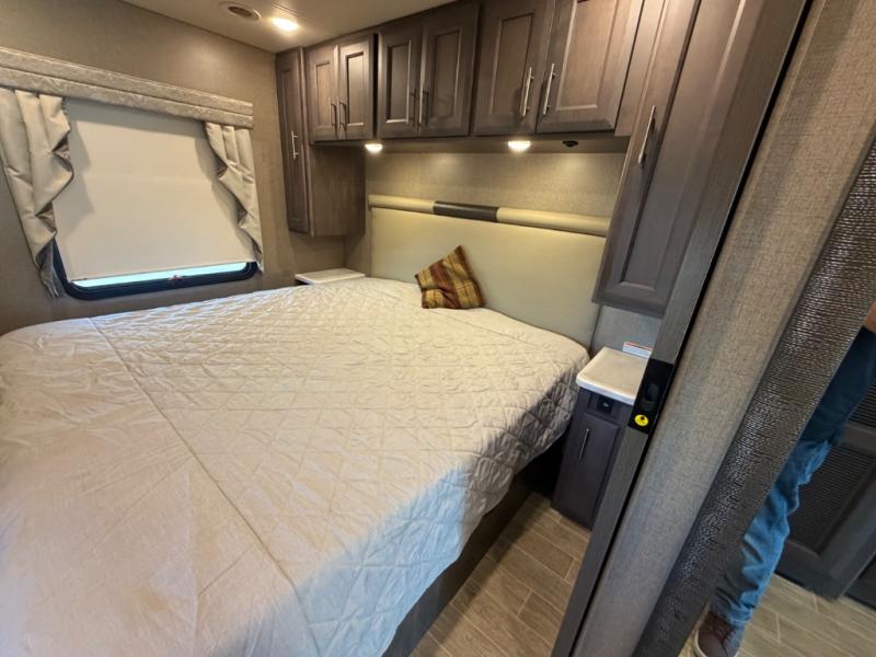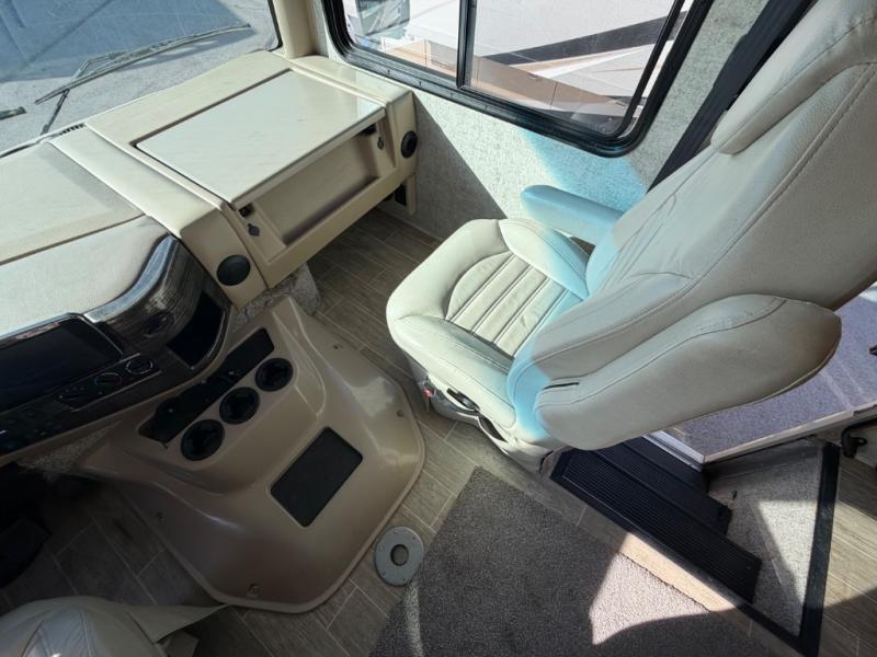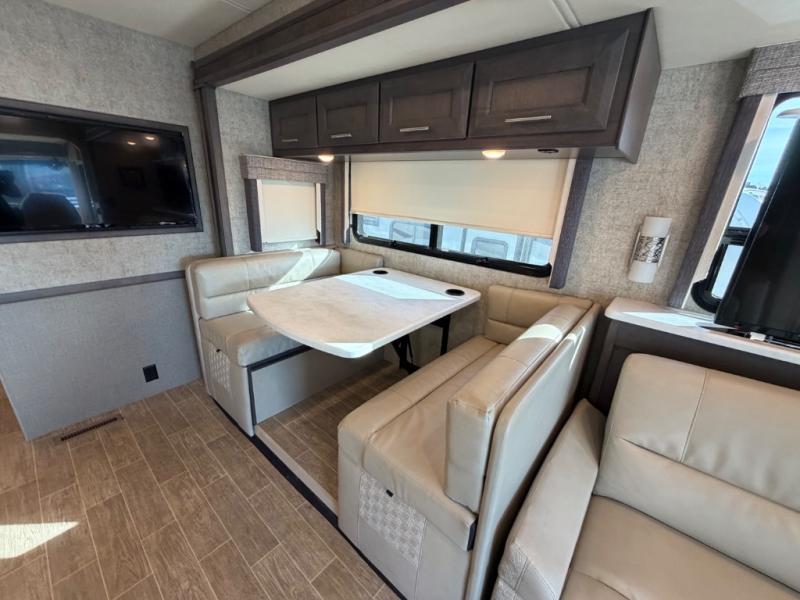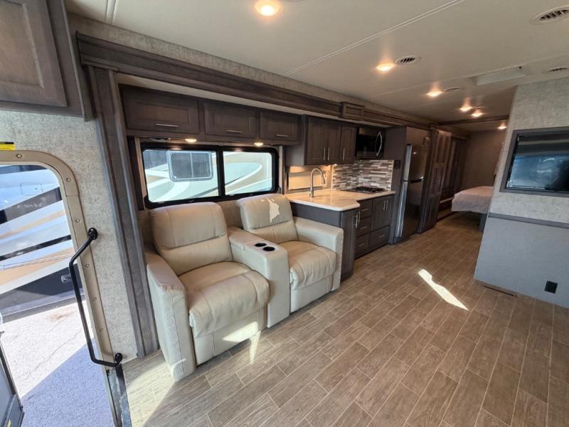 With each Miramar Class A gas motorhome by Thor Motor Coach, there is a welded tubular steel floor with welded tubular aluminum roof and sidewall cage construction, plus a crown roof, and one-piece fiberglass front and rear caps to mention a few features in the construction of each coach. The driver will appreciate the 10.1" touchscreen dash radio with Bluetooth, Axerra navigation and is SiriusXM ready, plus the steering wheel audio control, the back-up monitor, and the heated/swivel leatherette captain's chairs. The interior offers a 7-foot tall ceiling height for spaciousness, residential vinyl flooring for easy care, solid surface kitchen countertops for style, USB charging ports in the bedroom and living area to keep the electronics charged, and RapidCamp+ multiplex wiring control system, plus so much more making traveling and scenic detours that much more fun!