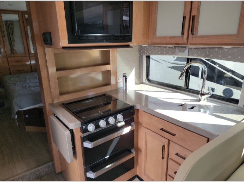 This Quantum Class C gas motorhome is a dream come true with a 70" Dream Dinette for you to enjoy your meals at comfortably, play a few card games, or even transform into an extra sleeping space. Across from the dinette is a 68" jackknife sofa to relax and unwind while you watch your favorite movie on the 39" TV above the dinette. The flip-up countertop next to the upgraded recessed three-burner cooktop gives you more space to create and serve your delicious meals. In the back, there is a king bed that welcomes you to a good night's rest, a large wardrobe to keep your clothes wrinkle-free, and a privacy curtain to draw at night. The rear corner bathroom has everything you will need to get squeaky clean each morning, and just outside the bathroom is an area prepped for you to add the optional washer/dryer so that you can extend your vacation even longer with clean clothes!