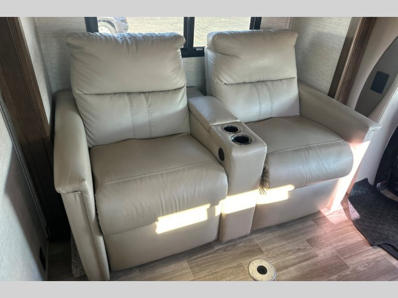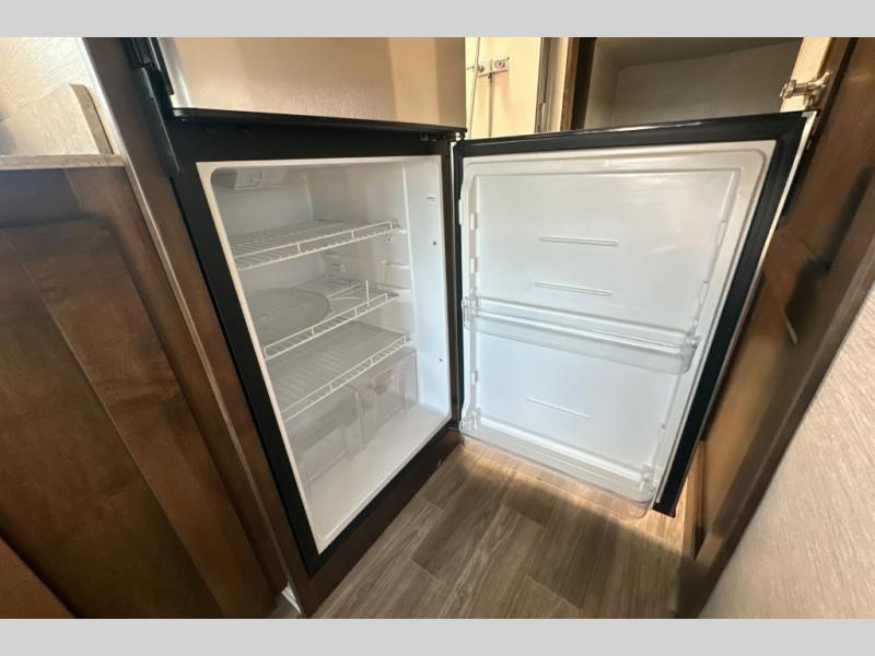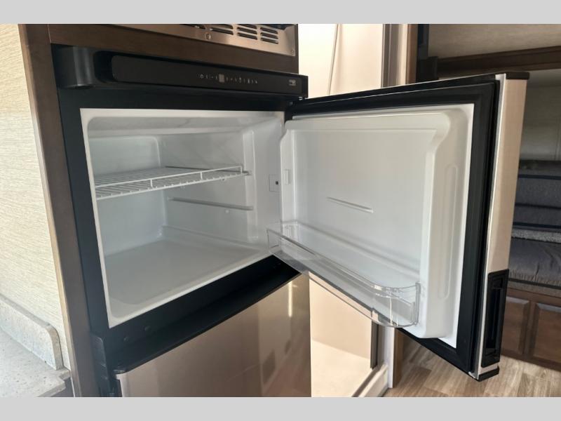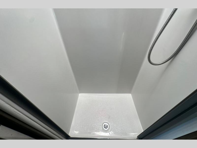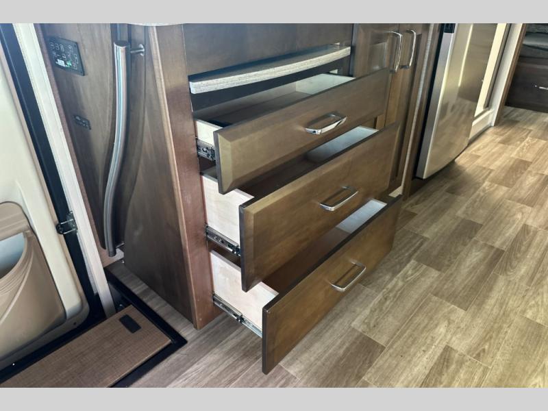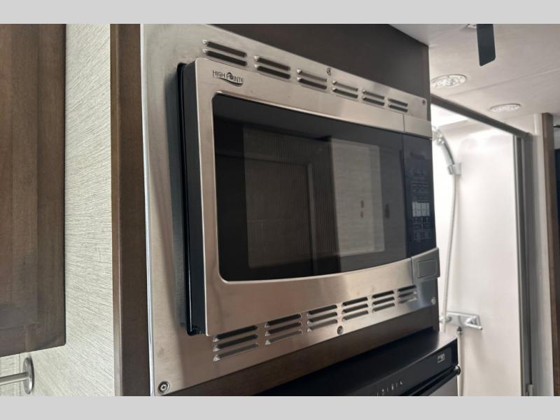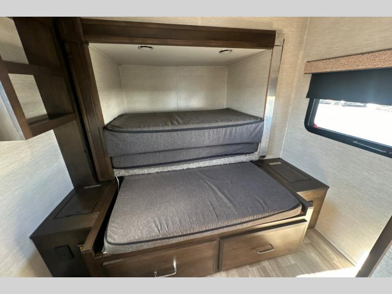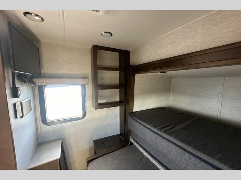 Get ready to travel in comfort with your favorite person in this perfect couples coach! Yet you can invite overnight guests to join you thanks to the extra sleeping space on the bunk over cab and the dinette slide out with drawers below the dinette seat. However, you might decide to choose the option of adding an entertainment center over the cab which would replace the bunk. The galley kitchen has everything the cook will need including a convection microwave above the fridge. The split bathroom is convenient when two are trying to get ready at once, and the rear bedroom gives you a unique slide out queen bed that provides more floor space to walk to the wardrobe and nightstands. There is a exterior TV option as well, take a look!