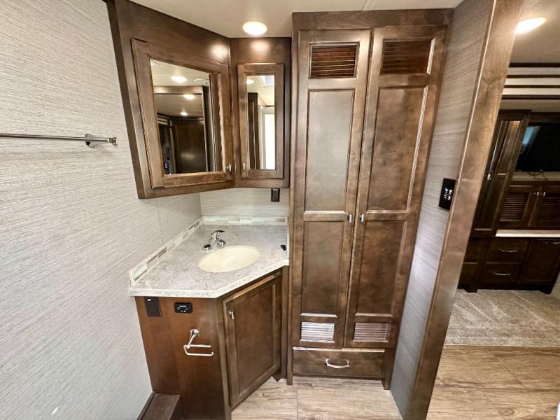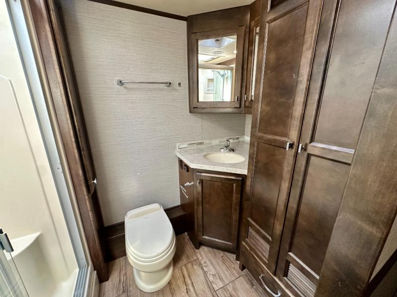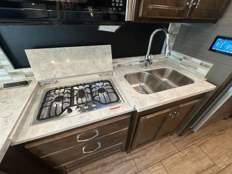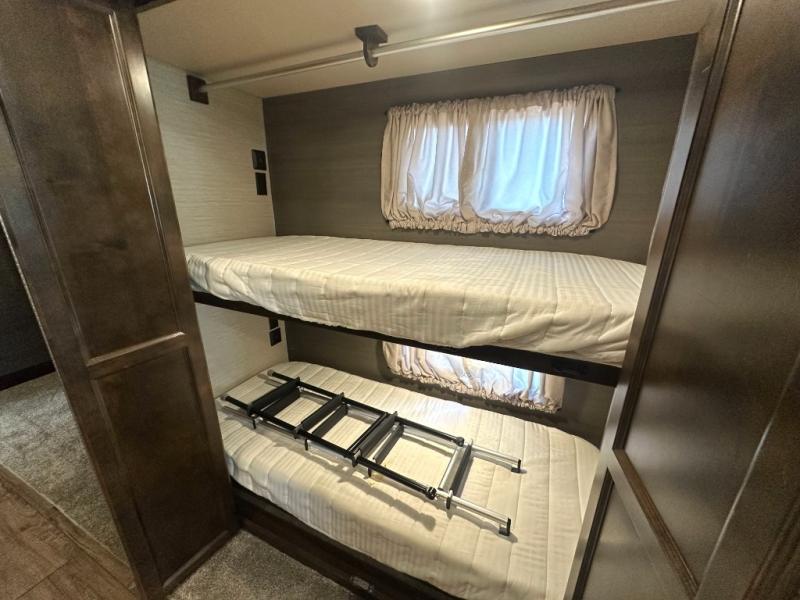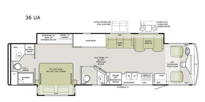 You can bring along the whole family with plenty of seating and sleeping options for everyone between the set of bunk beds, the 72" x 80" king-size memory foam mattress, the sofa bed which can be switched out for the optional Ultraleather air coil sofa bed, and the booth dinette. You can even add the optional drop down bunk in the front if you have more guests come along. If you need to get some work done while you're away then adding the optional dinette with computer workstation in place of the booth dinette is what you need. And with a bath and a half, getting ready each morning will be easier than ever.